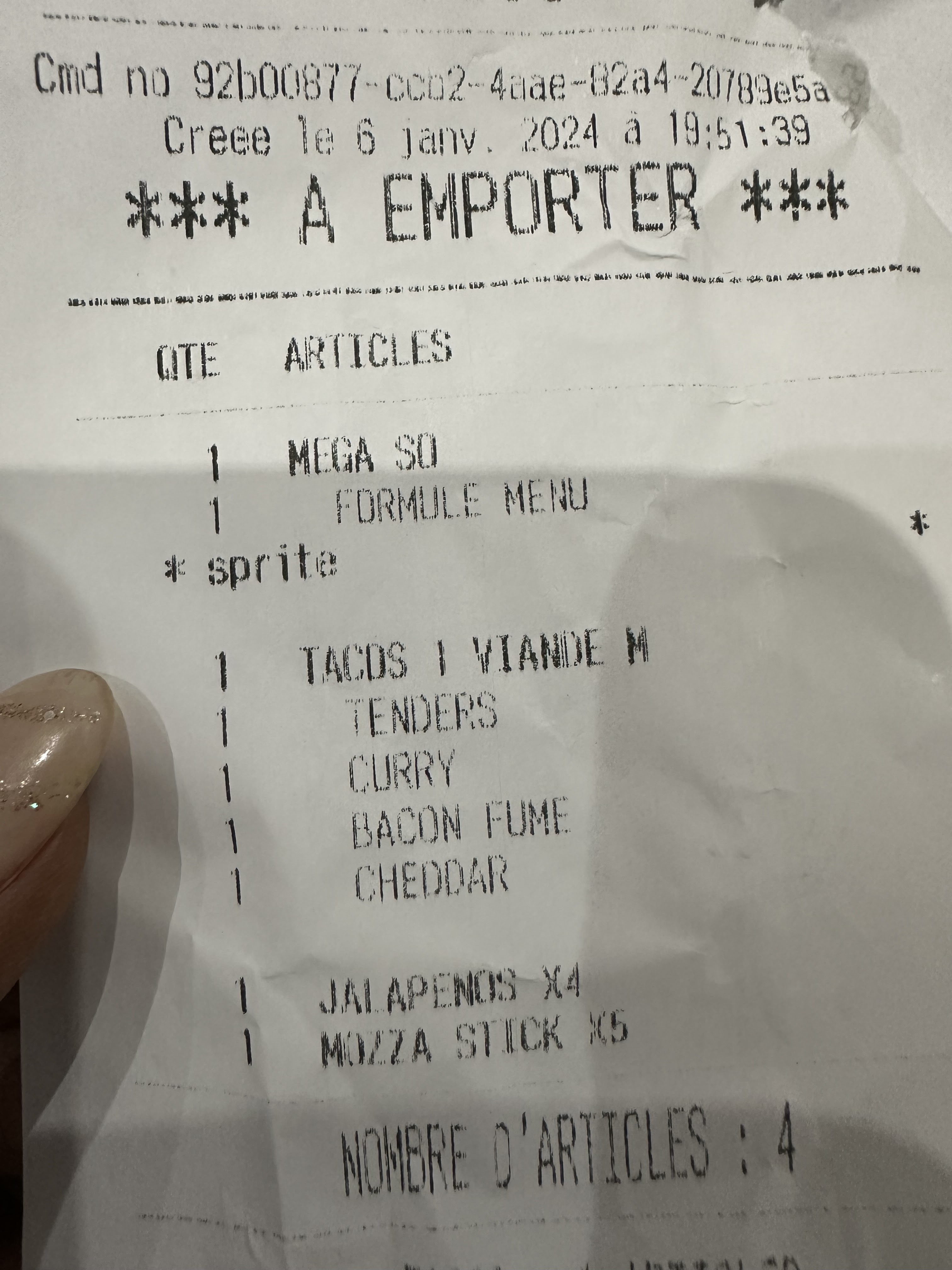 La nourriture est très bonne, mais la livraison à domicile est mauvaise même très mauvaise. Cela fait trois fois que je passe une commande pour me livrer chez moi et sur chaque commande que je passe il manque toujours quelque chose la première fois le dessert , la deuxième fois les nuggets et Une fois de plus Ce soir J’ai commandé un tacos avec supplément Cheddar et bacon surprise je paye le supplément comme à chaque fois et comme à chaque fois je n’ai pas ce que j’ai demandé!!!! 🤦🏻 J’ai dit à mon mari de vérifier la commande car J’étais sûre qu’il manquerait quelque chose, et là surprise il découvre qu’il n’a pas eu sa boisson Au moment où le livreur était entrain de partir le livreur lui en a fournis une mais ce n’était pas ce qu’il avait commandé Je trouve ça quand même fatiguant faite franchement attention 😫 payer pour ne pas recevoir ce qu’on n’a commander c’est pas cool du tout On ne passera plus commande, c’est dommage car comme je l’ai dit la nourriture est très bonne.
