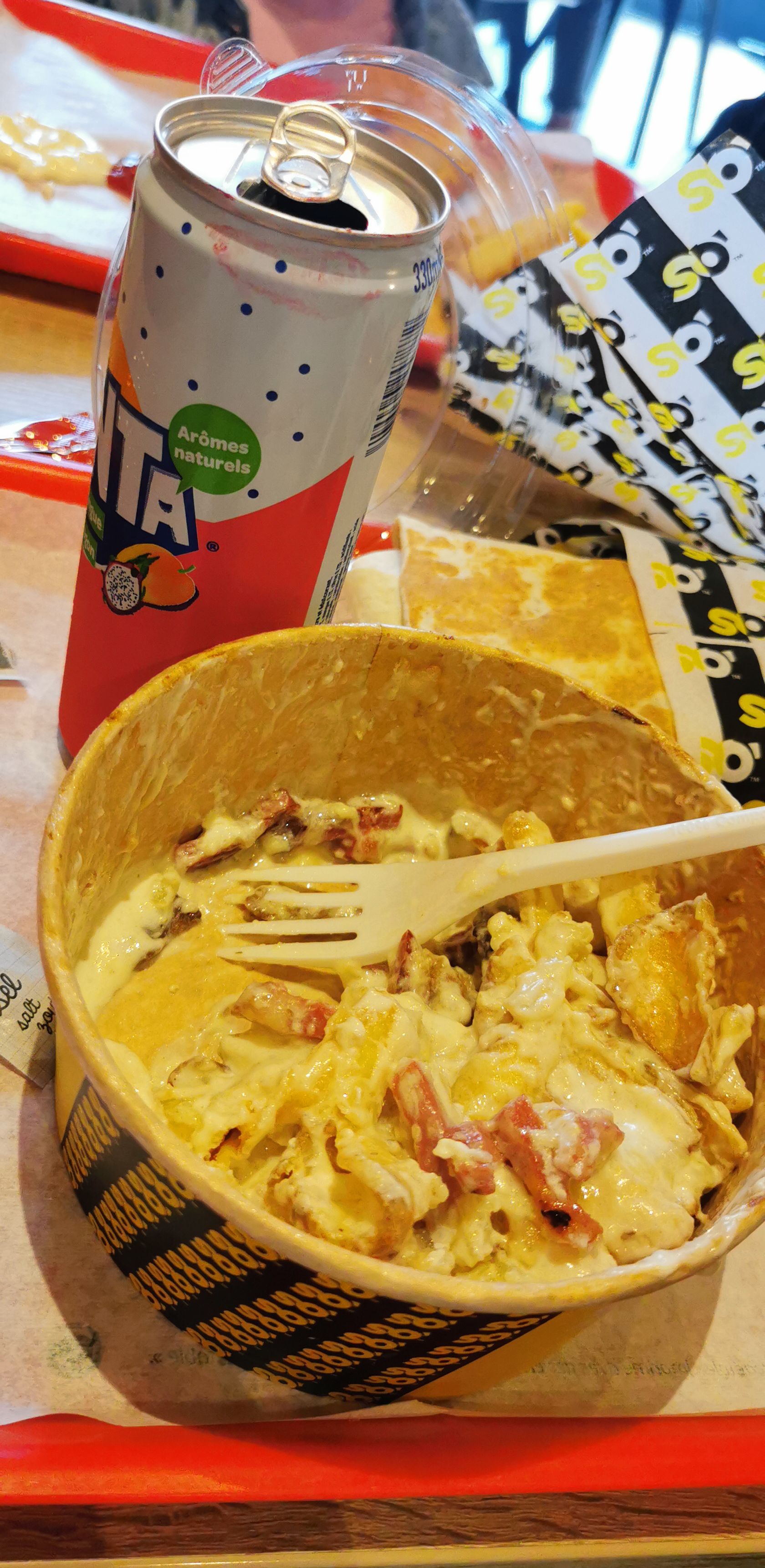 Il y’a quelque mois j’aurais mis 6/5 étoiles car la qualité, le service client et le rapport qualité prix était là. Malheureusement ce n’est plus le cas et ce fast food ne fais que de ce détériorer. Injoignable par téléphone, ils ferment à leurs bon vouloir et ce sans même prévenir, ne prennent pus la CB.. Les tacos ne sont plus bon du tout il y mettent des potatoes et plus des frites. Celui que j’ai commandé la dernière fois était tout sec malgré que j’ai demandé beaucoup de sauce. Que de la déception, et si vous commander sur togoodtogo (appli anti gaspi) ne vous faites pas avoir ! J’ai commandé un panier et je devais récupérer ma commande à 1H du matin, sauf que la bonne blague c’est que c’était fermé ! (Super de se déplacer pour rien et aussi tard en plus). Bref je vous conseille vivement de préférer un fast food fiable, tout le contraire de so food. C’est bien dommage car j’y allais vraiment souvent mais à partir de maintenant je n’y retournerai plus.