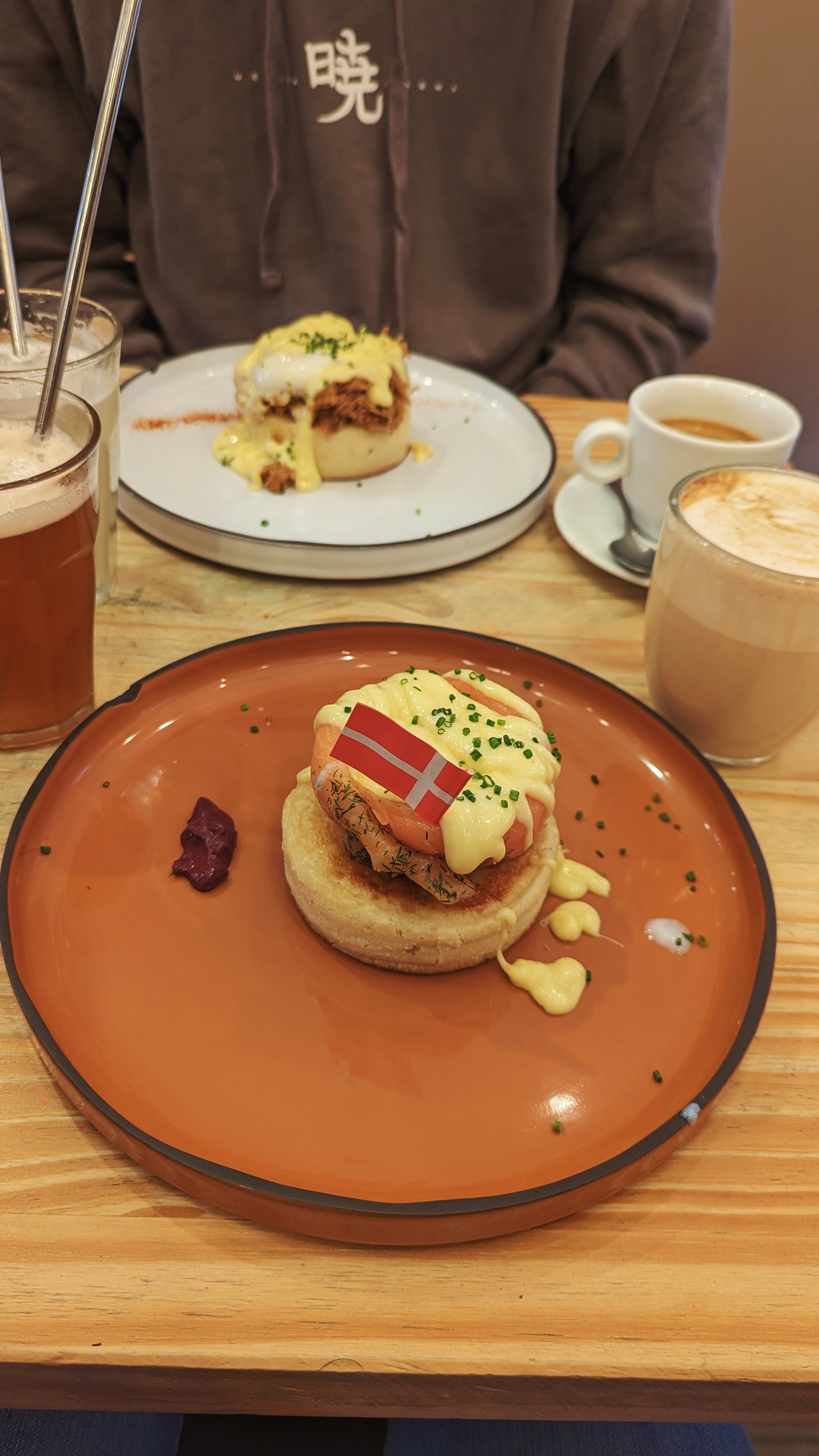 Je suis venu pour un brunch en couple sans une seule connaissance en cuisine danoise. Nous avons été agréablement surpris par la diversité de la carte et de l’originalité des recettes proposées. Après avoir écouté les explications de la serveuse nous avons opté pour les æbleskiver, une sorte de petite brioche à la cardamome accompagné d’une confiture, ainsi que pour le smoothie bowl,Très bonne surprise ! Ensuite nous avons pris un pancake chacun, celui de noël ainsi que le carnivore. C’était exquis ! Très copieux et généreux