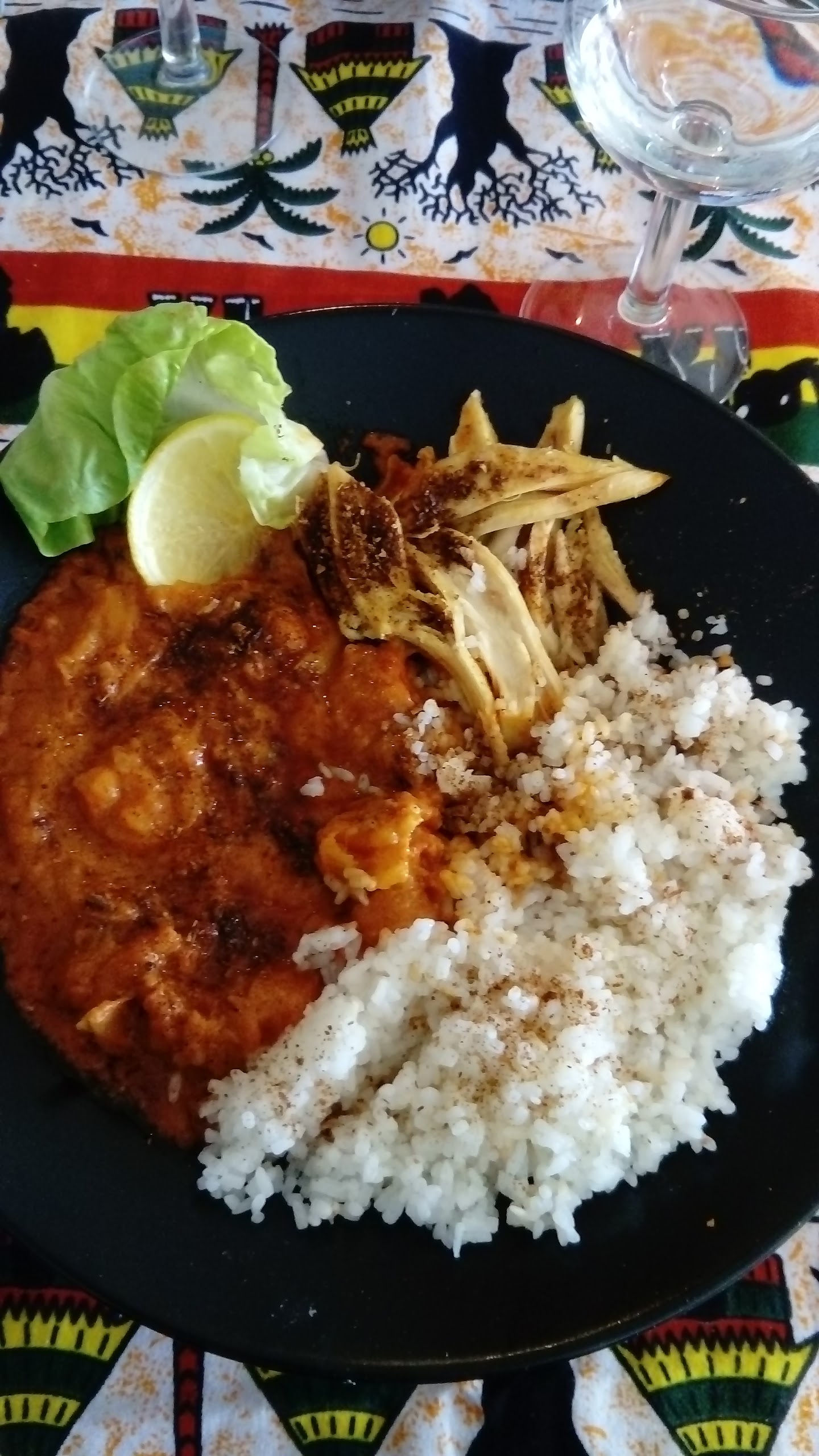 Les accras de morue excellent, on s’en bien la chaire du poisson avec la sauce piquante !! ( moi qui manque pas trop piquant, alors la je me suis bien re-servie ), le plat l’assaisonnement des épices parfait, la cuisson du riz concassée super ! Le jus de bissap il est super bon ! 🤤 La petite épicerie pour ceux qui veut acheter des produits africains j’adore. Très bonne trouvaille sur les sables d’olonnes.