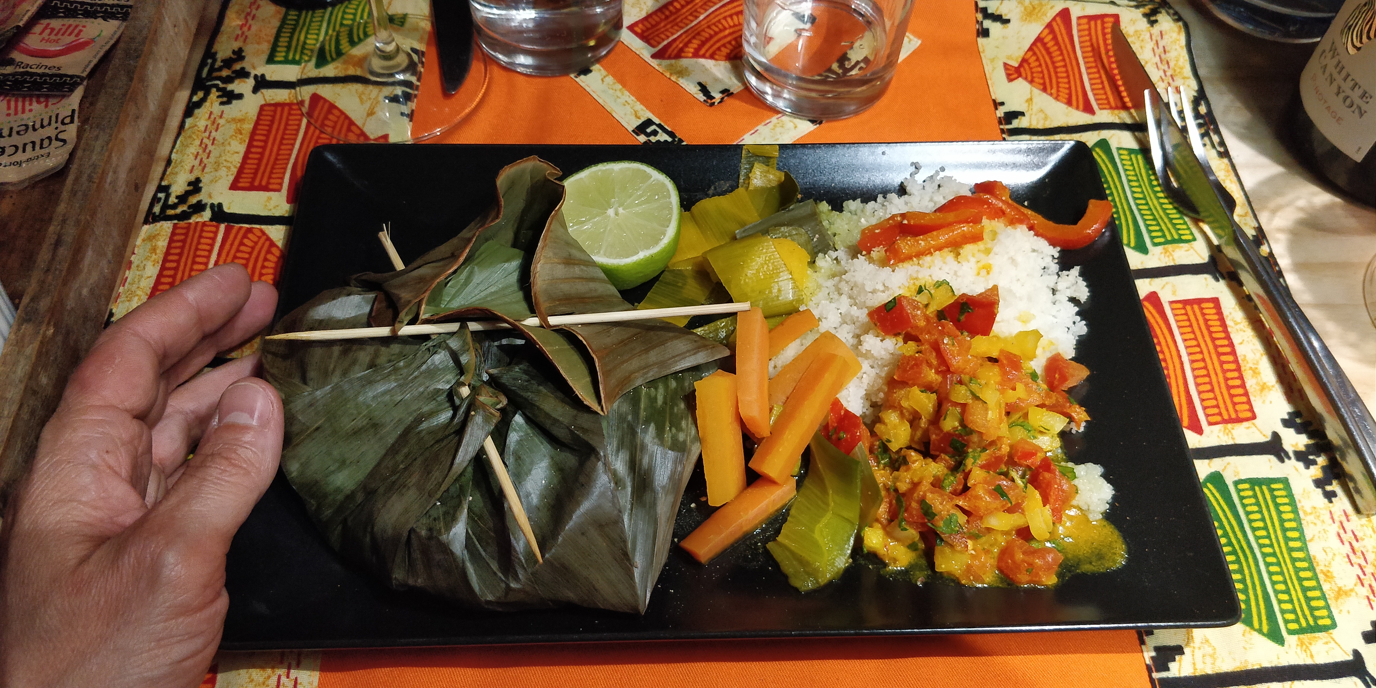 Toujours aussi délicieux , en apéritif nous avons bu un yoyo gimgembre ,ananas et rhum un delice Mafé poulet et poisson cuit dans une feuille de bananier succulents Je recommande fortement