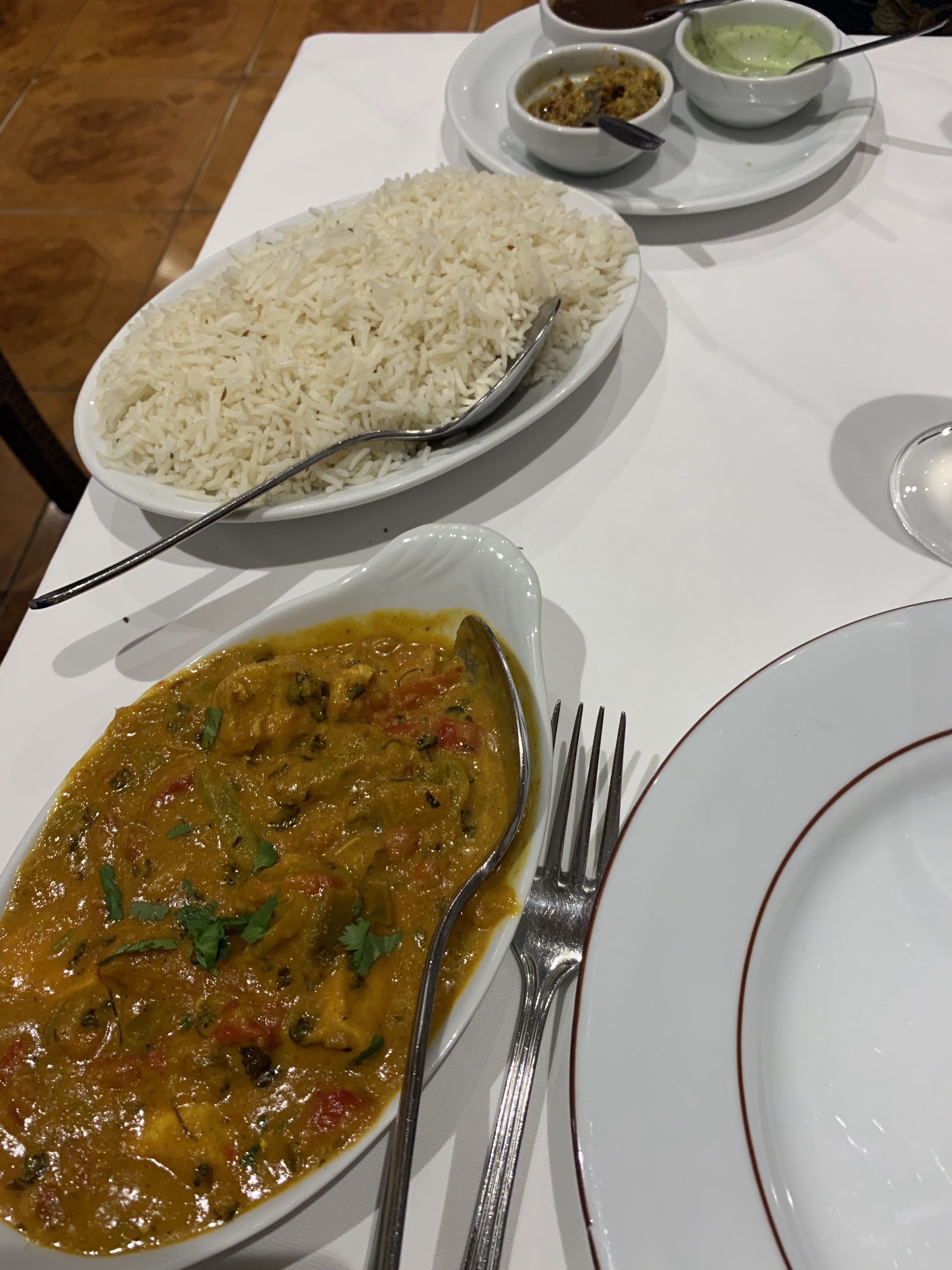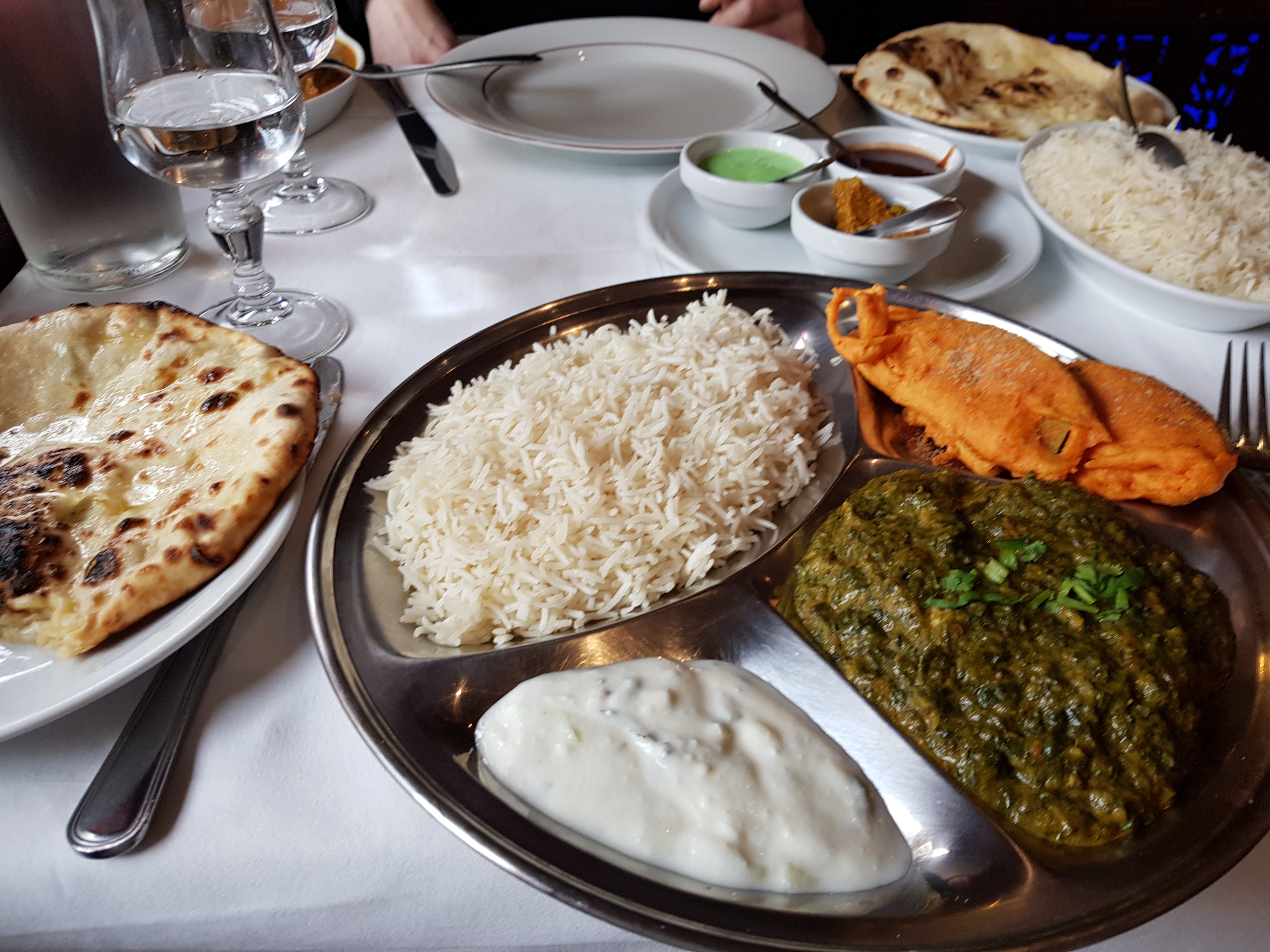 Très bons plats !!! Oignons Baja... Les meilleurs qu'on ai mangés ! Nans fromages délicieux. Lassis parfaits. Poulets et crevettes curry parfaits. Poulet coco : parfait !! C'est bon ! C'est copieux... Et ils ne poussent pas à la surconsommation car pour le riz le serveur nous a conseillé de prendre 2 riz pour 5 et de recommander ensuite si besoin... Or ça a suffit !!! JE RECOMMANDE VIVEMENT !!... Top 2 de tous les Indiens que nous avons essayé !... Et nous en avons essayés...