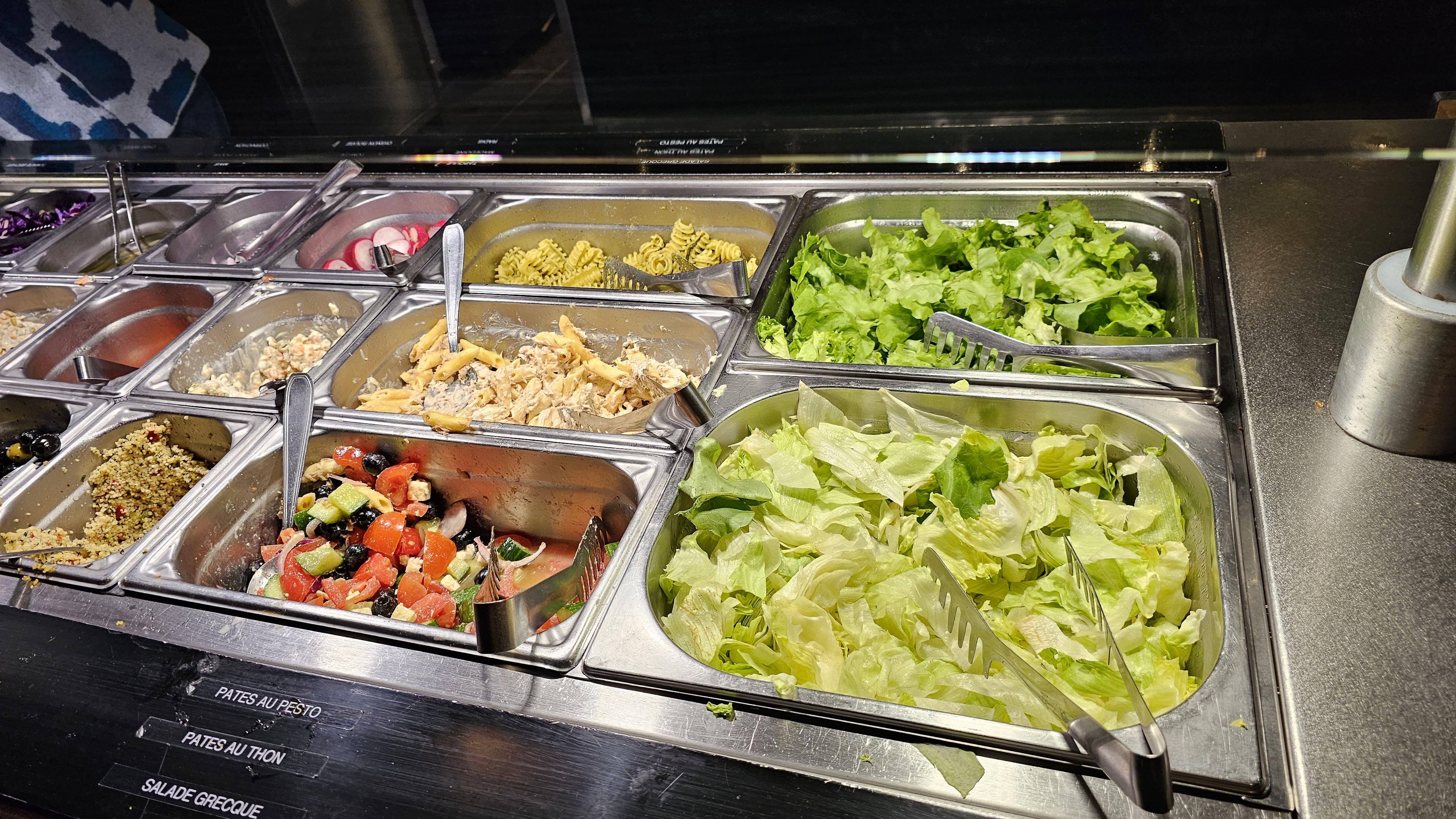 La salade en fin de journée n'était plu au top. Les pâtes et pâtes à pizza sont quand à elles très bonnes, les garnitures sont multiples, beaucoup de diversité dans les desserts bien que j'ai moyennement aimé la plupart, le thé pêche est bon bien que trop sucrée. Le cola n'est pas bon du tout. Pour le prix, je valide !