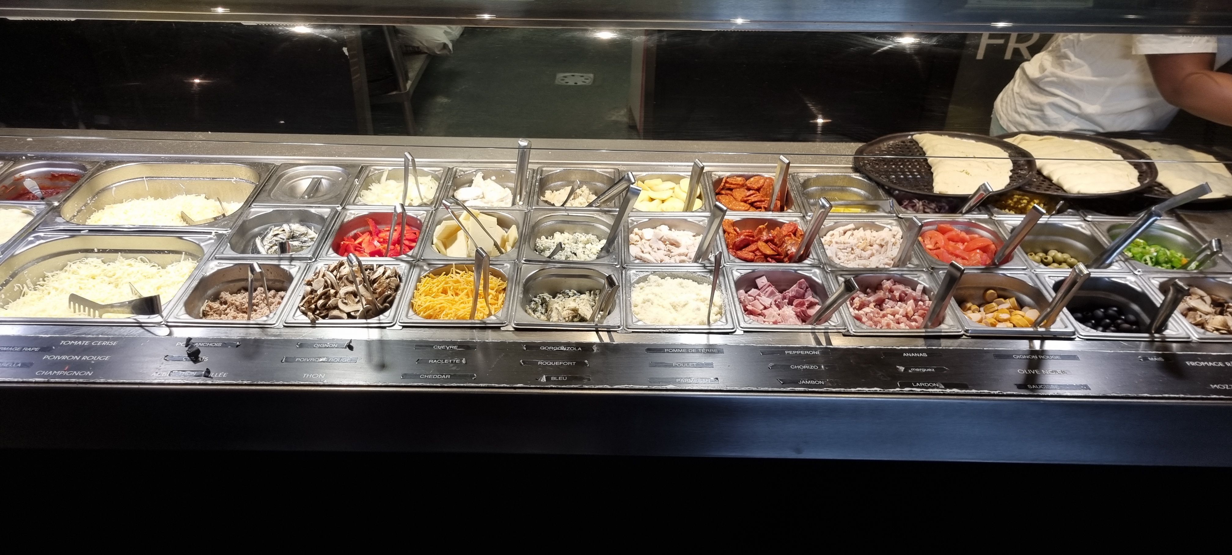 Le concept est intéressant, en revanche les aliments ne sont pas de qualité et la fraîcheur n'est pas au rendez-vous. Ma pizza n'avait au final pas vraiment de goût.Les légumes ne sont pas fraîchement coupés et ne sont pas appétissants, salière vide, huile pimentée vide..bref certaines négligences viennent gâcher l'expérience .