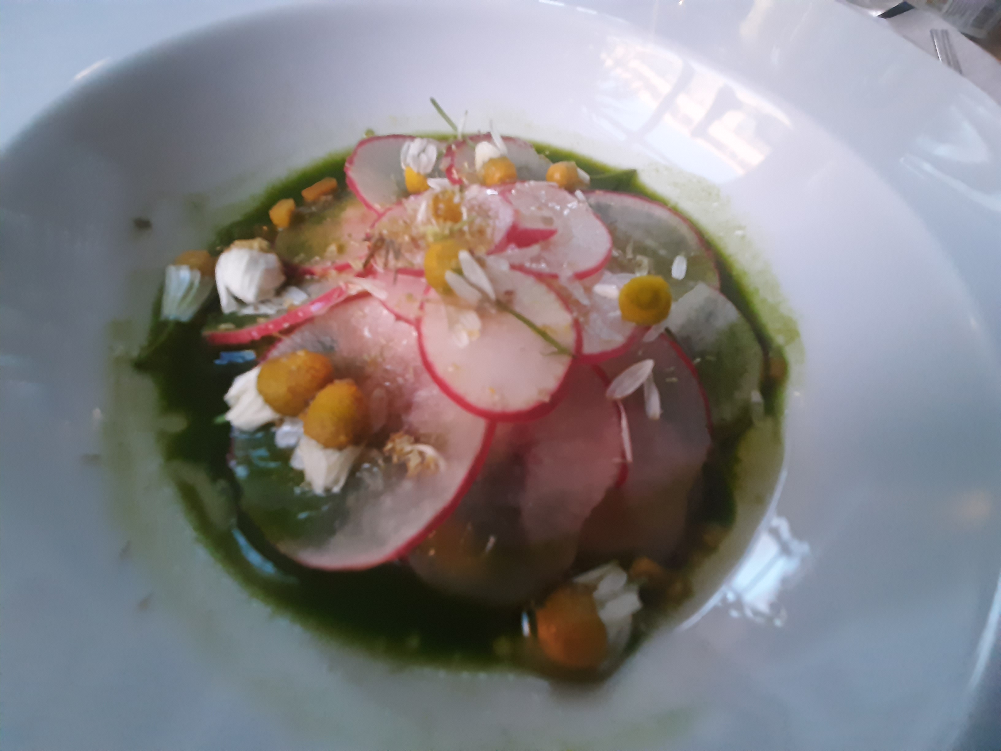 Belle expérience, sauces appréciées. - Radis / raifort / olives / cannelle - Pluma ibérique / fève / ail des ours / lait ribo - Choux fleur / vanille / noix de cajou - Chocolat / mascarpone / fleur de sel / Bailey's