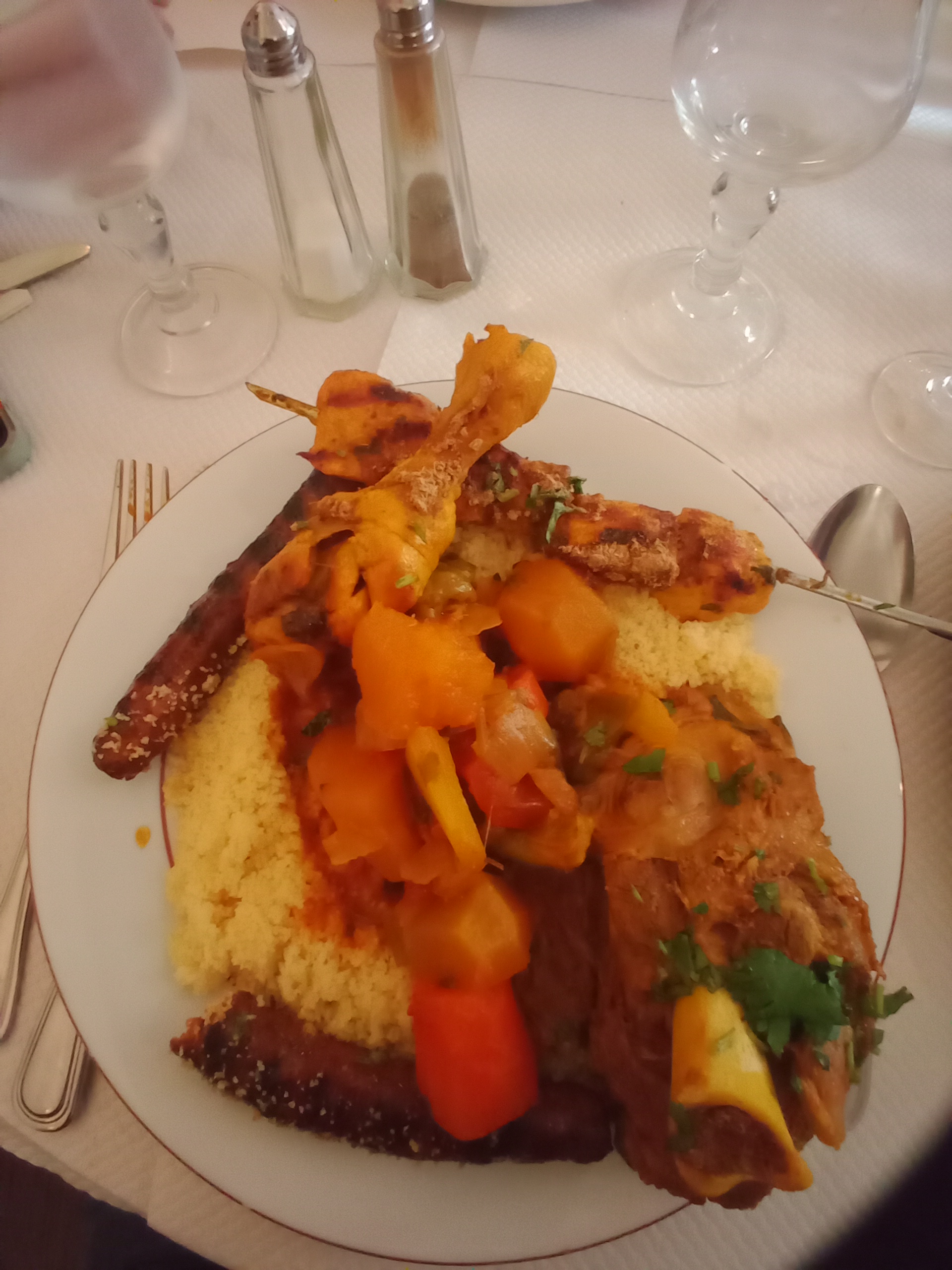 Le couscous méchoui est un véritable régal, une vraie tuerie ! La viande est extra tendre, savoureuse, servie en quantité. Le vin était très bon également. Le serveur est très très sympa, attentif et discret. Bref, nous avons dîné dans ce restaurant 4 où 5 fois et c'est toujours un régal. Établissement à recommander les yeux fermés. Excellent rapport qualité /prix