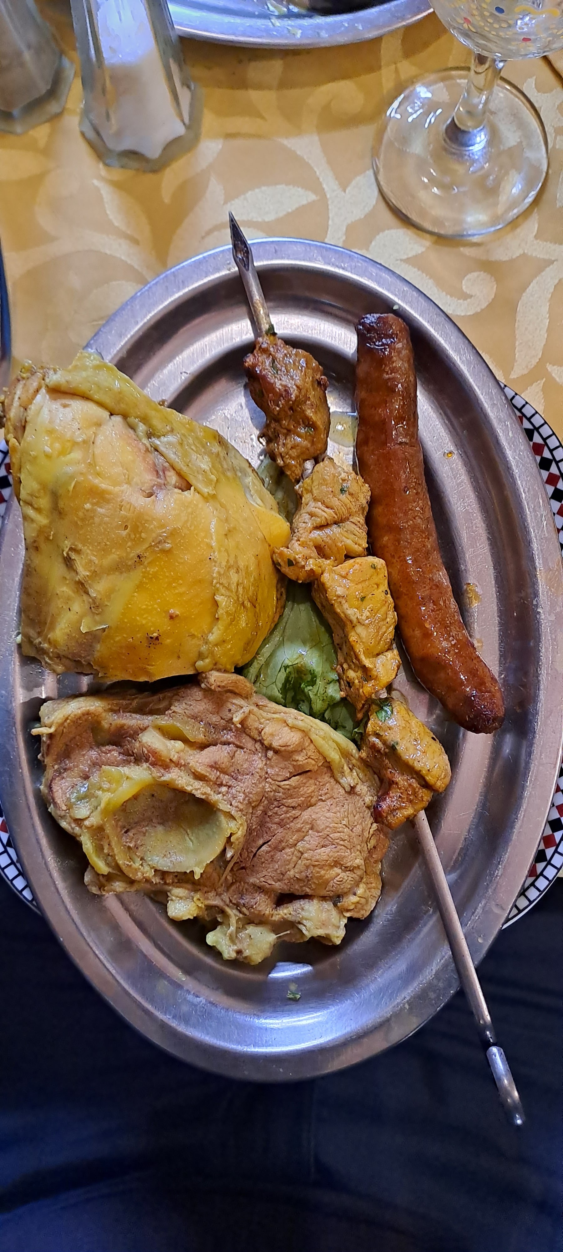 Décor sympa coucou : le bouillon manque un peu d'épices typiques les légumes très bien, brochettes agneau bien, mais l'agneau bouilli un peu fade mais surtout pas assez cuit et manque de moelleux