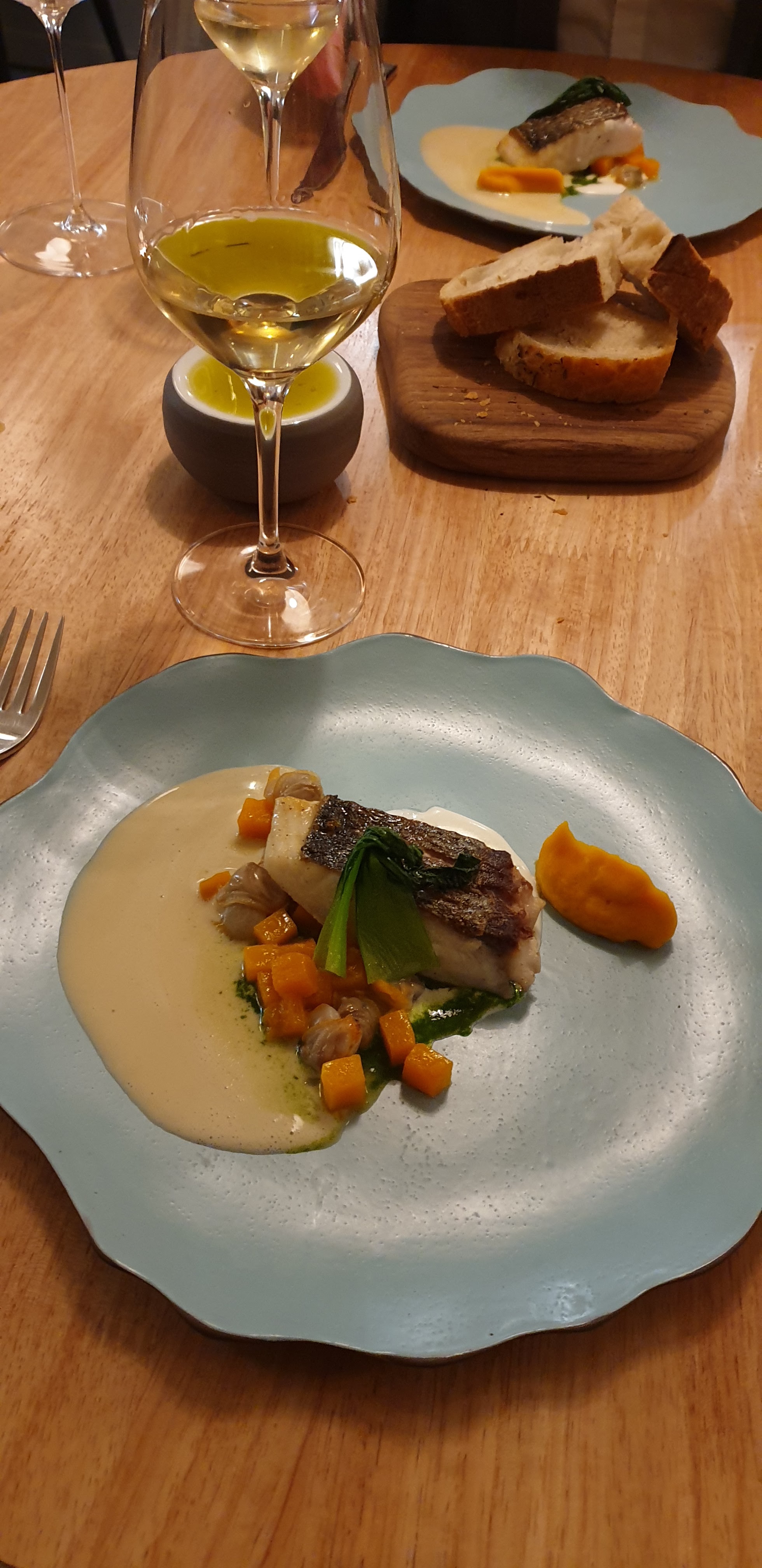 Une cuisine sublissime, tant par le visuel que par le goût... Nous avons opté pour le menu surprise à 4 temps et nous nous sommes régalés du début jusqu'à la fin, des mises-en-bouche aux mignardises, en passant par cette dégustation d'huile d'olive au goût incroyable... S'agissant d'un menu surprise, nous pensions manger entrée-poisson-viande-dessert mais nous avons eu 1 premier dessert à la place de la viande. Très légèrement déçus au départ, le niveau des desserts a vite fait oublier notre déception. L'accord mets et vin permet de decouvrir des vins originaux et délicieux. Nous avons passés un merveilleux moment en famille.