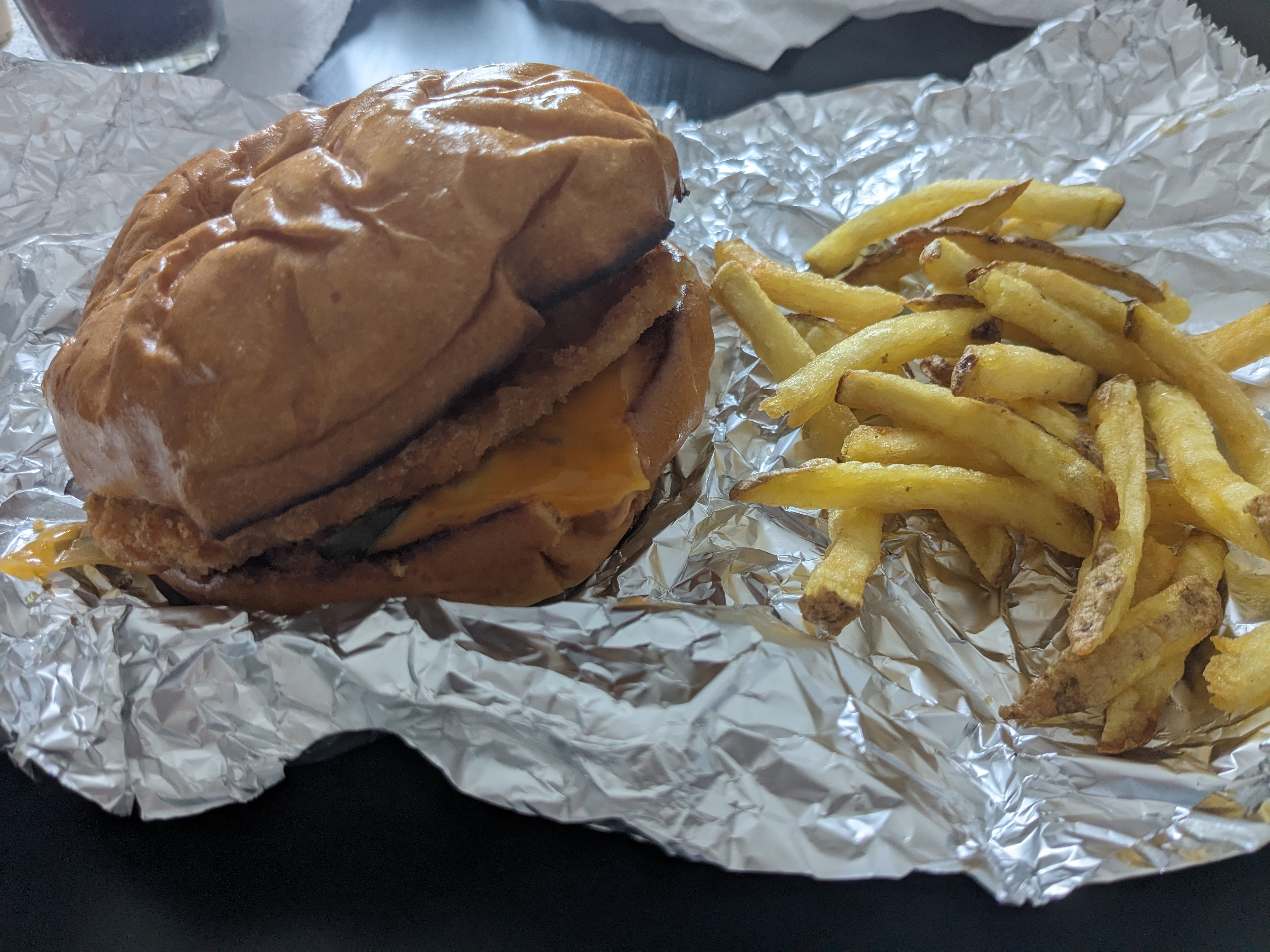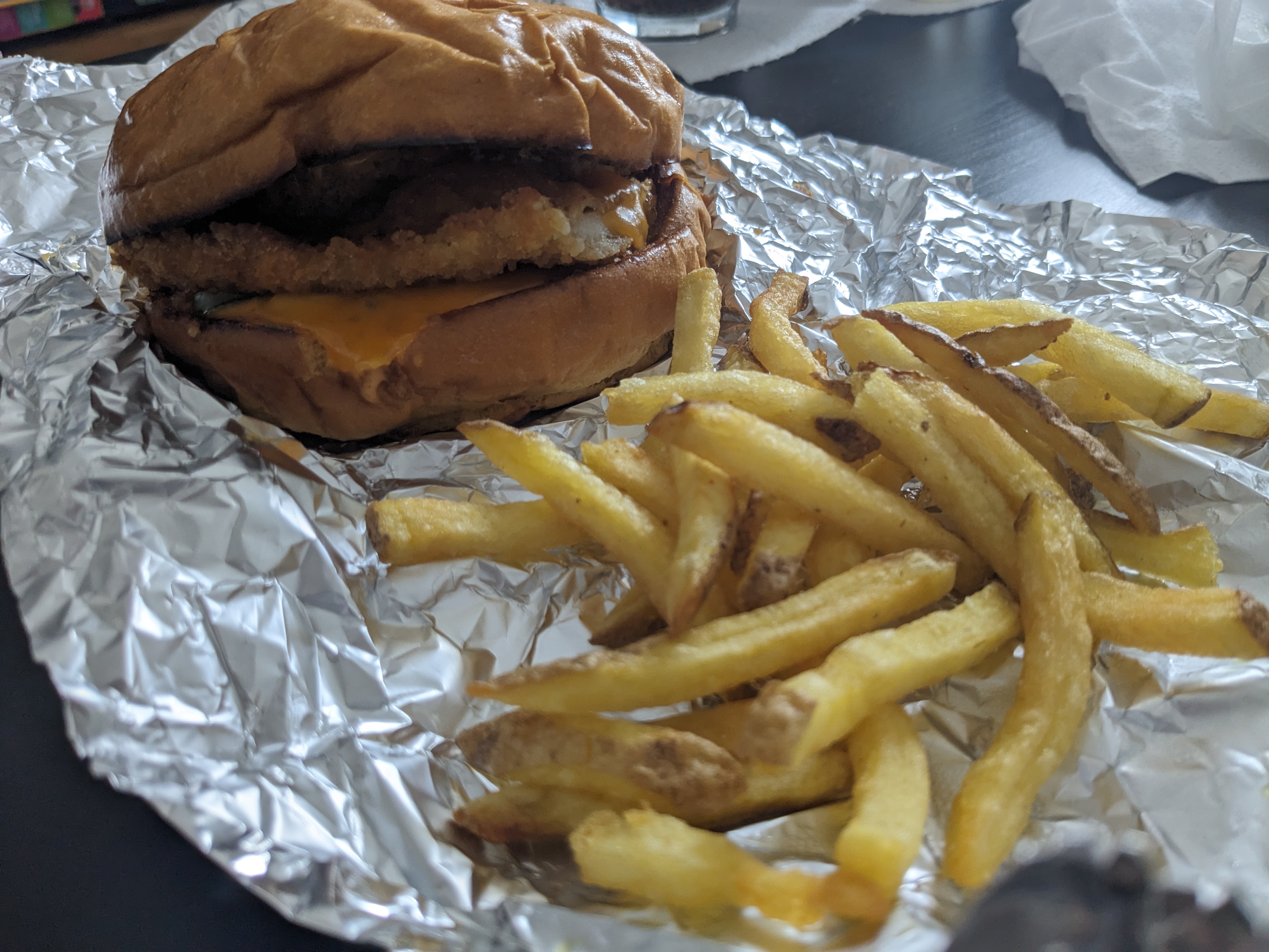 De bons burgers de cheat repas et des frites incroyables. Le poulet était un peu décevant et dommage qu'ils n'aient pas de boissons alcoolisées