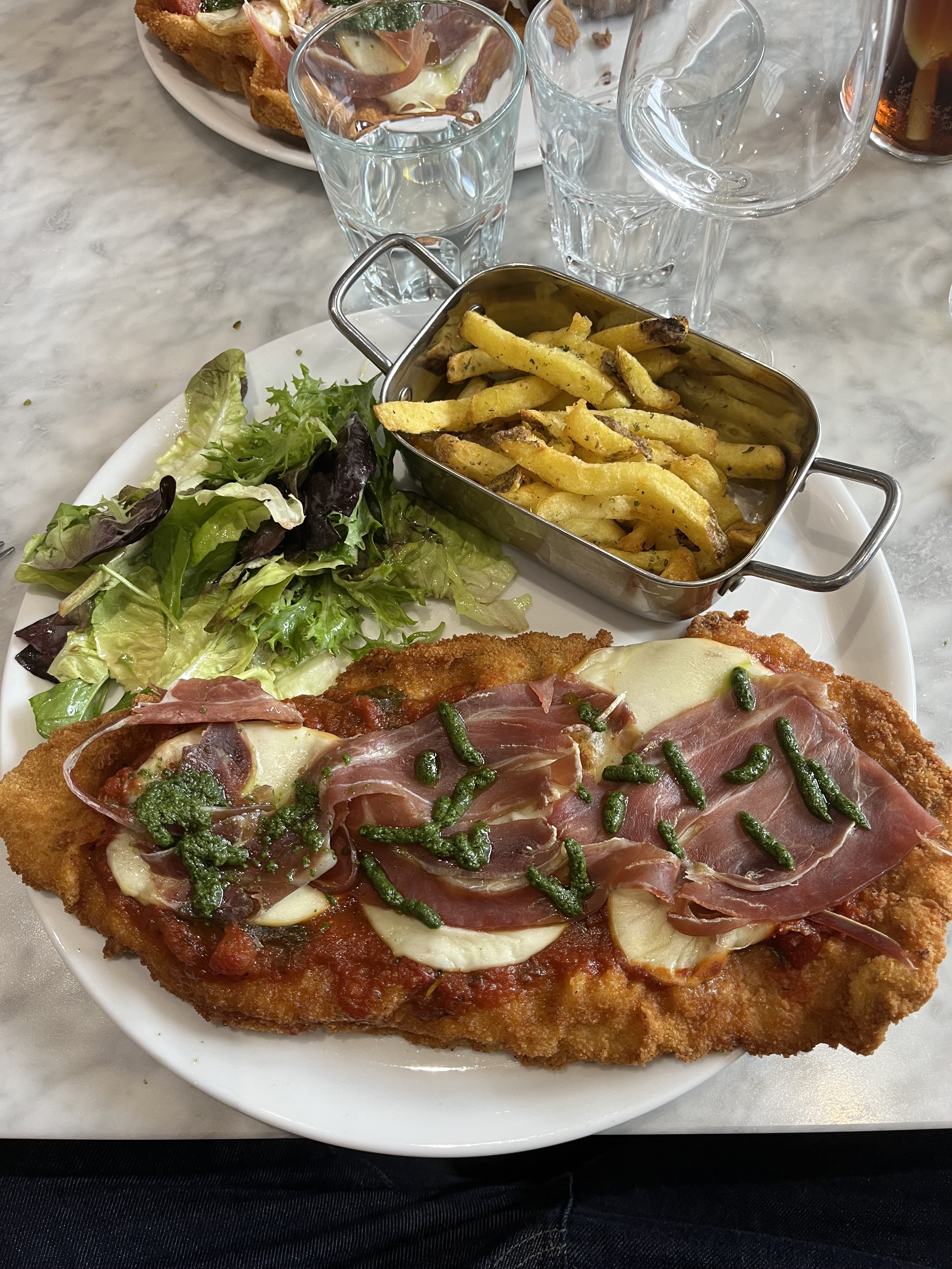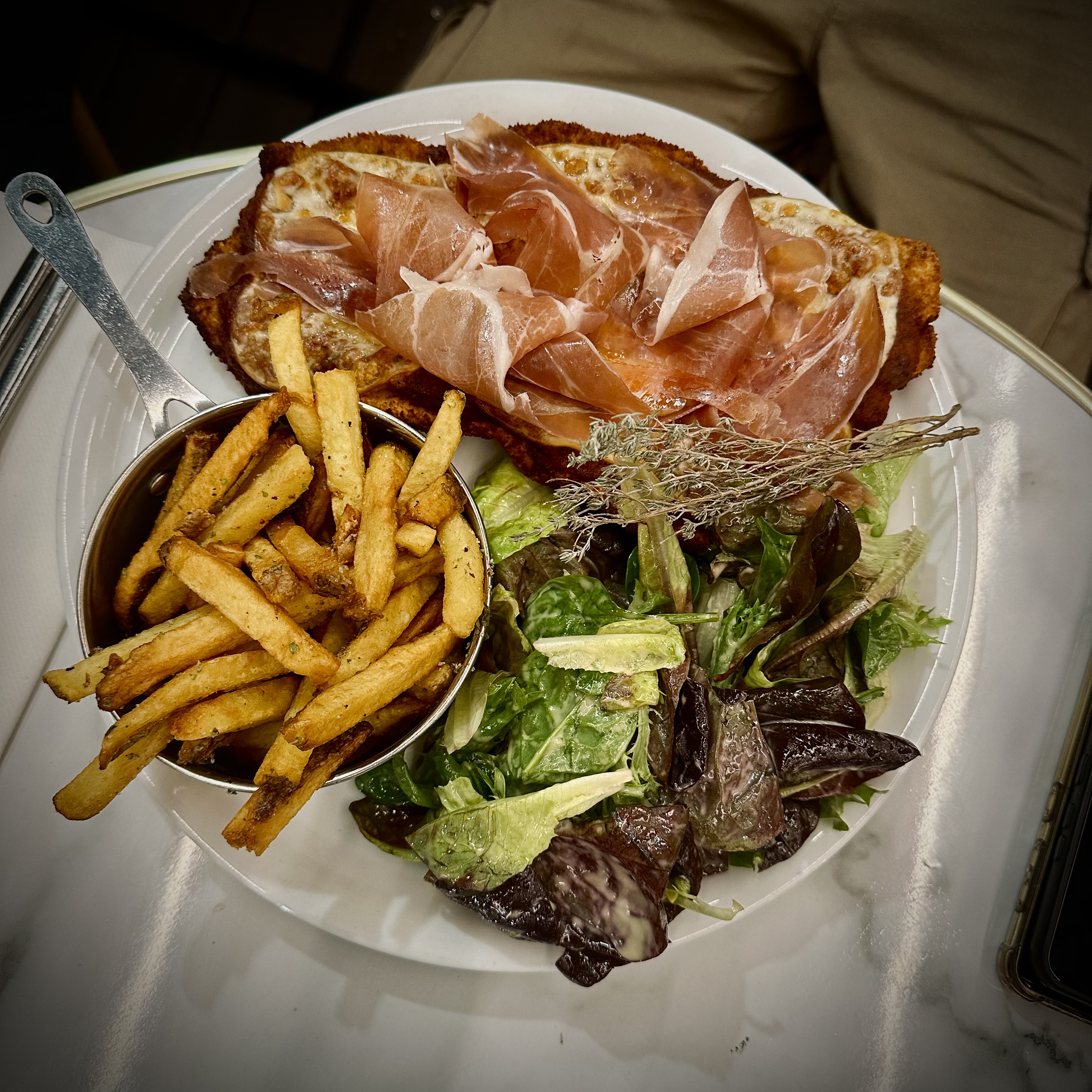 Très beau lieu, un beau cadre. Concernant le service rien à dire. Cependant mauvaise expérience avec l'escalope milanaise. Couleur de la viande rose à l'intérieur, la serveuse nous informe que la couleur de la viande est rose en temps normale. (Je doute de cette information...) Même après une deuxième cuisson celle ci étais toujours rose... Très déçu... Le dessert étais très bon. Prix assez élevé pour la qualité du plat.