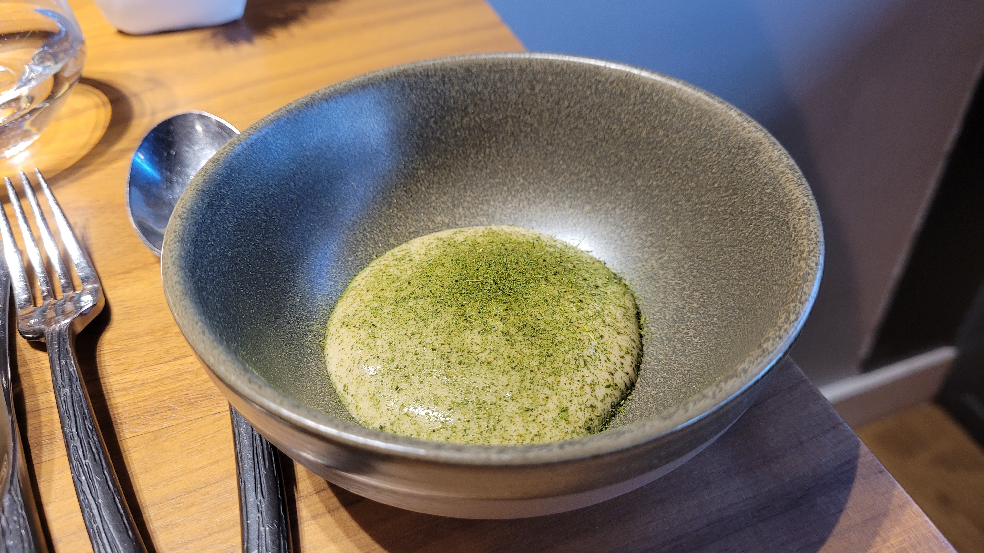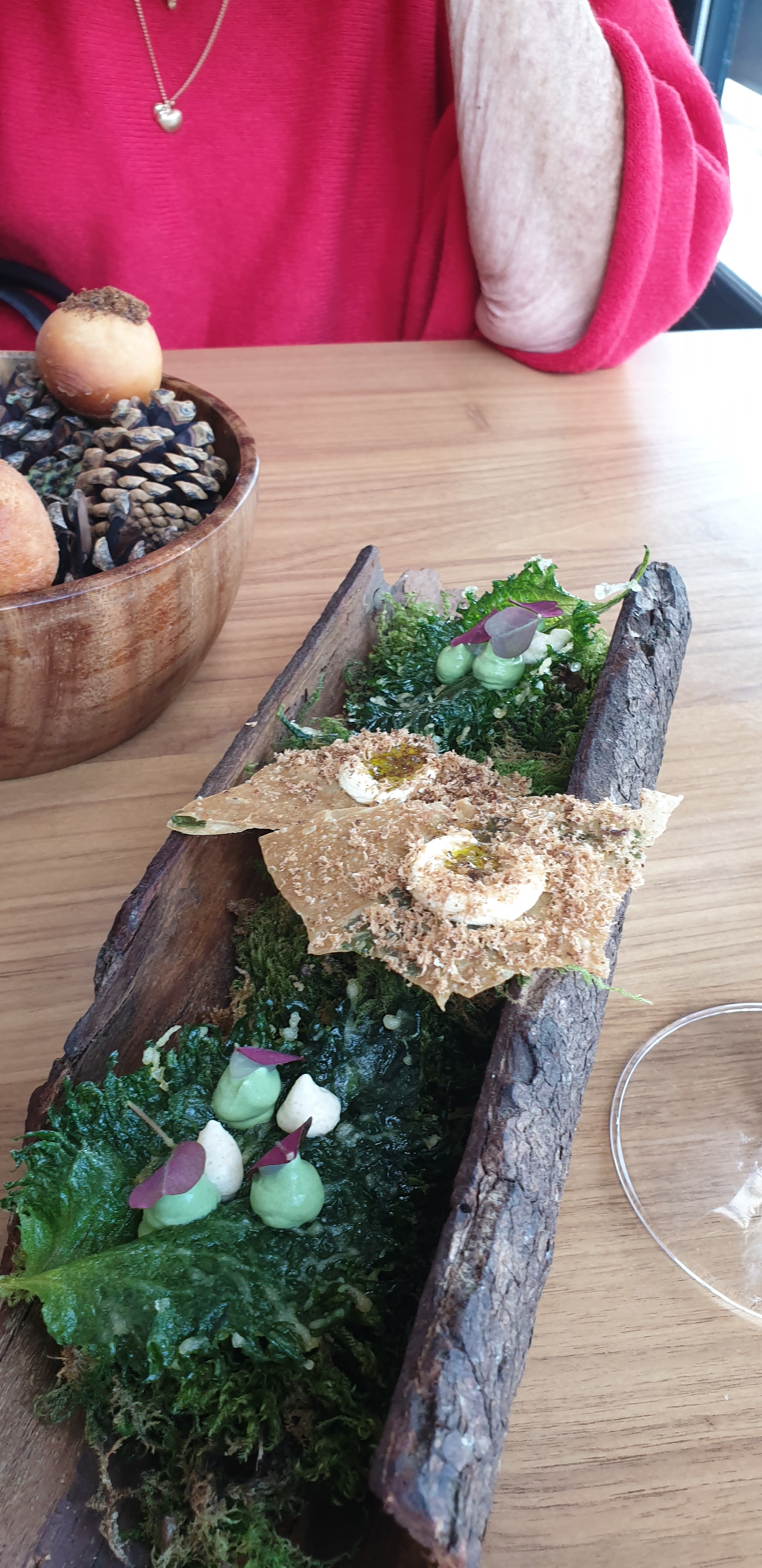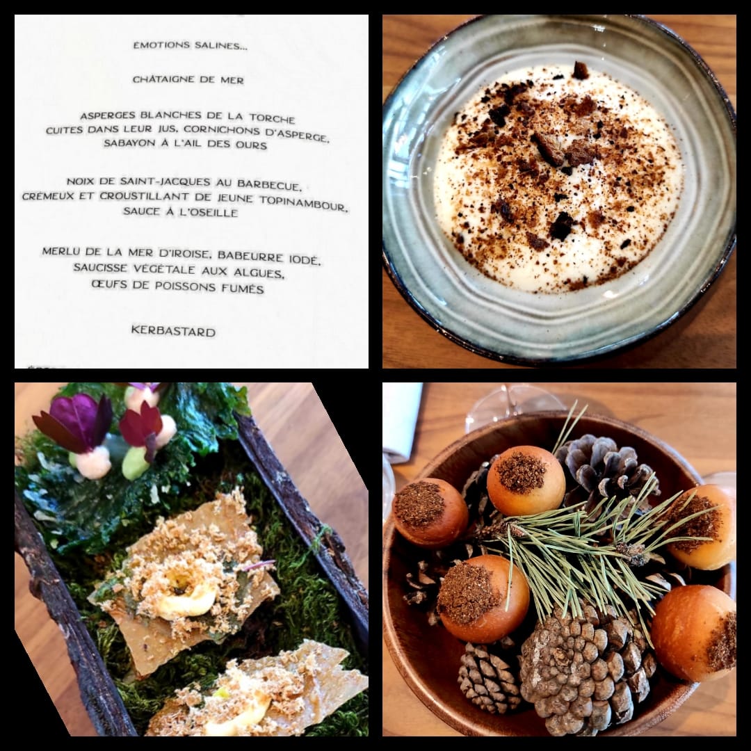Un voyage culinaire à travers le temps et l'espace d'une fluidité sans pareil. La terre et la mer se rencontrent et s'harmonisent au fil du chemin. Le choix des plantes ancestrales relient des goûts francs, bruts et prononcés de chaque élément mis en contemplations visuelles. Le choix des supports nous emmènent en pleine forêt du centre Bretagne aux sources du Scorff, puis sur les roches ardoisières et granitiques des mégalithes celtes, pour arriver vers cet océan sources de vie et ses céramiques évocatrices des crustacés. Merci, merci amplement pour nous rappeler nos sources. Claire et Thomas Le Glatin, apiculteurs aux sources du scorff