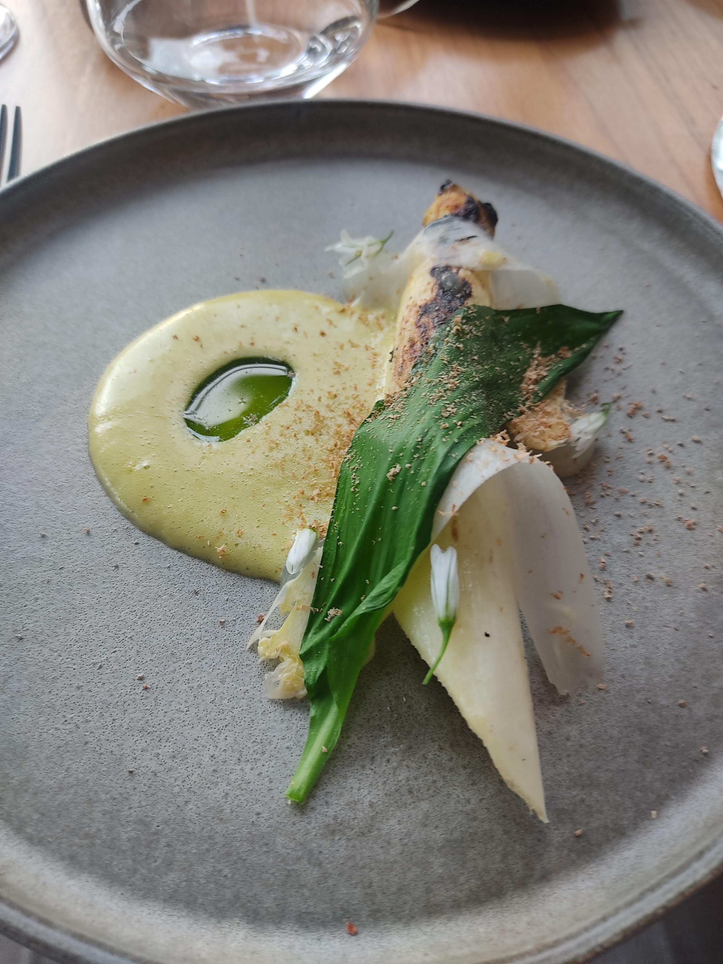 Rarement de passage à Lorient, j'ai pu la semaine dernière dîner dans ce restaurant qui m'était recommandé de longue date. (Propose une formule du midi (20-30€ il me semble) et un menu du soir à 33€, très abordable pour des plats de cette qualité). Occasion trop rare j'ai donc pris le menu Sources avec accord mets vins, de très belles assiettes qui s'harmonisent avec le vin entre force et rondeur. À chaque plat son explosion de saveur, et on fini avec une glace au fenouil très légère et tout aussi savoureuse. Quelques photos que j'ai pensé à prendre avant de terminer l'assiette. (Non exhaustif : oeuf parfait-champignons; asperge blanche de la torche; St Jacques-topinambour-oseille; lieu jaune-artichaut-sauce vin jaune (👌👌👌); pigeon-radis glaçon; glace au fenouil (pas en photo); crème (oublié l'ingrédient)-fèves de tonka ) Merci pour ce moment, à bientôt j'espère.