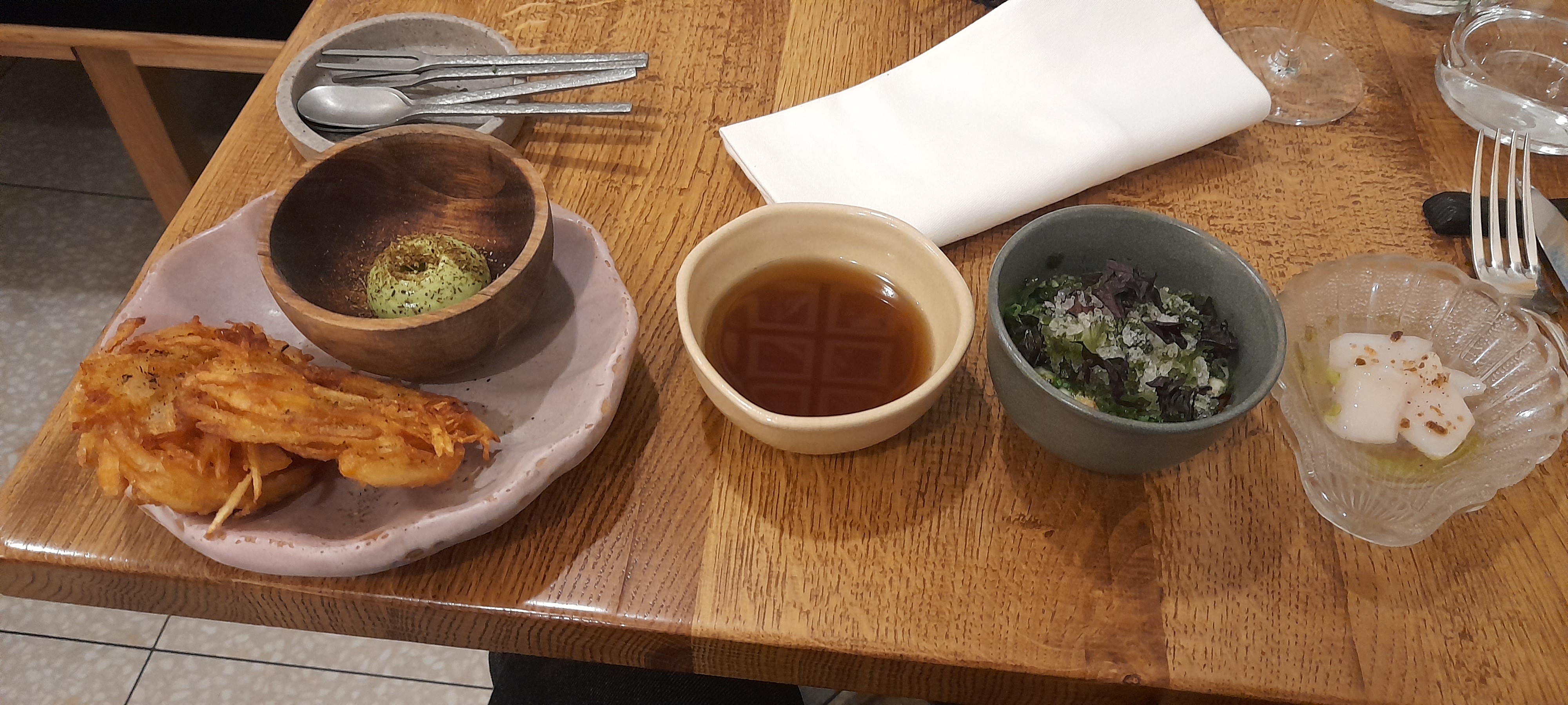 Nous avons passé un super moment dans ce restaurant, installés au comptoir. Le menu dégustation en 5 plats nous a fait découvrir de très bonnes saveurs. Le choix d'accord mets et vins expliqué par le sommelier était intéressant. Chaque plat nous a été expliqué. Certains plats sont plutôt simples, mais ce restaurant a un bel avenir. N'hésitez pas à jouer encore plus avec les textures.