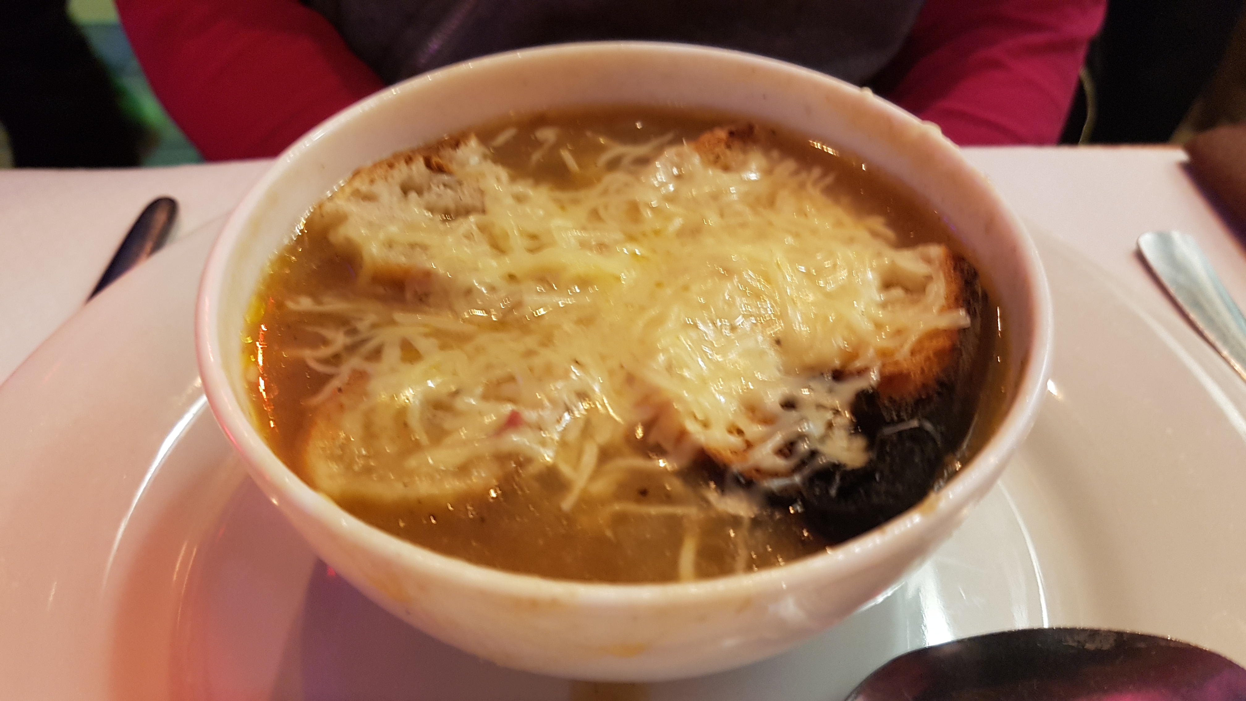 Soupe à l'oignon sans goût, viande dure et trop cuite, à la fin ils vous demandent même ouvertement un pourboire pour le service épouvantable.