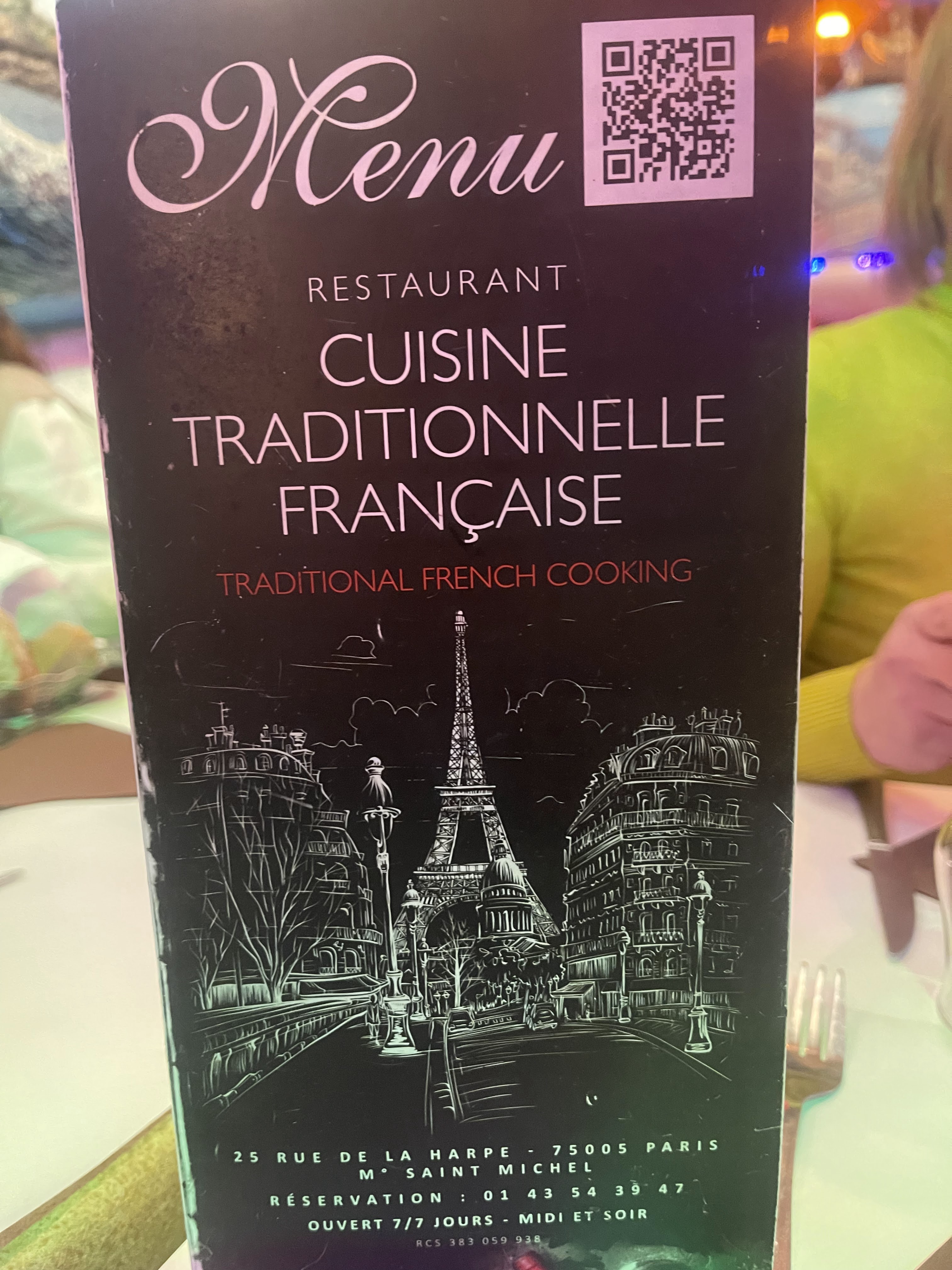 Niché en bordure du quartier latin juste au dessus de Notre-Dame, ce restaurant atypique pour sa décoration nous a laissé un peu sur notre faim . Par mesure d'économie et de pouvoir d'achat , nous avons opté pour la formule à 12 € où vous pouvez choisir vos entrées plats et desserts parmi un large choix. Sauf qu'à ce tarif là, vous mangez pour le prix . Le poulet frites que j'ai pris est le même que je fais à la maison . Le service est correct , le gérant chasse les clients sur le trottoir . Attention le terme chasse employé ici est synonyme de débusquer. C'est de coutume dans la capitale dans certains quartiers et ça sent un peu l'attrape-touristes. Si vous voulez manger sur le pouce pour continuer au plus vite vos visites , arrêtez vous là Si vous voulez de la gastronomie, passez votre chemin