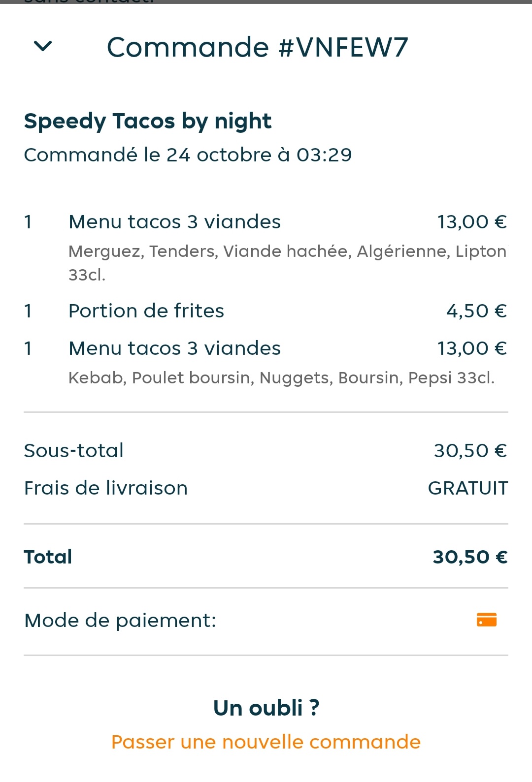 Une des pires expériences de ma vie, mon souci principal, c'est que l'on ma livré des choses que je n'avais pas commandé et on me l'a fait payer plus cher : on m'a fait payer un supplément avec mon tacos que je n'avais pas commandé pour littéralement une dizaine de frites (c'est tout) qui étaient en plus de ça moles et toutes froides. Et je ne parle même pas du menu enfant que j'ai commandé pour ma fille avec 4 tenders plus frites MANQUANTES (c'est une honte) que j'ai payé 6€50. En plus de ça ma commande est arrivée en 1h30 alors que l'on m'avais annoncé 50min et le livreur était désagréable, je trouve ça dommage car les Tacos ne sont pas mauvais mais il y a trop de points négatifs, bref, je ne recommande pas du tout.