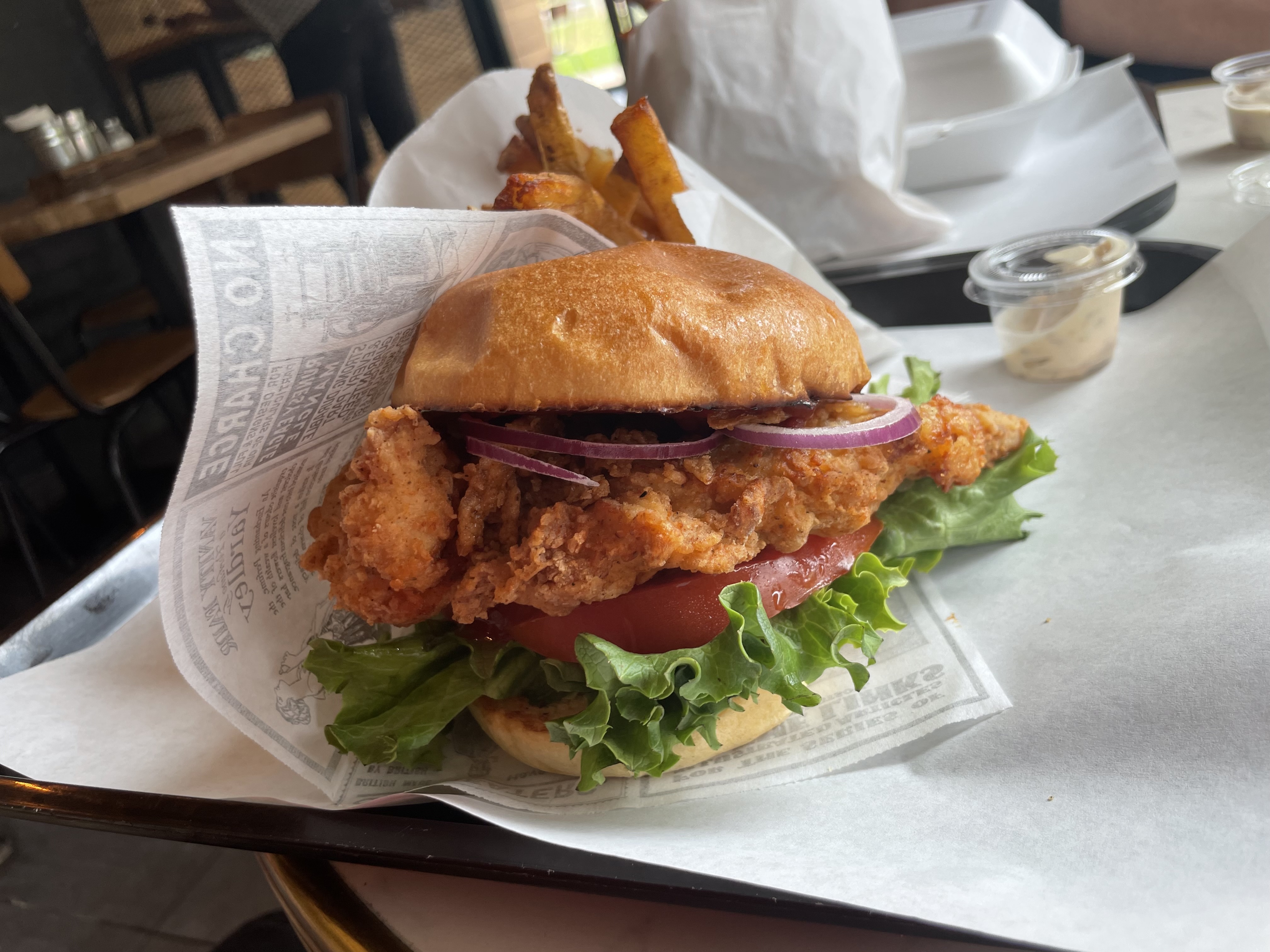 Dommage, le sandwich épicé ne l'était pas, pas très garnis non plus, malgré tout les frites étaient bonnes. La salade avait des morceaux de poulets sec mais les croquettes de fromage étaient bonnes. Du coup, avis mitigé pour la seconde fois que je mange chez vous .... Dommage !
