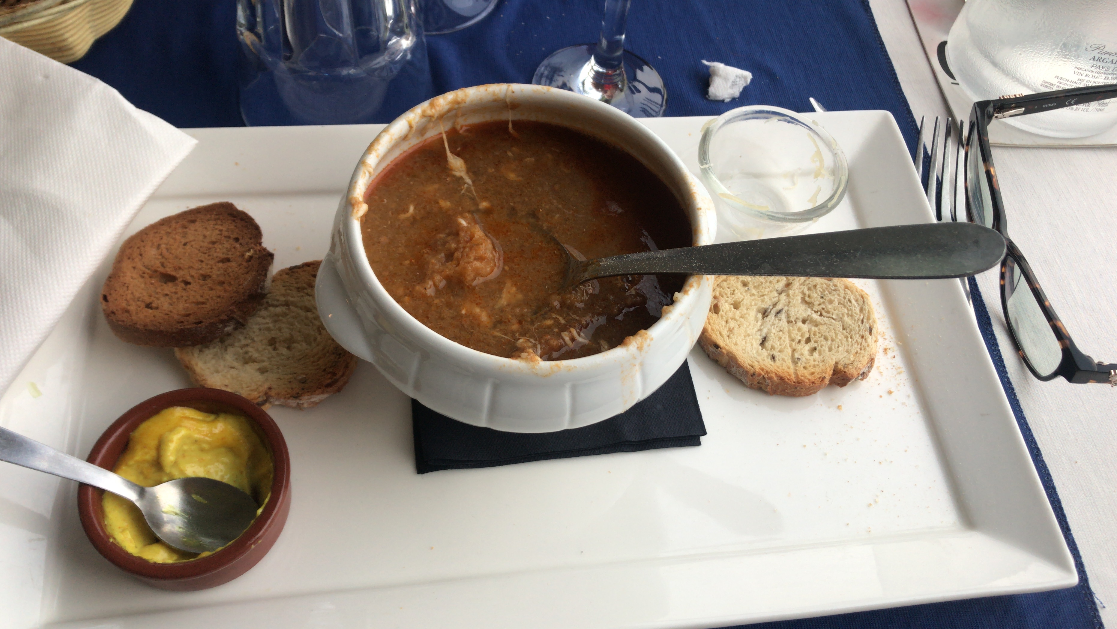 Entrée : rouille correcte Plat : moules marinières cuites, recuites, bouillies, mollasses, déchiquetées et disloquées au fond de la casserole tellement elles avaient trempées. Comment peut-on faire mauvais un Plat si simple alors qu'il peut être délicieux lorsqu'il est frais ?? Dessert : cannelé très bon. Serveur adorable de gentillesse et très gracieux, Prix : pas cher, mais ce serait tellement mieux si les moules marinières étaient cuites sur le moment, ça changerait du tout au tout, dommage !