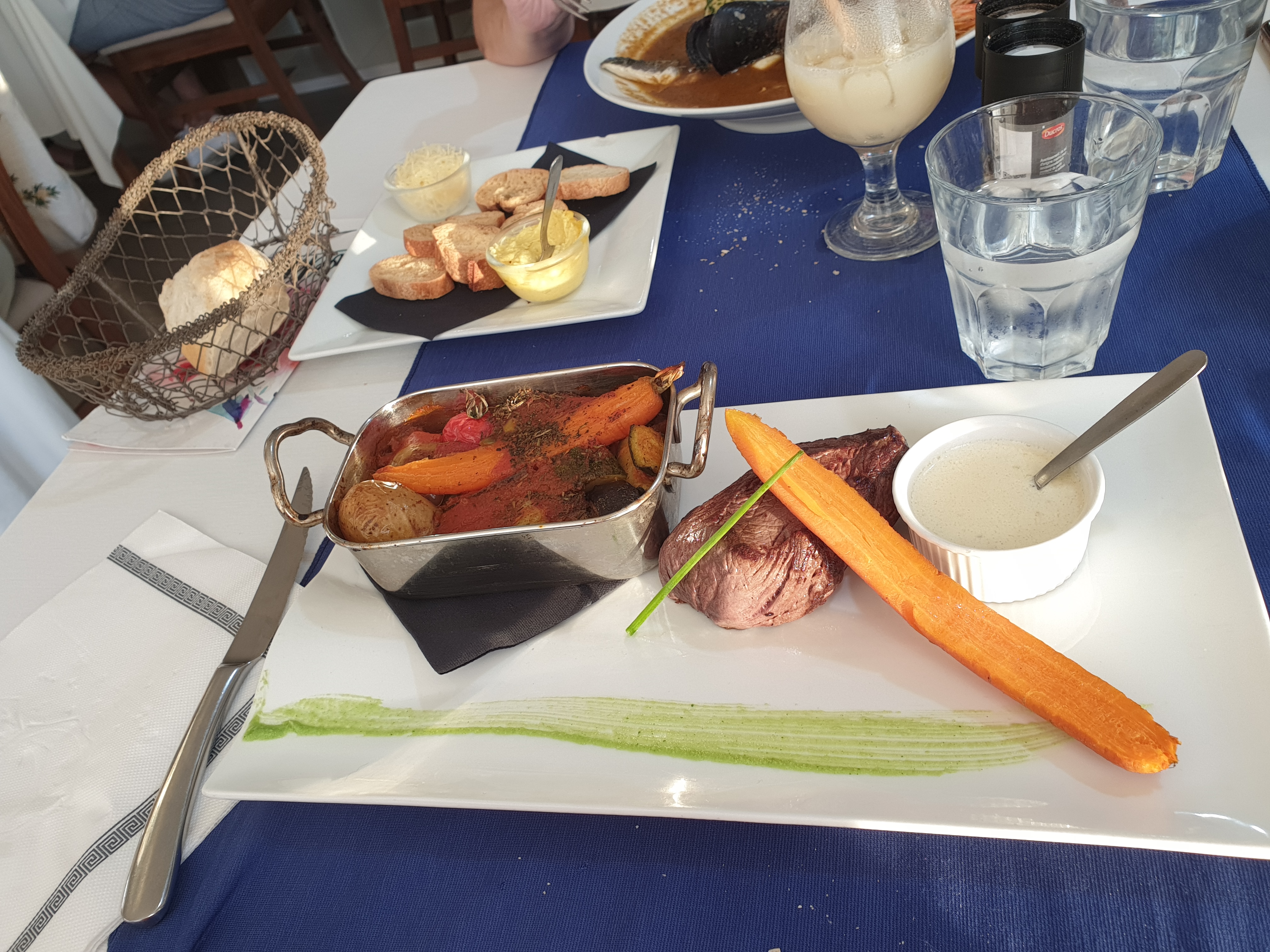 Situé en face de la mer, ce restaurant est bien placé. Le menu était copieux et fort en goût surtout la soupe de poissons. Nous avons apprécié le cadre, l'efficacité du service et le professionnalisme du serveur. Pour notre dernier jour, c'était bien. En espérant revenir.
