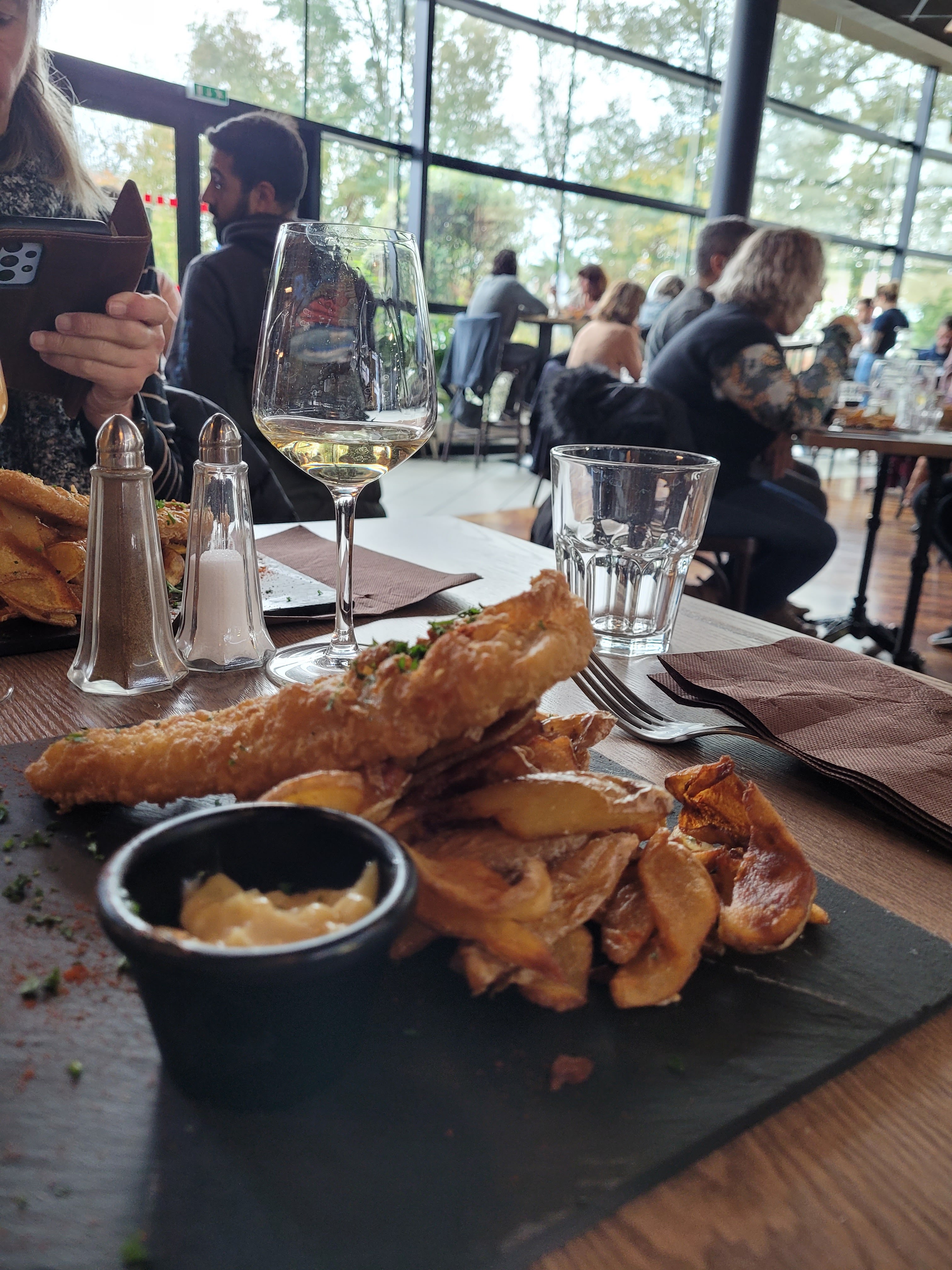 Un début de service un peu expéditif, peut-être dû à l'affluence.Un bon fish and chips ! Dessert correct...