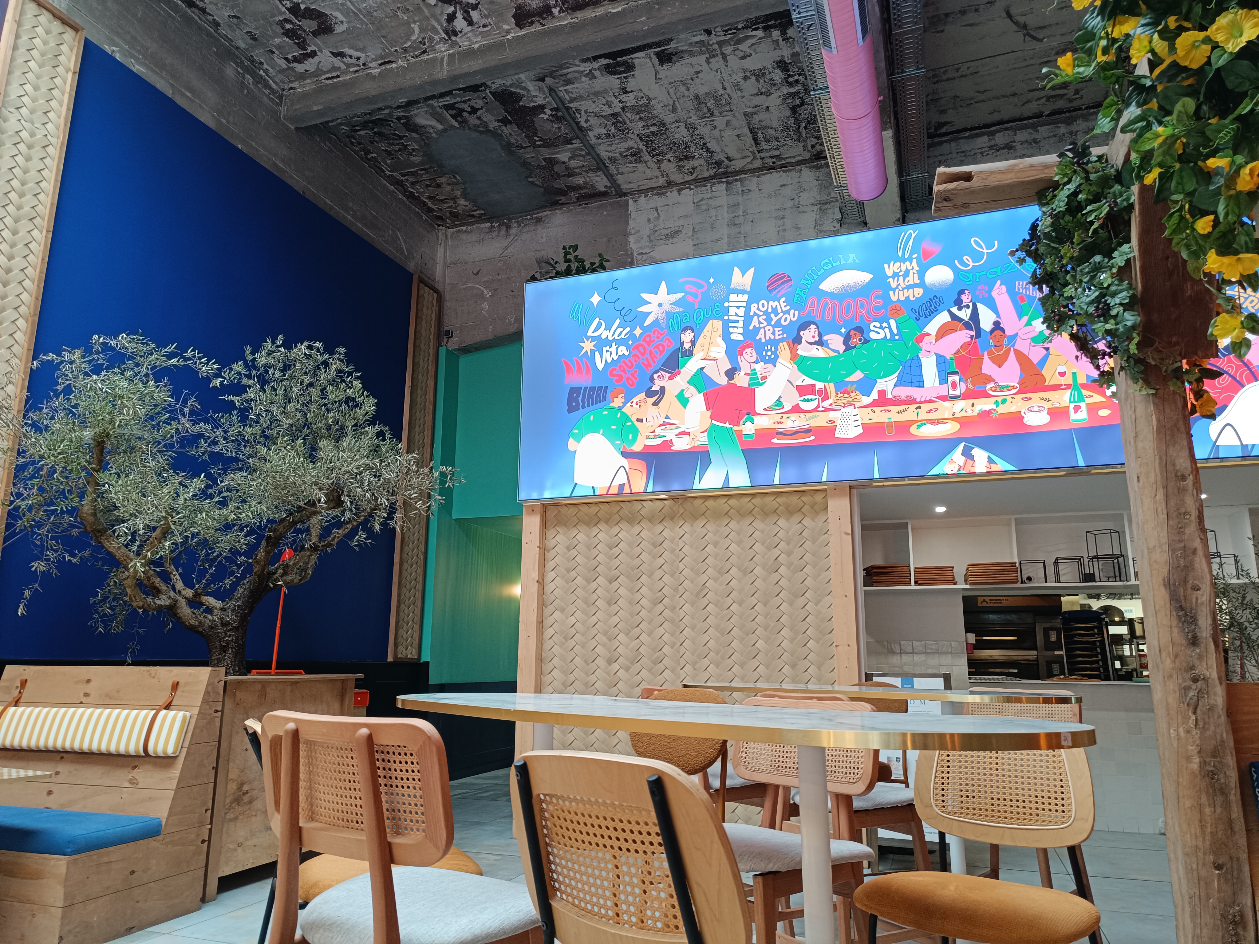 Restaurant au couleur vive qui donne envie d'y rentrer ! À la carte une déclinaison de Spritz qui sont très bon ! La différences avec d'autres pizzerias est dans le fait qu'on peut choisir jusqu'à 2 mètres de pizzas avec un maximum de 4 goûts différents sur cette pizza, plutôt sympa à partager. La pâte à pizza est épaisse, pas très garnis mais au moins les ingrédients utilisés sont bon. Les serveurs étaient sympathique, une bonne ambiance.
