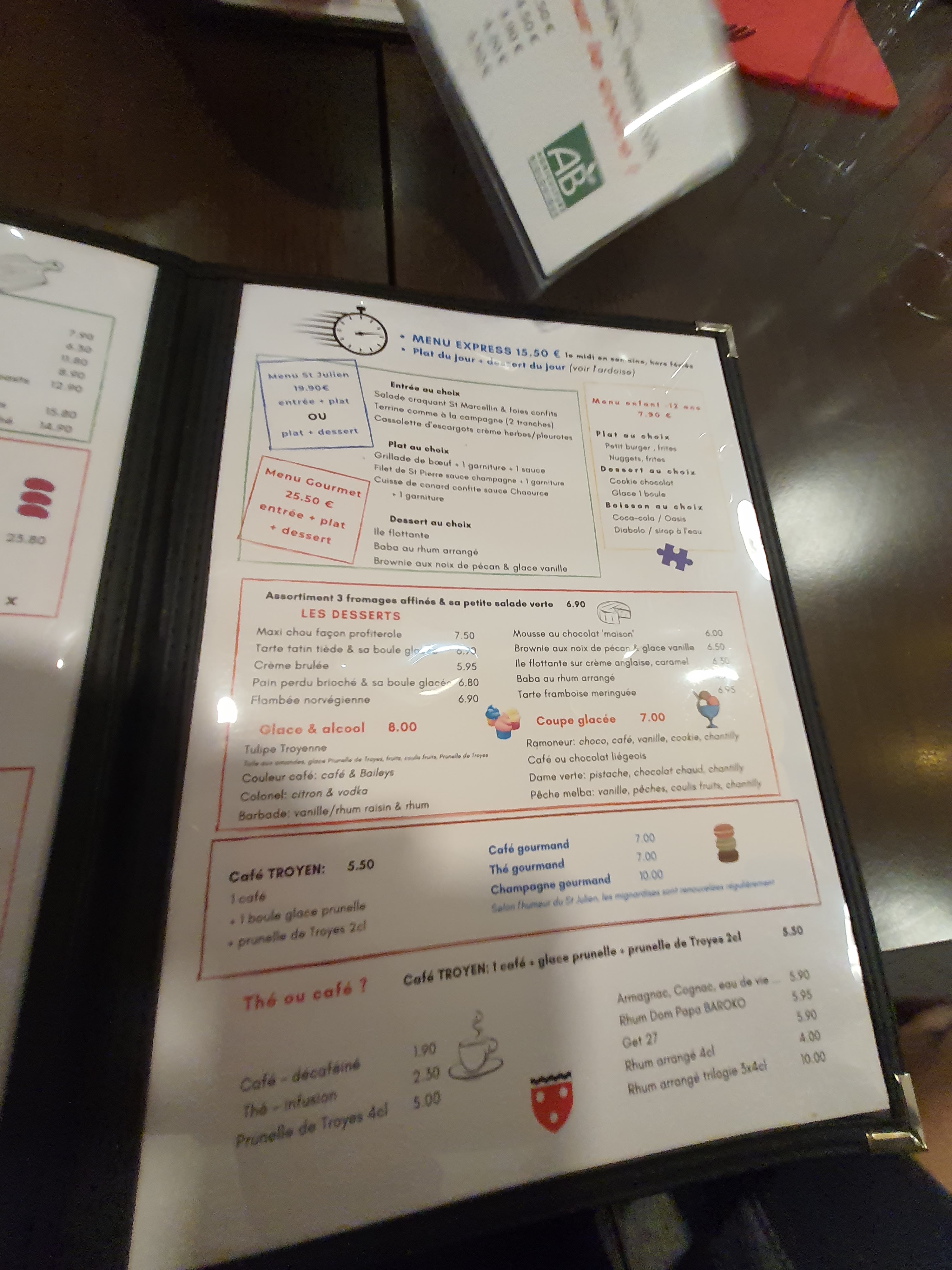 Repas du 1er janvier. Après plusieurs changements d enseignes, de concepts, et de propriétaires, petit restau toujours au top. Très bon rapport qualité prix en menus traditionnels hebdomadaires. ( testé hier), dans un décor simple mais cosy. Ce repas très abordable du 1er janvier est au top, partagé avec mes filles. Foie gras maison excellent, saumon de qualité Viande de bœuf d une excellente qualité. Tendreté, goût... le dessert Troyen et sa prunelle de Troyes... extra. Rien à redire, de l apéritif au café. Parfait. Vous accompagnez cela d une équipe très agréable et sympatique avec un patron attentionné, et voilà de quoi commencer une chouette année. Je leur souhaite bon vent et bonne chance en ces temps difficiles. C est rare et mérité !