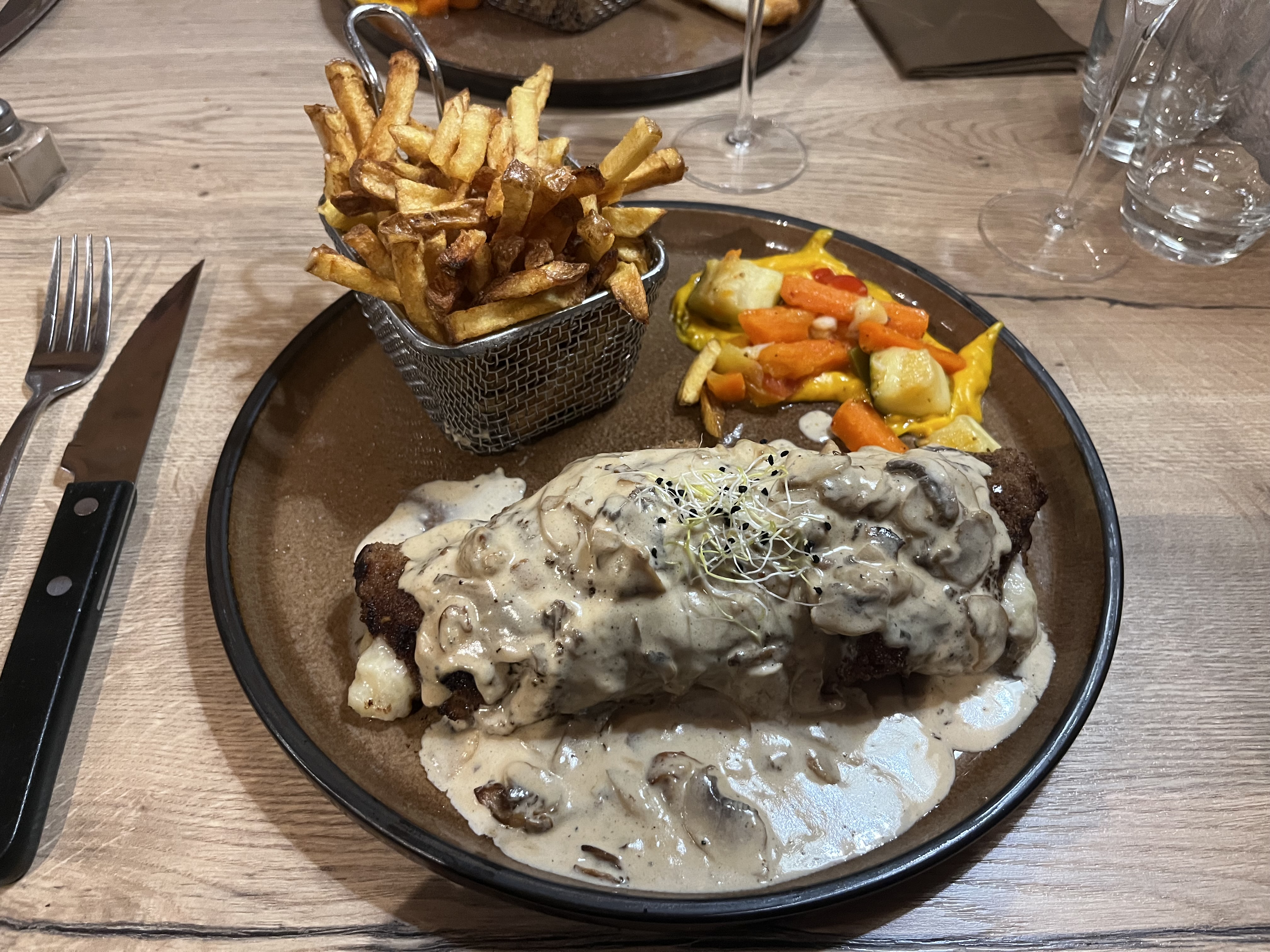 Cuisine fade pour un prix exorbitant (25€ le cordon bleu à la crème avec trois champignons et une crème à peine réchauffée, sans goût !!). De plus, quand j’ai demandé à emporter le reste du cordon bleu ( car je suis anti gaspi), ma viande m’a été rendue en boule dans du papier aluminium sans aucune boîte, du coup avec la crème, ma viande était complètement collée à l’aluminium. C’est la boîte à emporter qui est censée être enroulée dans de l’alu, pas la nourriture directement jetée dedans !!
