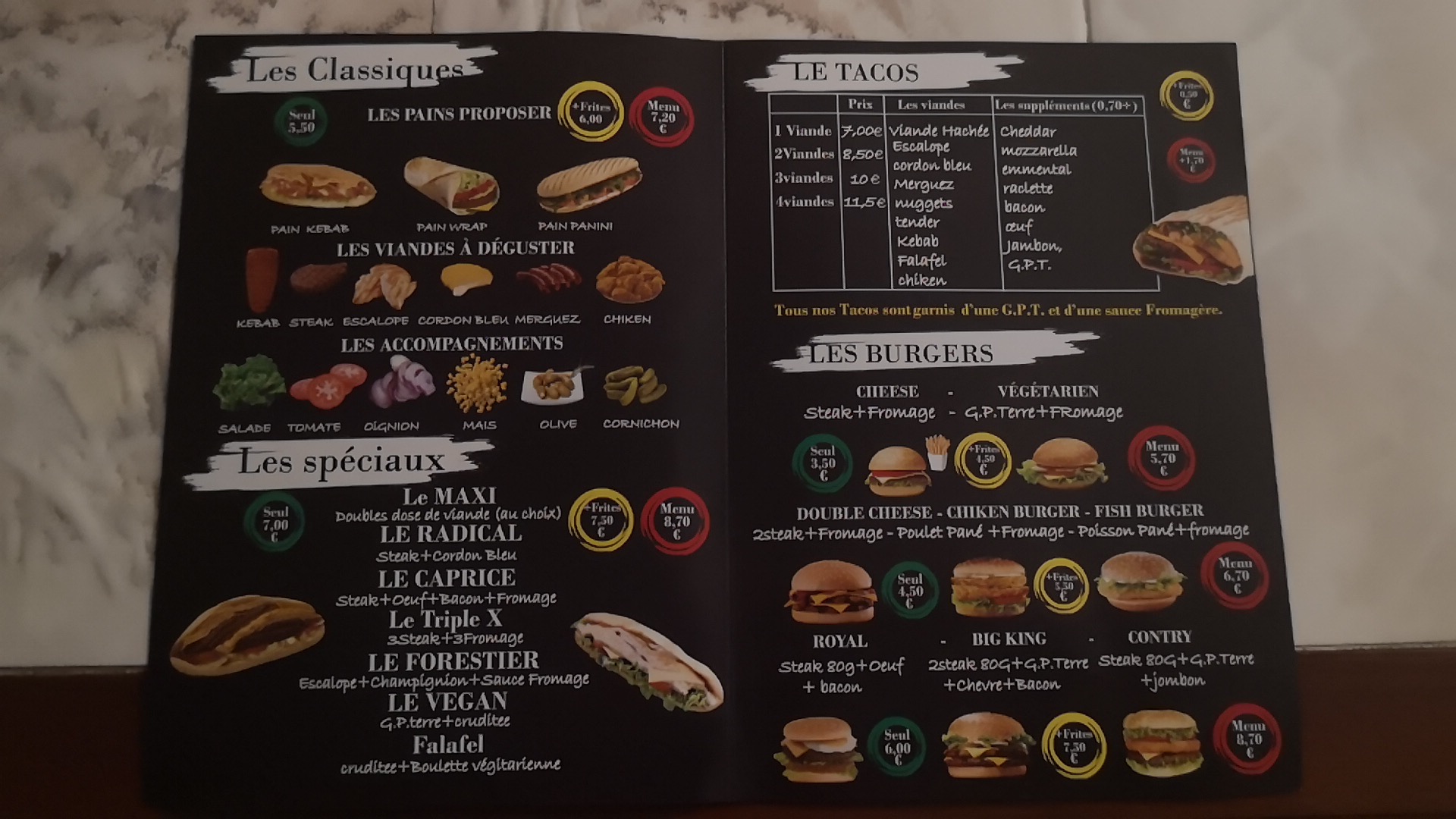 J’ai manger un tacos 2 viandes très bon et copieux ! Un bon accueil et le service super rapide ! Je recommande