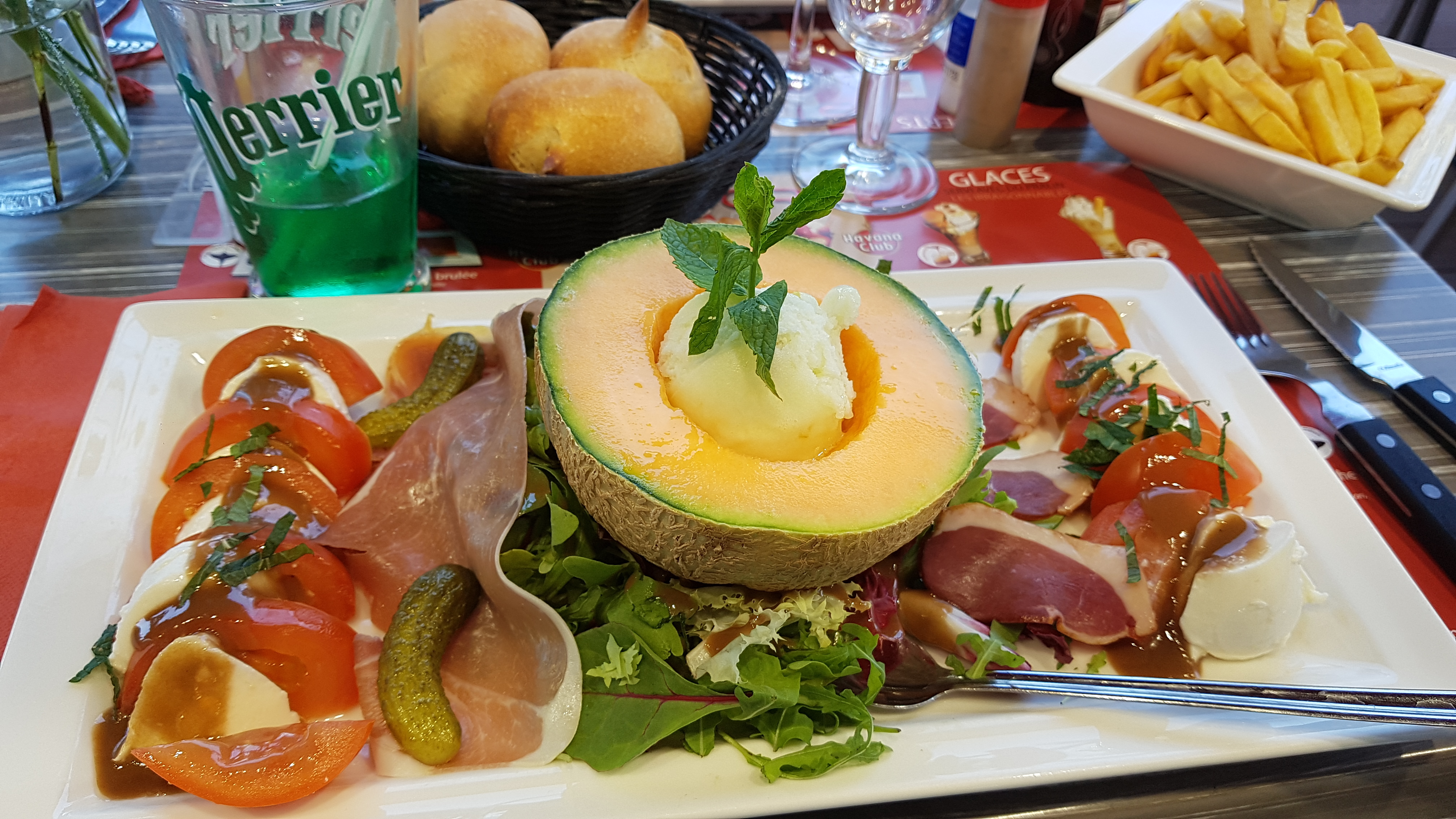 Magret saignant limite bleu à certains endroits et trop cuit d'autres, frites pas faites maison, accompagnement haricots verts proposé mais finalement compté en supplément (sans même m'avoir avertie au préalable), ambiance un peu froide avec la télé qui diffuse les infos en boucle ... franchement j'adhère moyen.