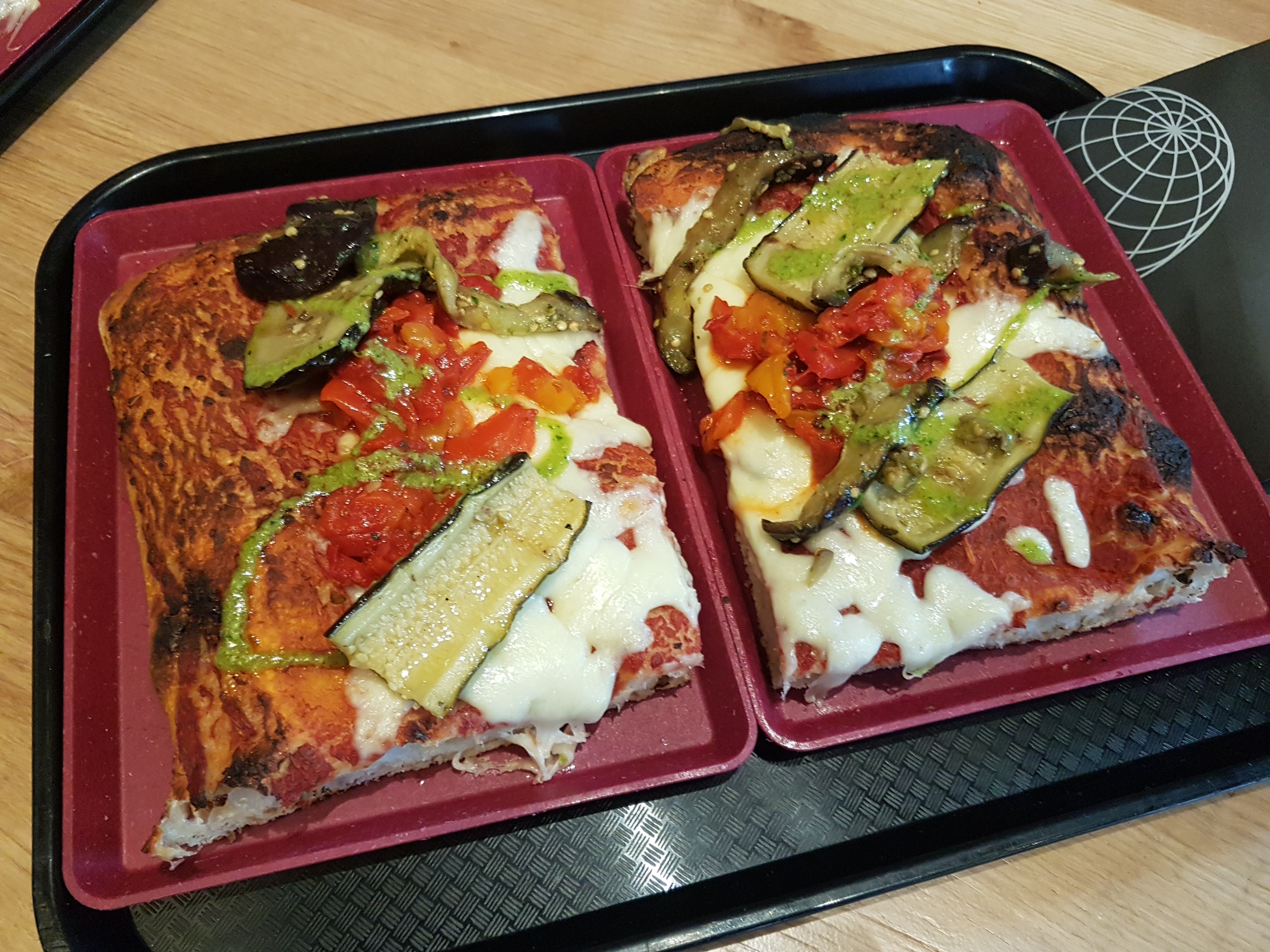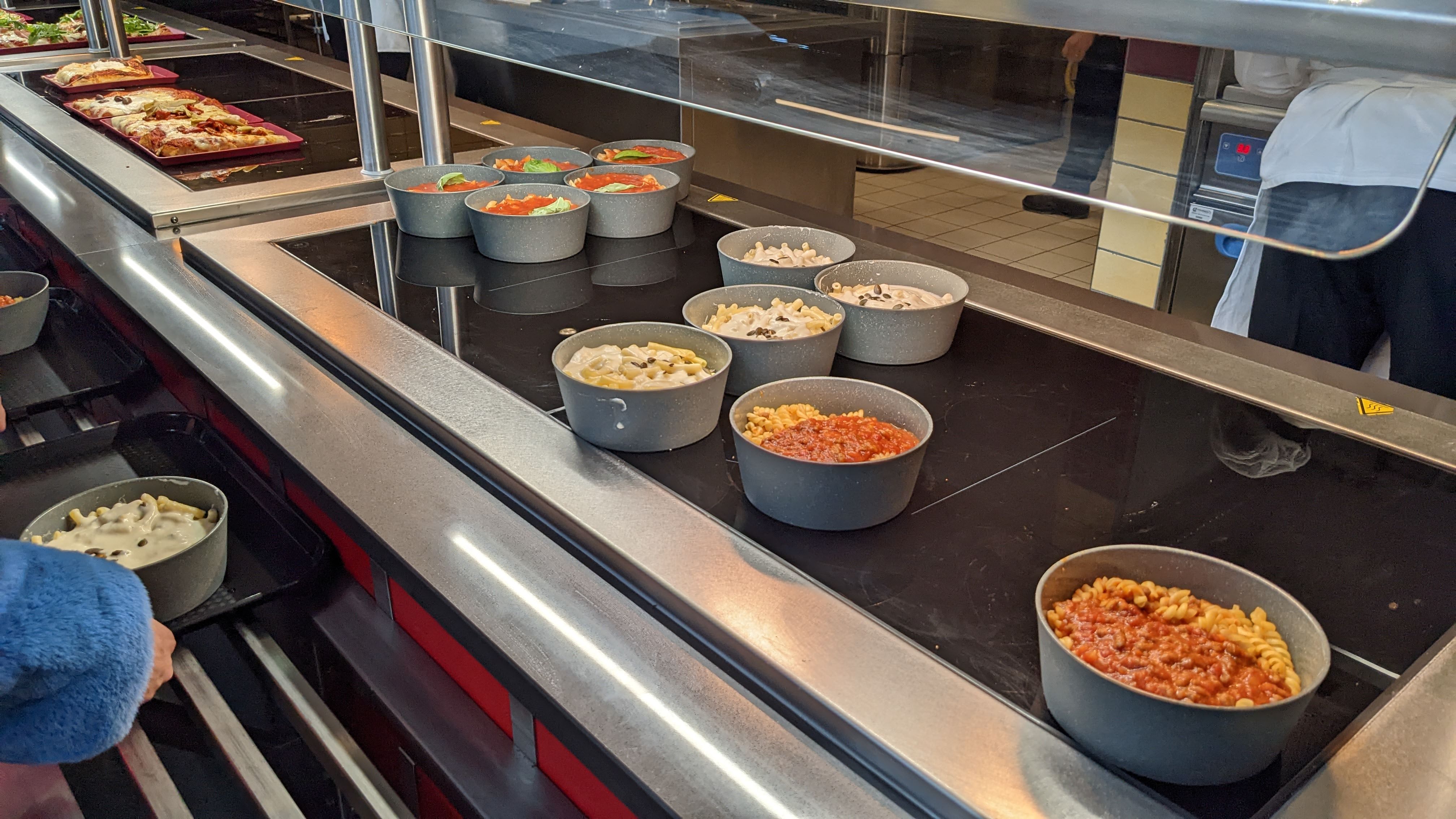 Restauration rapide avec choix entre plusieurs pâtes, salades et pizzas. Nous avons bien aimés, c’était assez copieux.