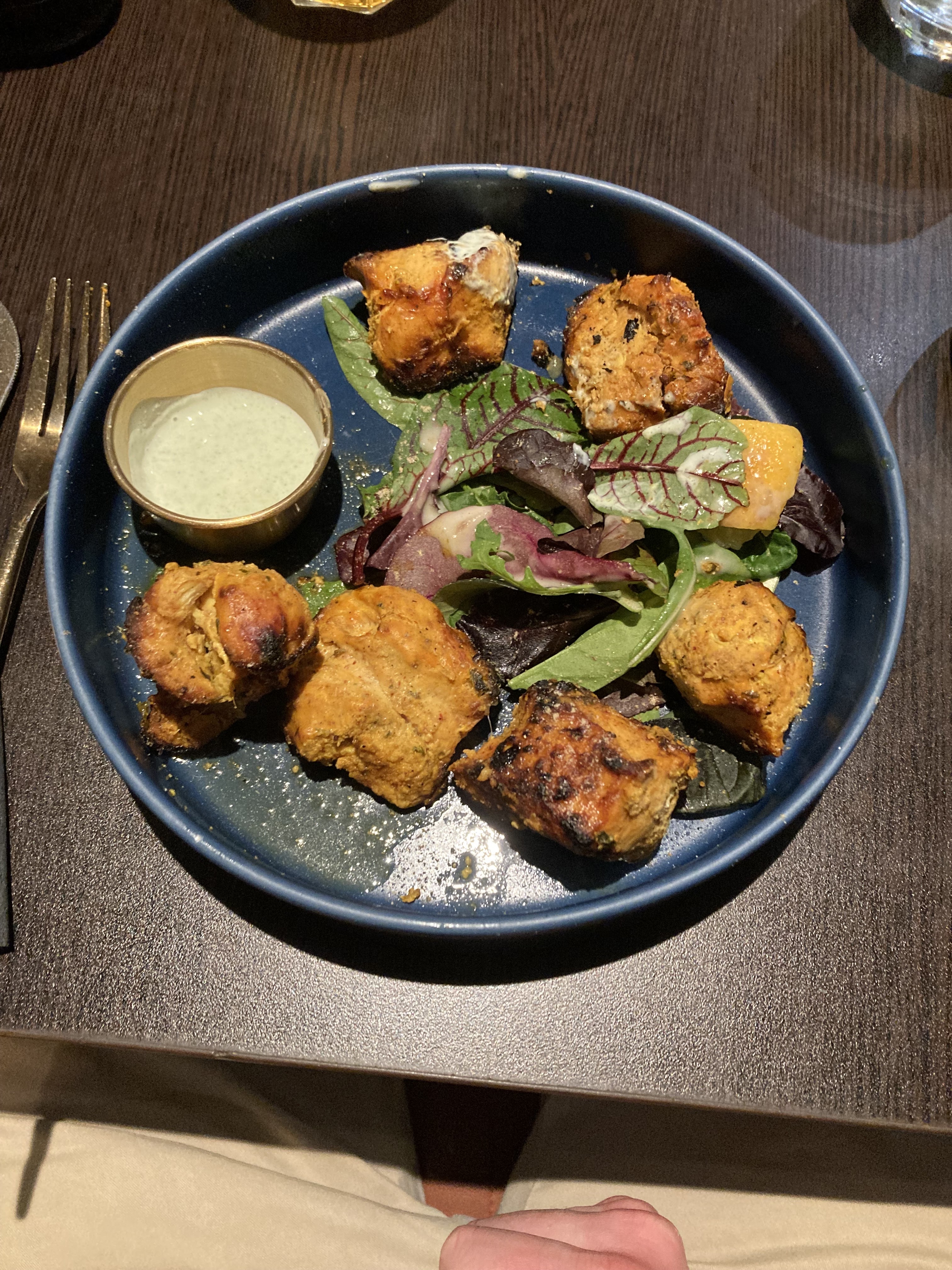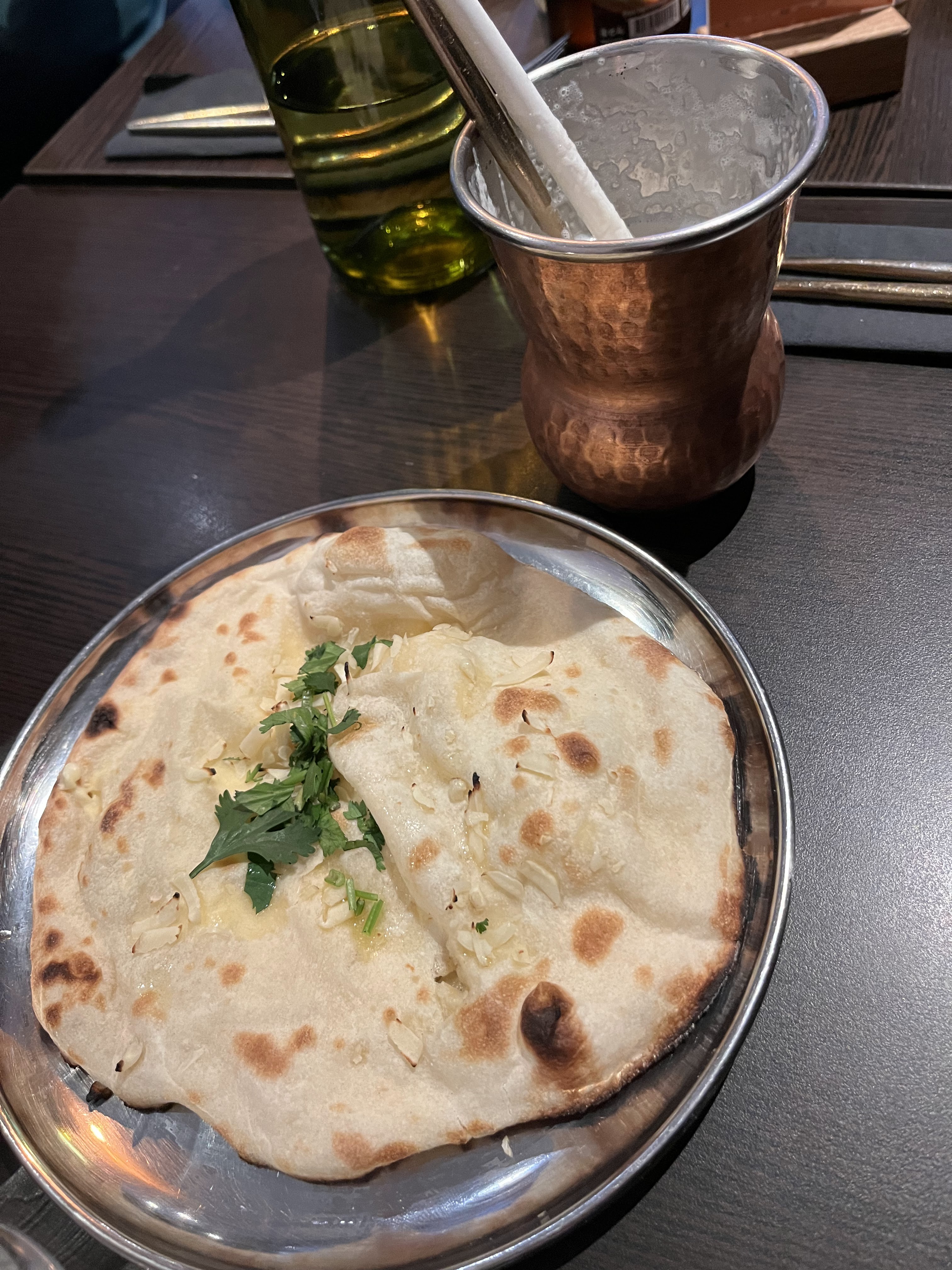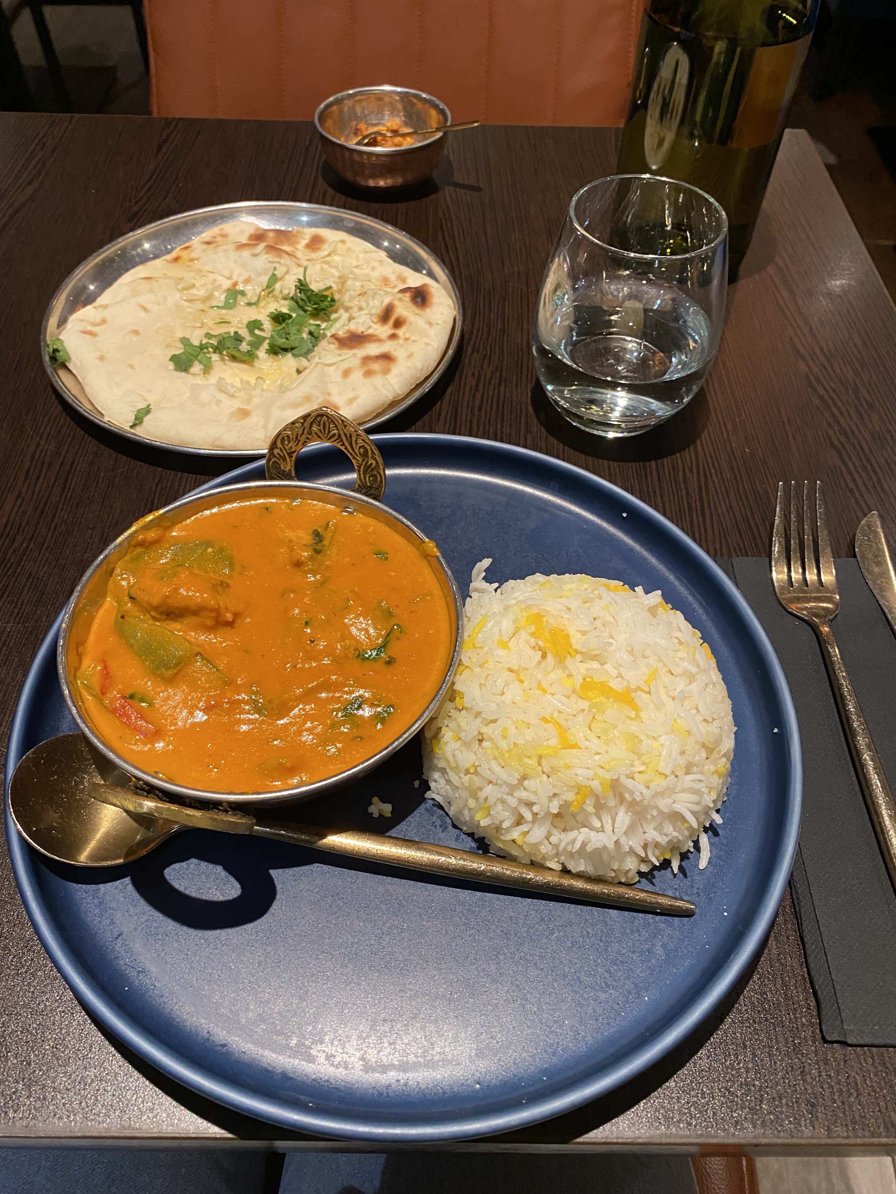 Premier restaurant indien avec une si belle déco. L ambiance est au top. Les serveurs très aimables et à l écoute. Les plats étaient très goutu. Une quantité un peu plus grande aurait été génial 😋. On aimerait commander toute la carte tellement c’est bon ! En revanche, j ai un petit peu moins aimé le butter chicken qui n a pas le goût habituel, peut être un peu trop le goût de la tomate qui ressort. Le dessert est top. Jamais gouté un naan sucrée c’est génial ! En tout cas je recommande fortement et je compte bien y retourner !!