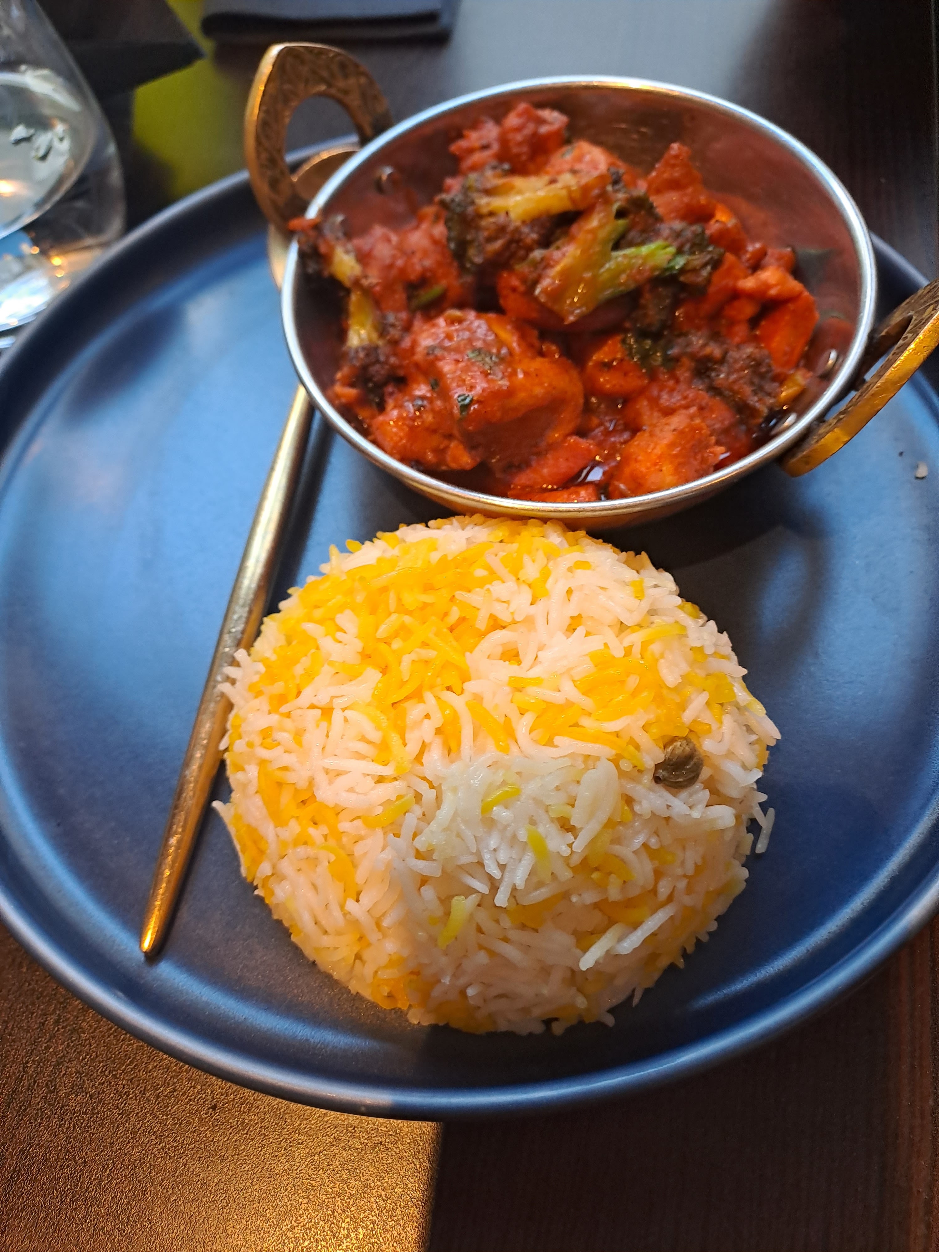 Nous avons essayé l'Indien pour la première fois. J'ai adoré le poulet au beurre et le poulet biryani. Le restaurant est propre et le personnel est très sympathique. Ne partez pas avant de manger du kulfi. C'était un super dessert glacé à la pistache et à la mangue 😋 nous avons payé 37€ pour 2 plats principaux et un dessert glacé en août 2023.