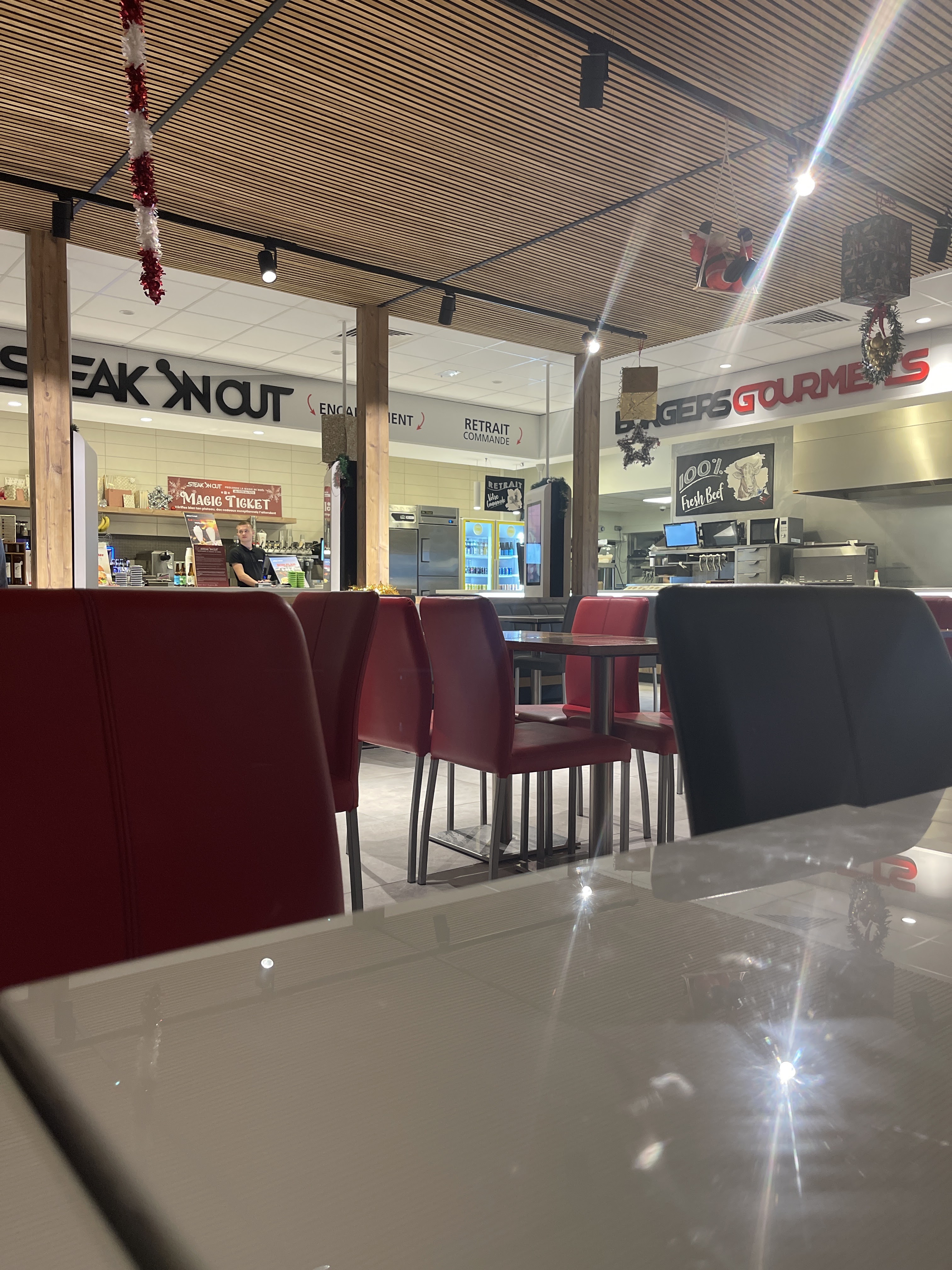 Super endroit,personnel très disponible et souriant,cuisine super et succulente,les syeack haché sont frais ,bien grillé et les frite fraîche super bonne,recommande les yeux fermés