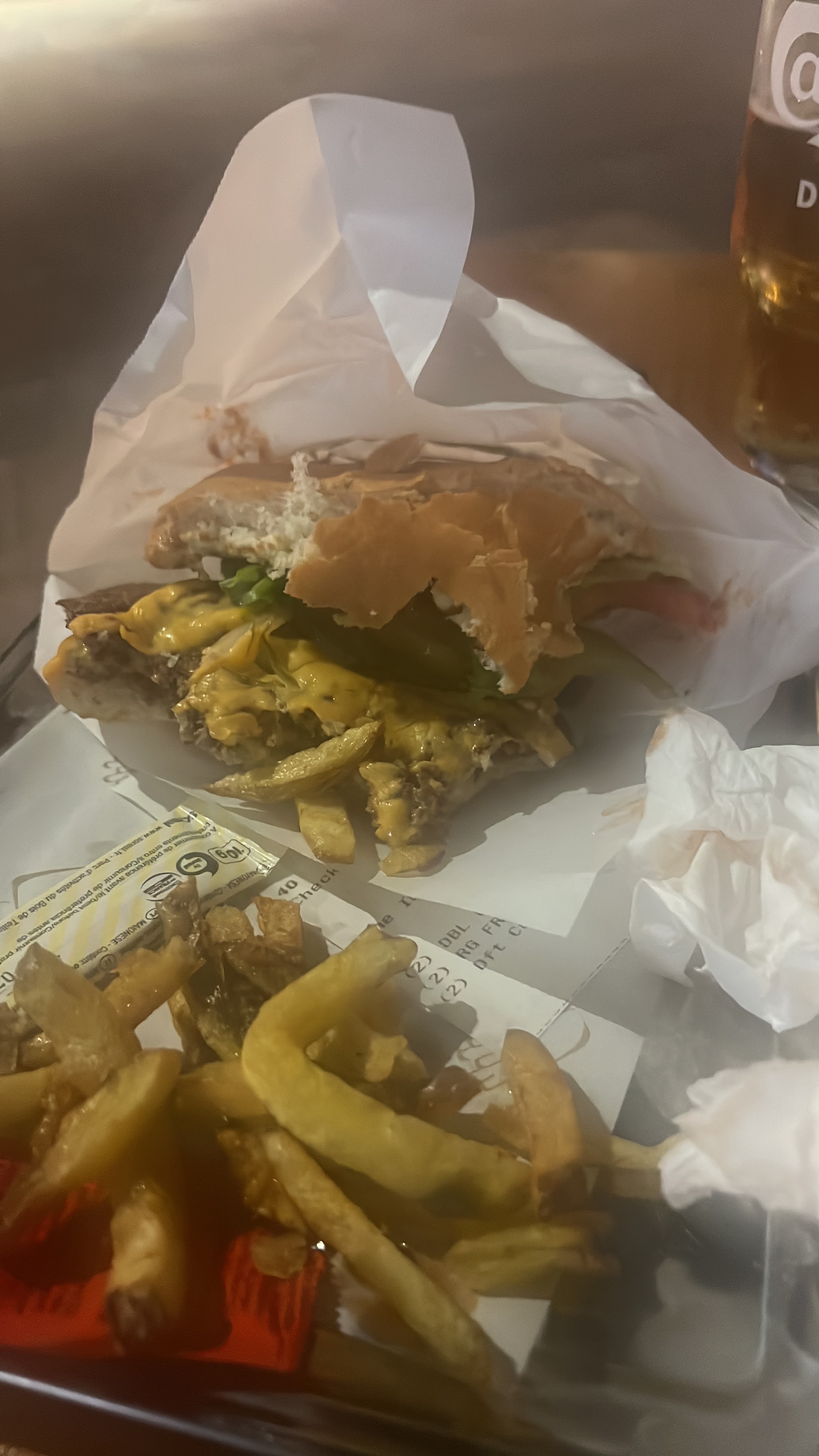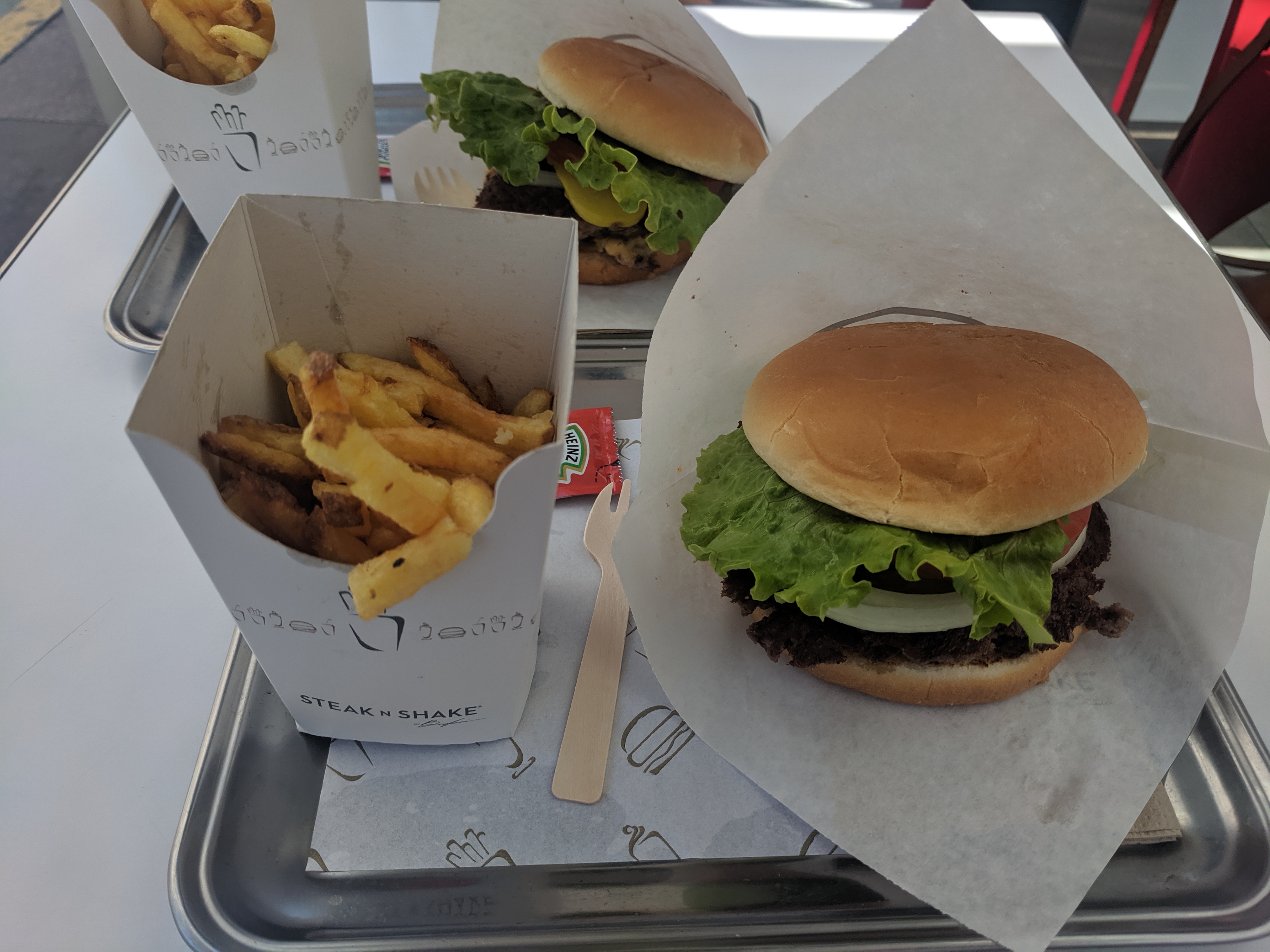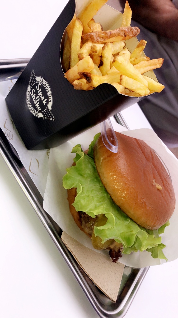 J'adore vraiment les hamburgers ! Mais les frites ne sont pas bonnes, les petits morceaux de pommes de terre brûlées, ce n'est pas cool du tout. J'espère que vous pourrez changer ça ! J'adore toujours Stake n Shake de toute façon.