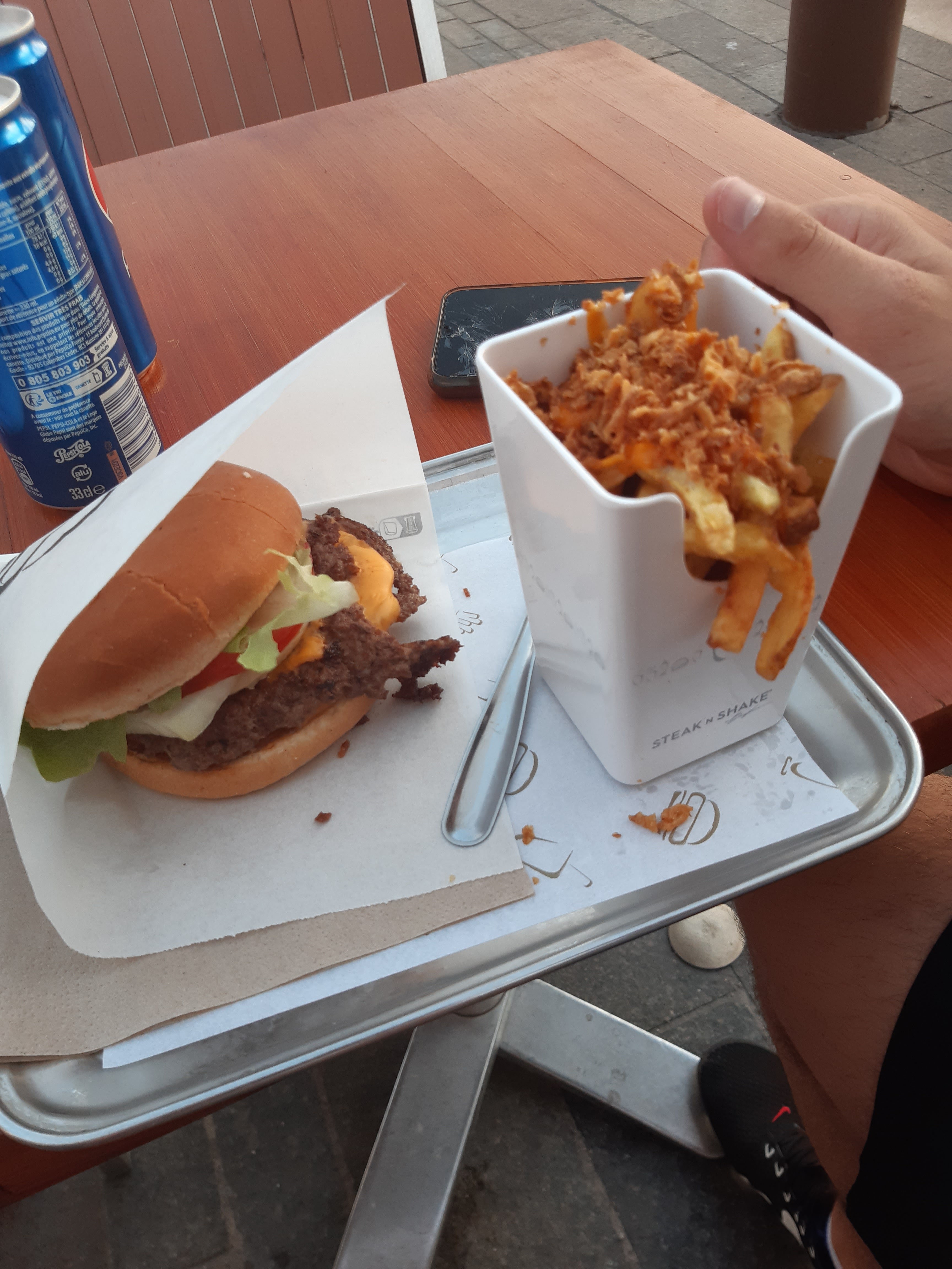 Excellent burger et milkshake d’un goût puissant et enivrant, c’est une osmose des saveurs le signature bacon & egg et la citronnade était divin et le mélange glace et daim à tomber par terre. J’étais avec un petite dame blonde en caisse agréable et compréhensive je recommande vivement merci steak and shake !!!