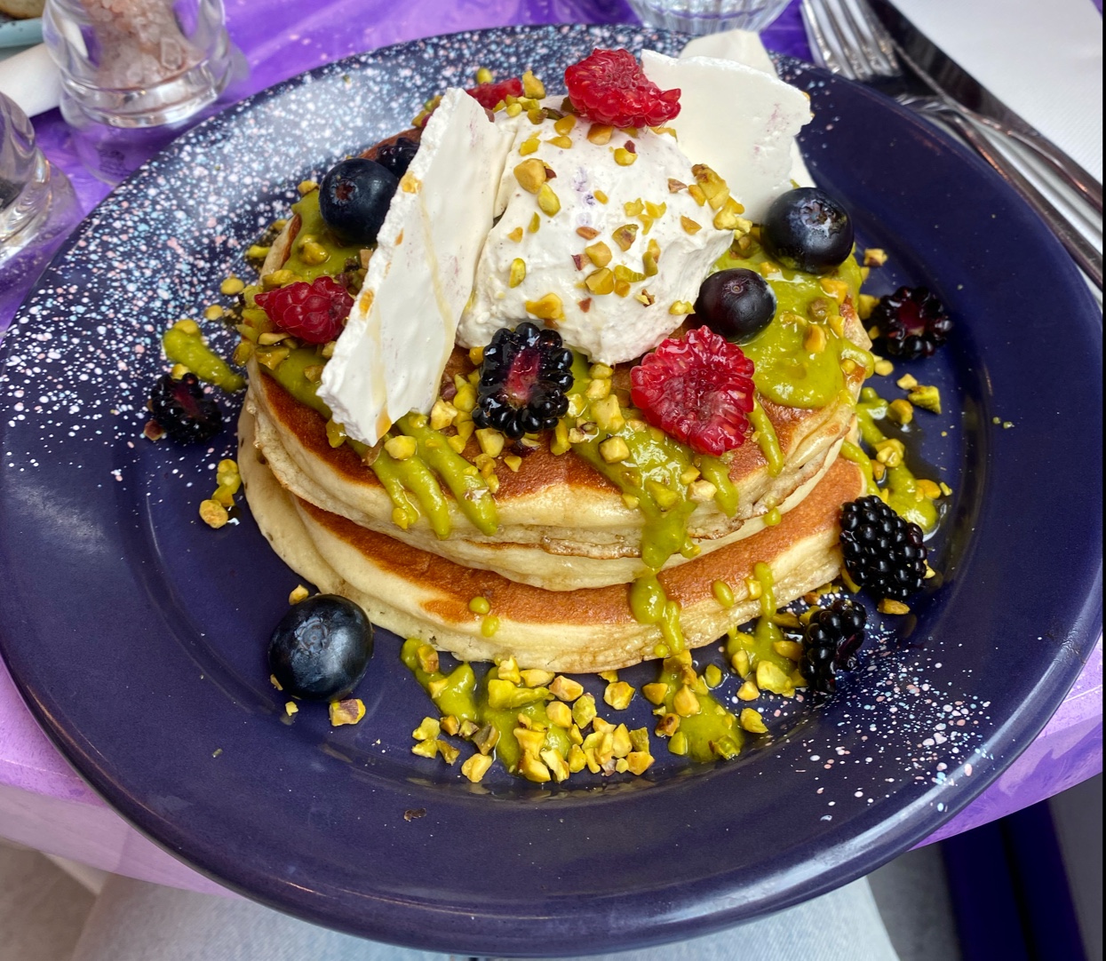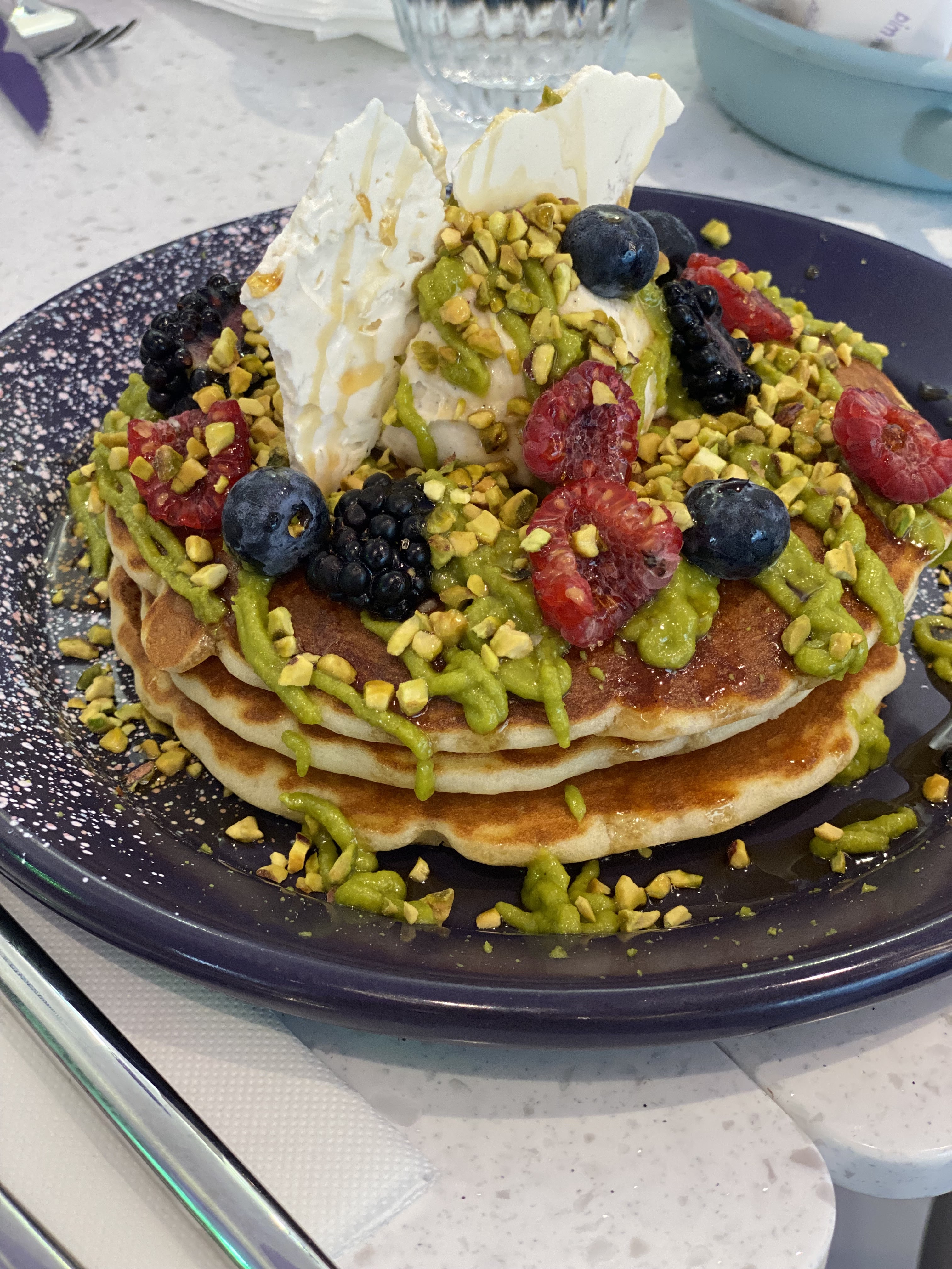 Piquée de curiosité suite aux vidéos sur les réseaux ,je n’ai pas été déçue. J’ai pris du sucré pour ma part , les pancakes sont bons, le combo pistache,fruits rouges , mascarpone vanille match super bien et l’assiette est copieuse 🤗.Sans compter l’accueil souriant et la déco au top !