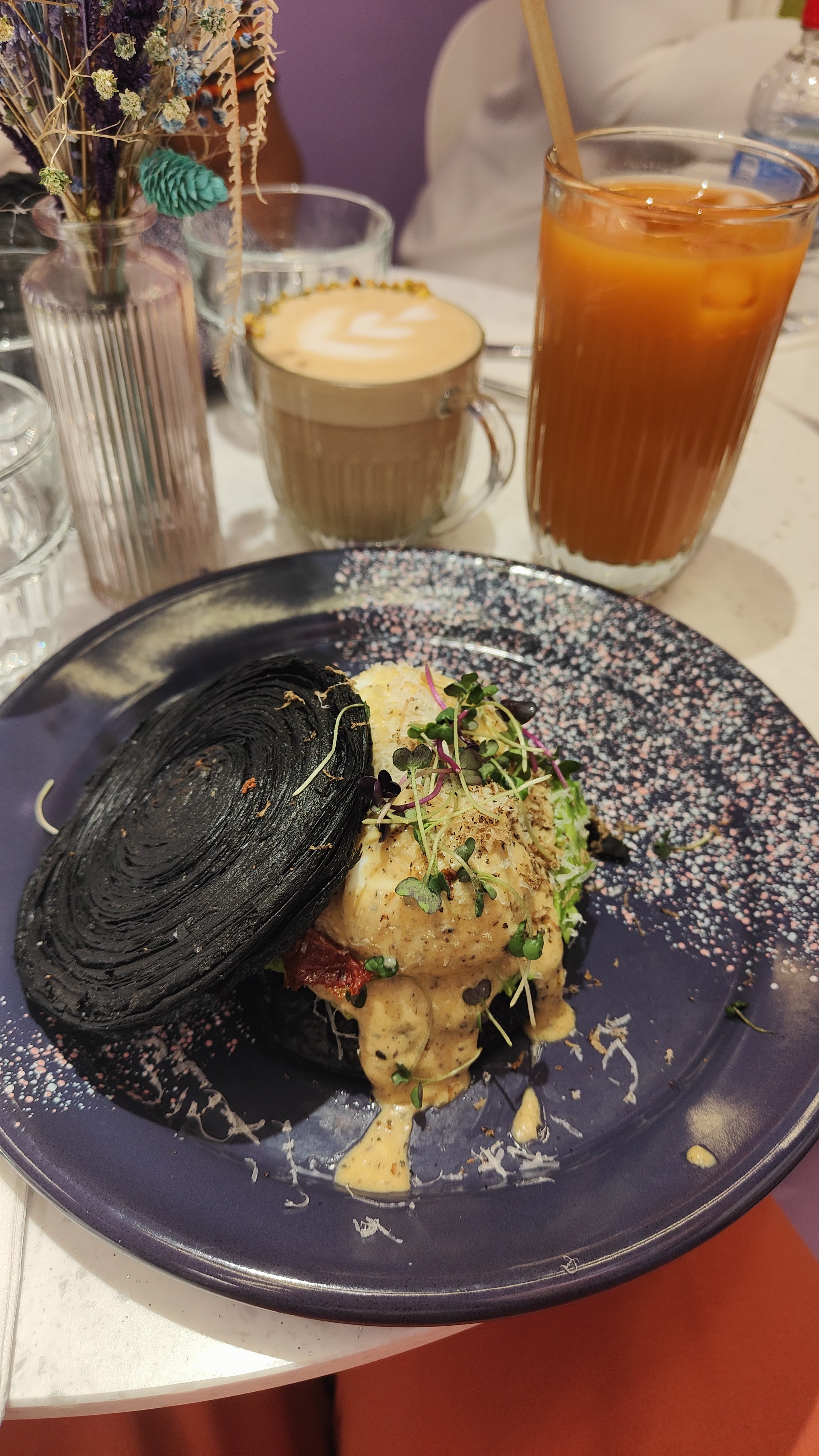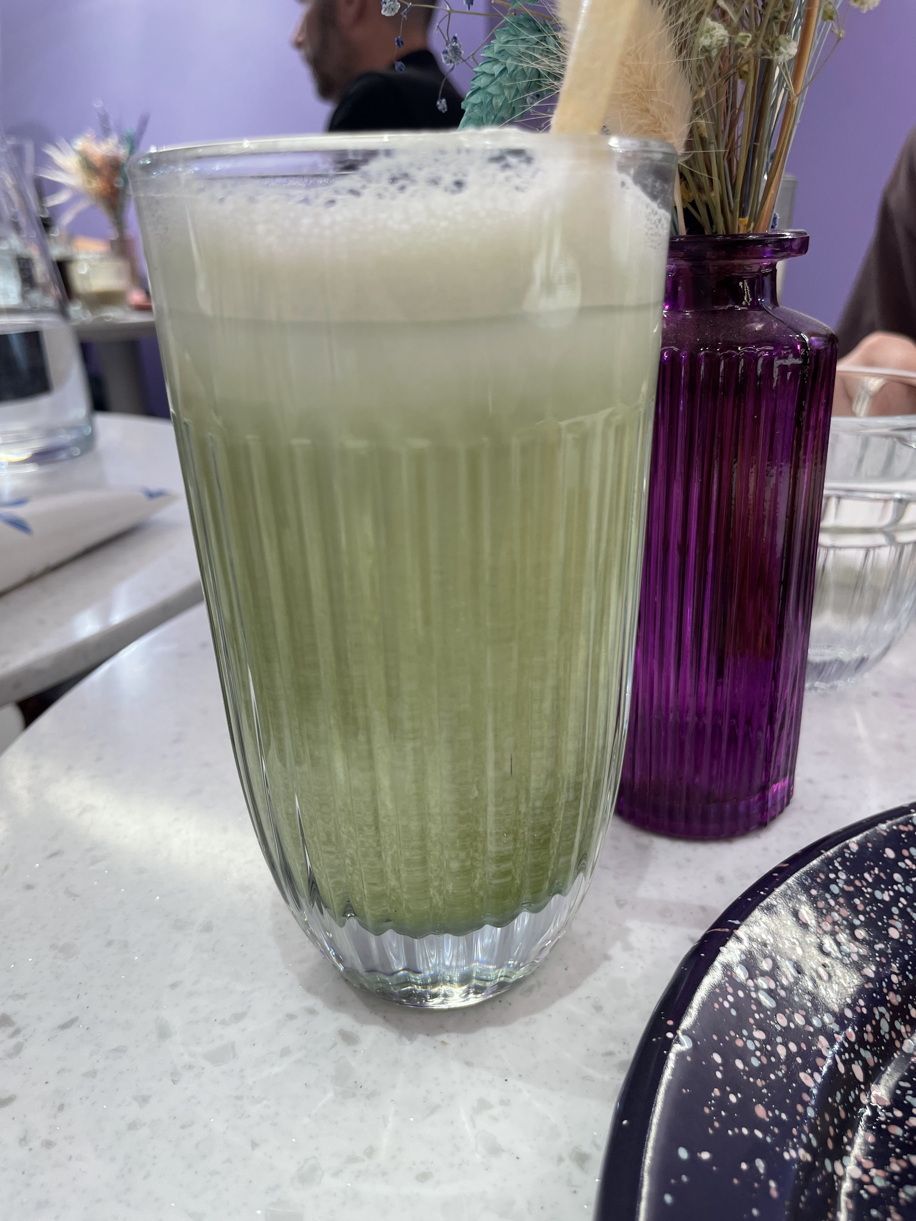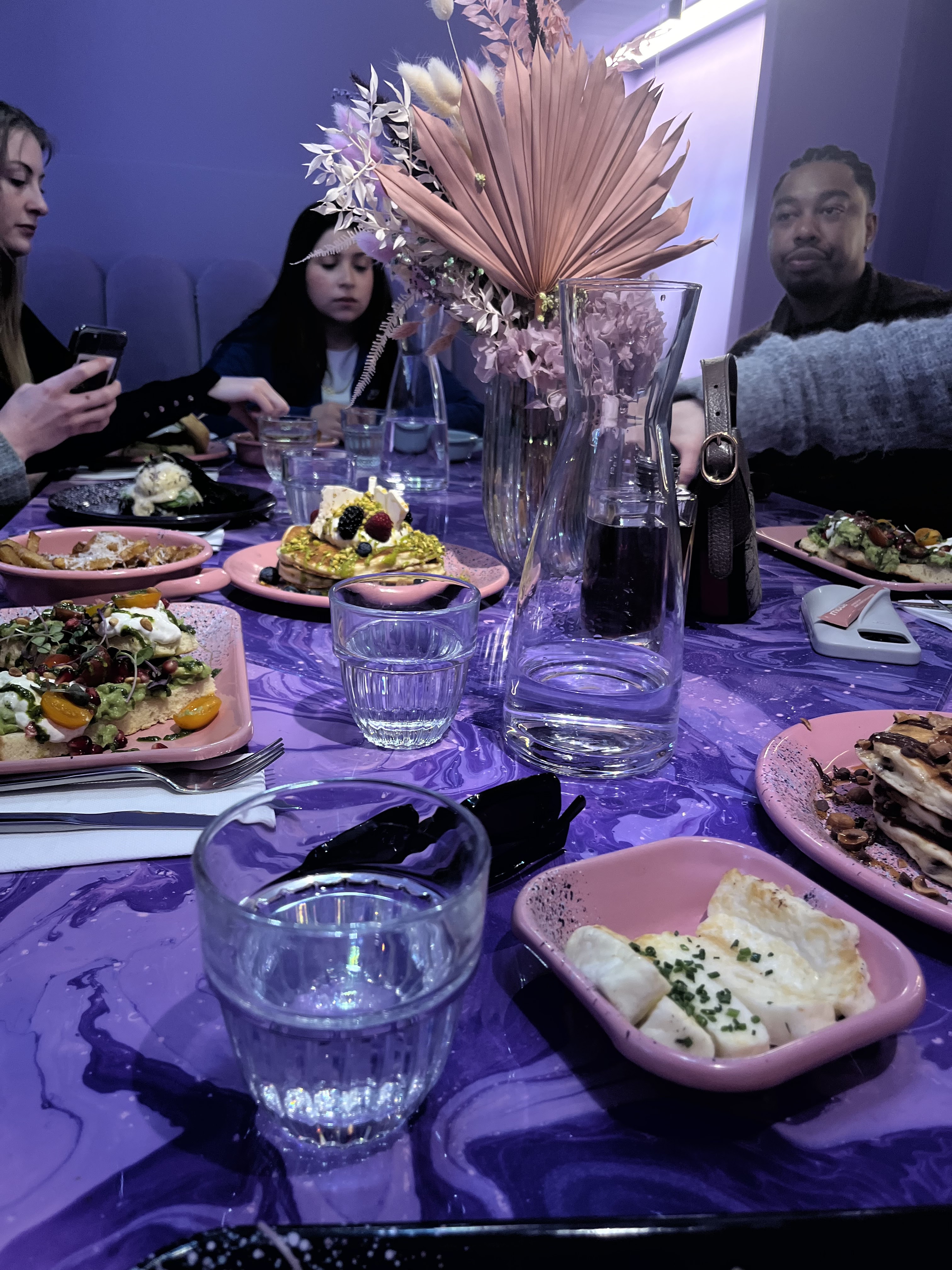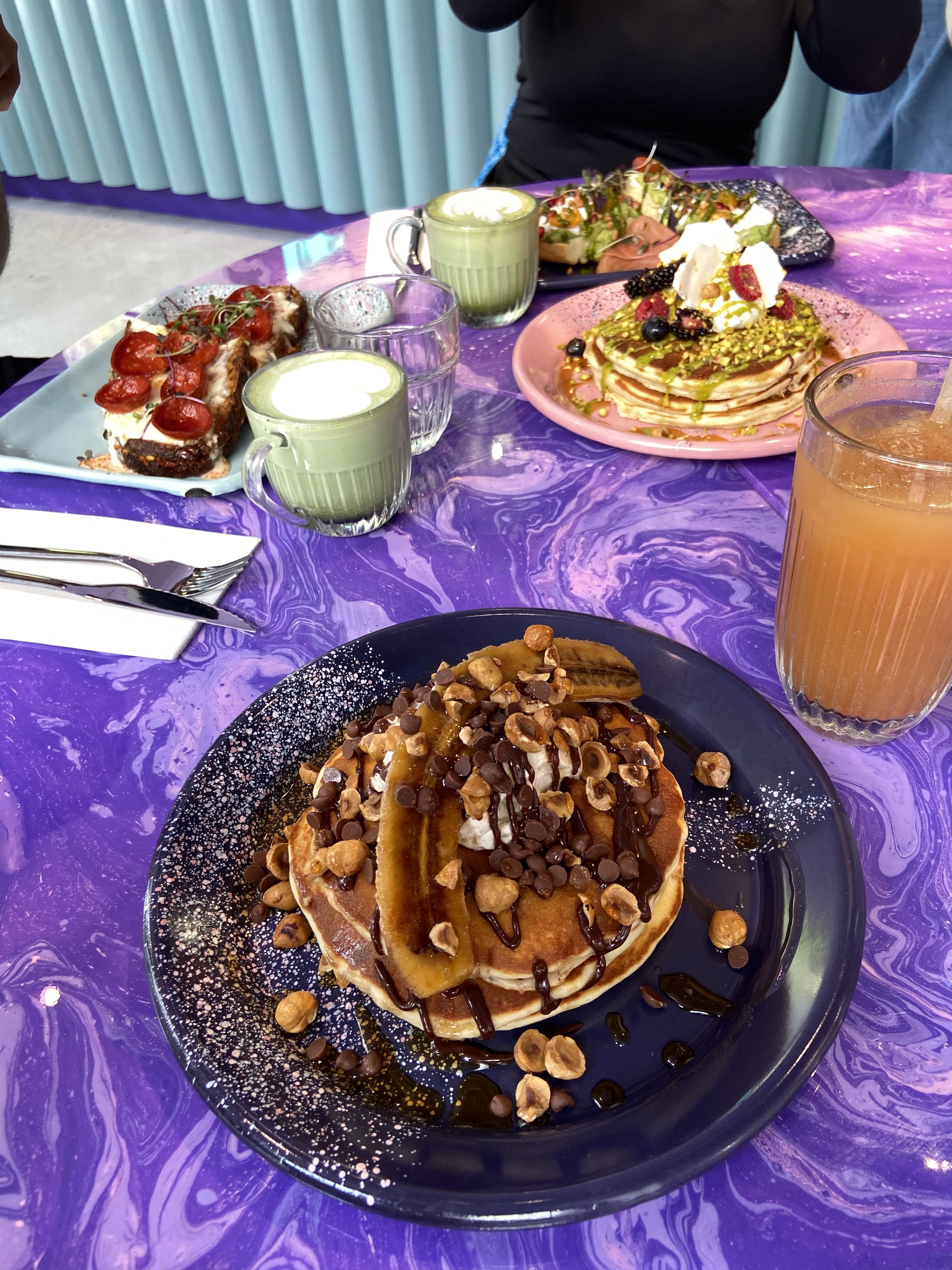 La nourriture était fantastique, nous avons pris un burger italien croustillant et un toast à l'avocat Nous n'avons pas pu finir les assiettes ! Les thés matcha sont délicieux aussi Les serveurs sont vraiment sympas et souriants, le service est globalement très bon Maintenant, si le violet est votre couleur, vous serez très heureux ! Les décorations sont magnifiques C'est digne d'un bon brunch !