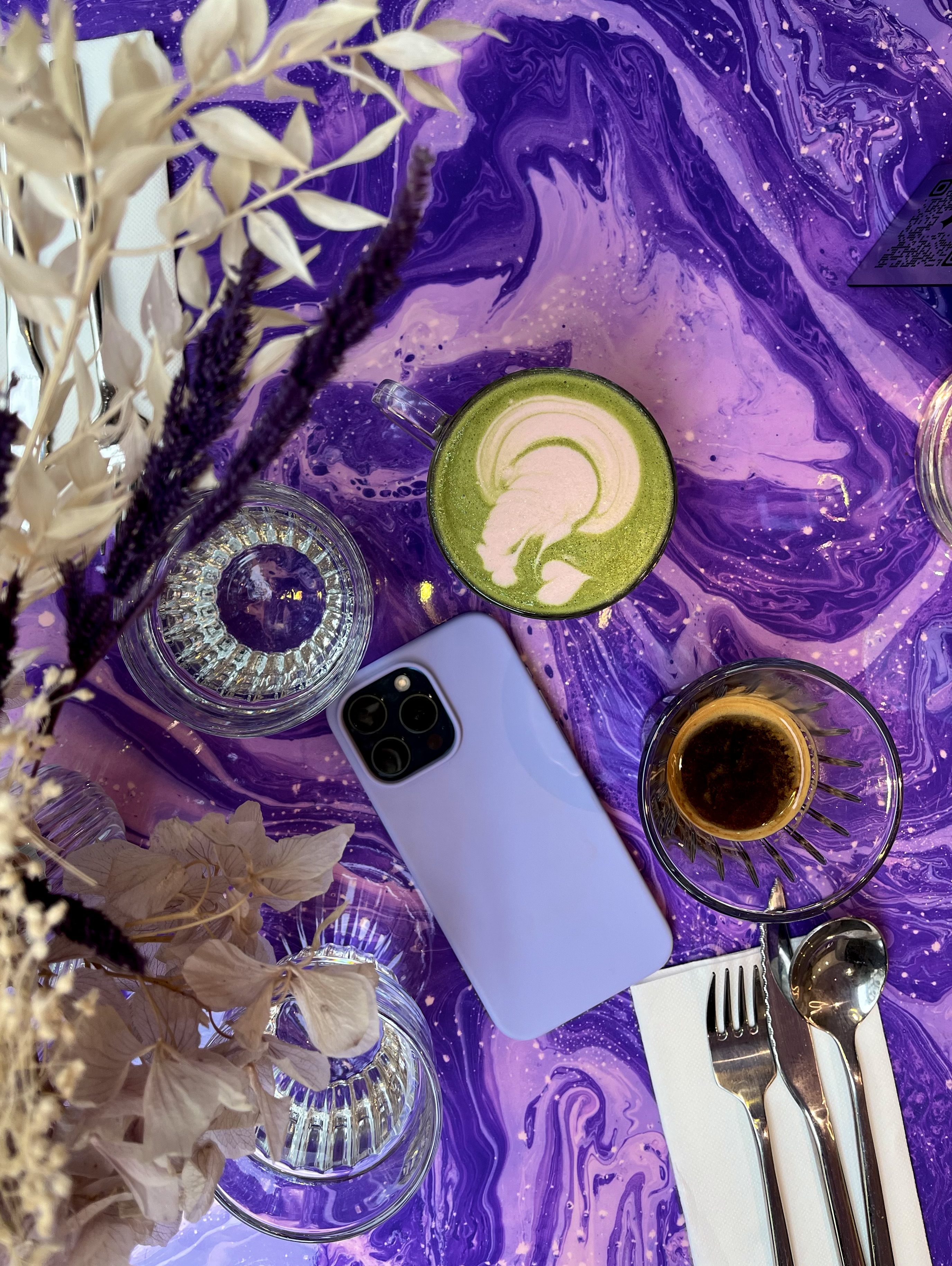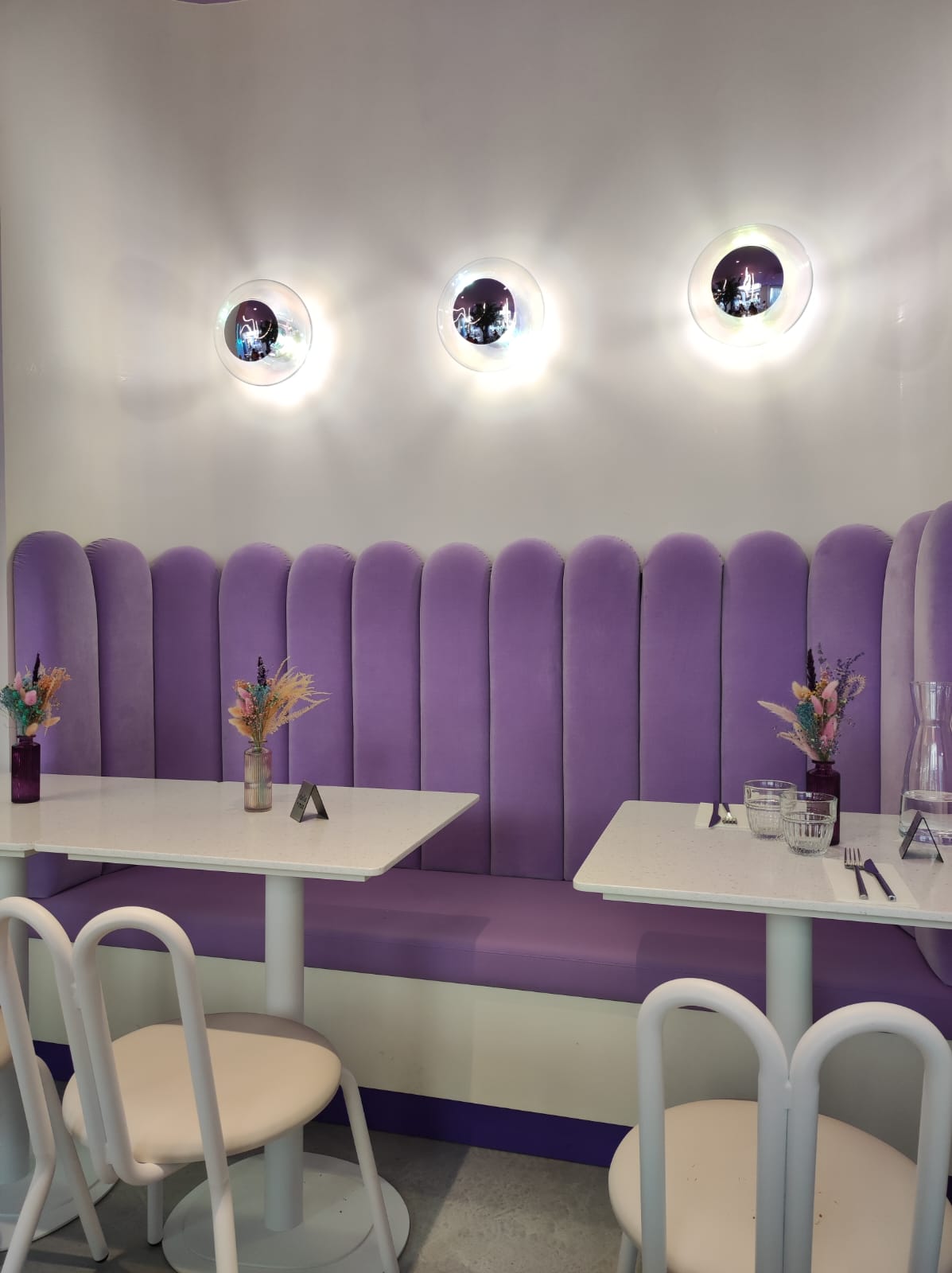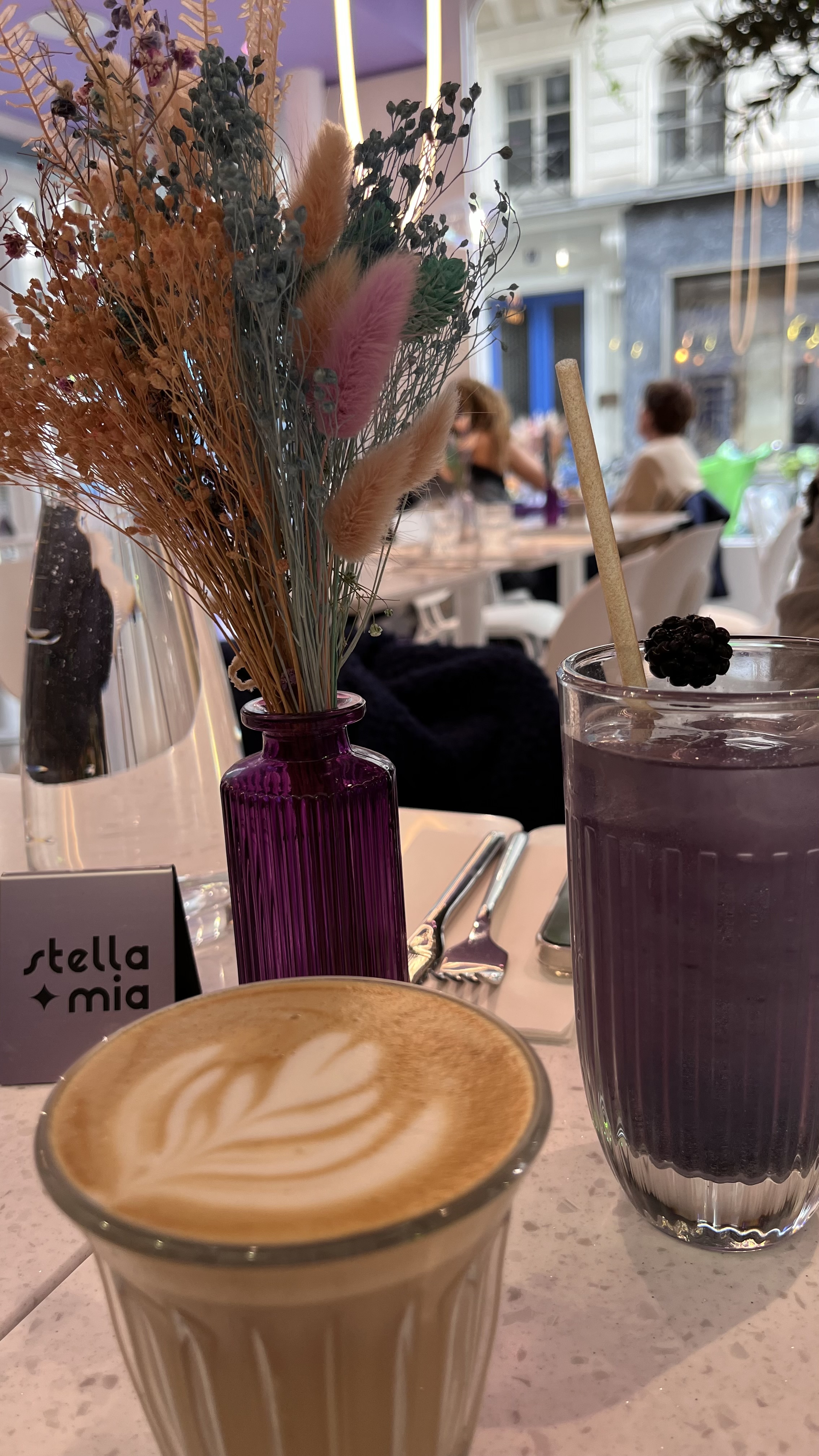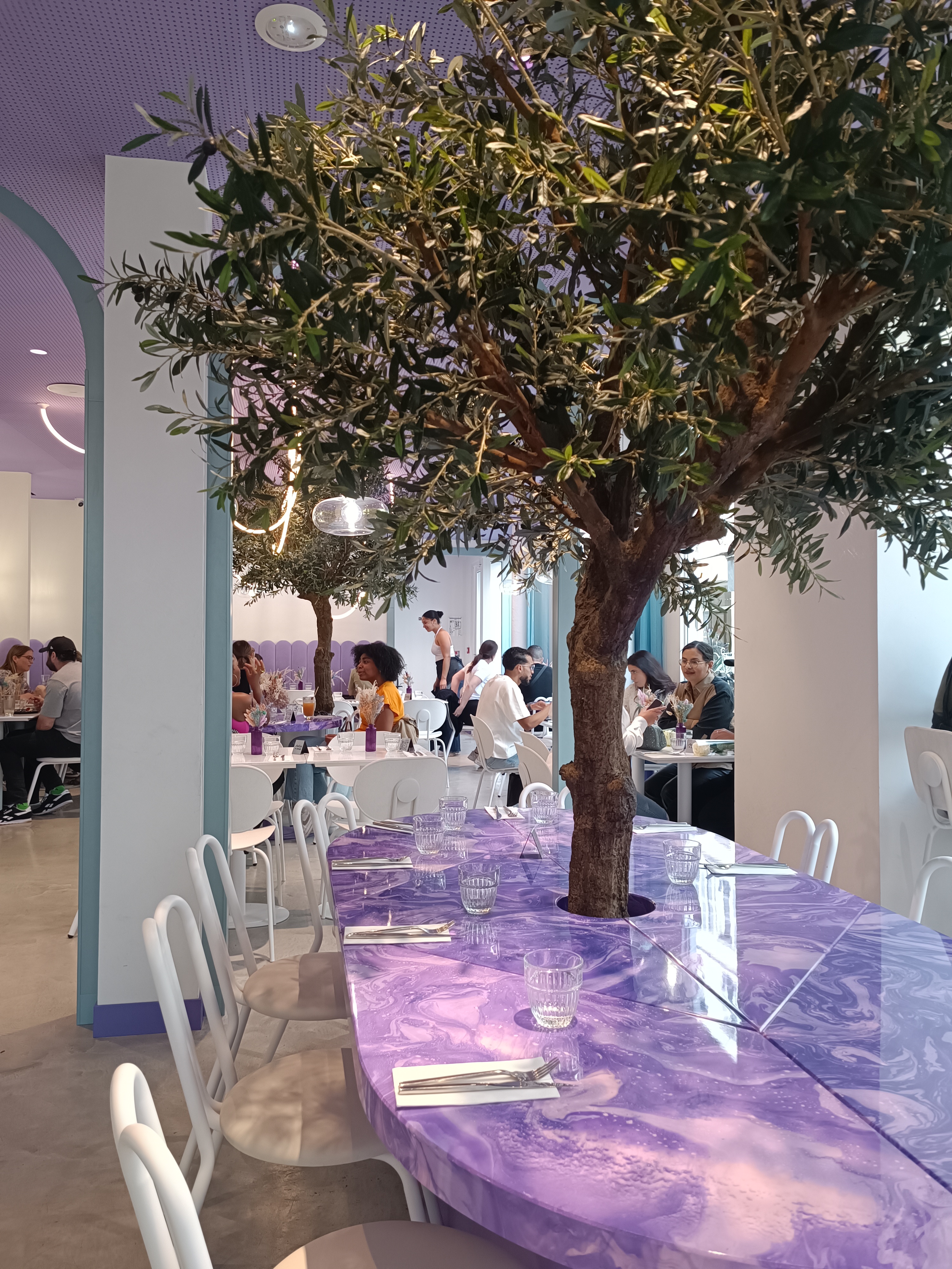 La nourriture était fantastique, nous avons pris un burger italien croustillant et un toast à l'avocat Nous n'avons pas pu finir les assiettes ! Les thés matcha sont délicieux aussi Les serveurs sont vraiment sympas et souriants, le service est globalement très bon Maintenant, si le violet est votre couleur, vous serez très heureux ! Les décorations sont magnifiques C'est digne d'un bon brunch !