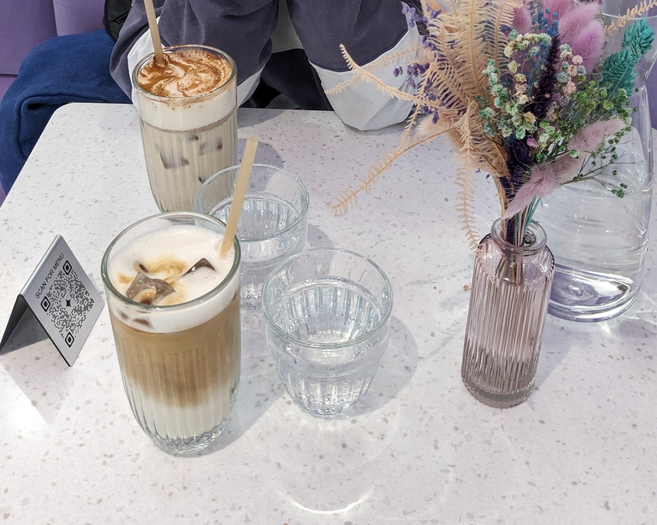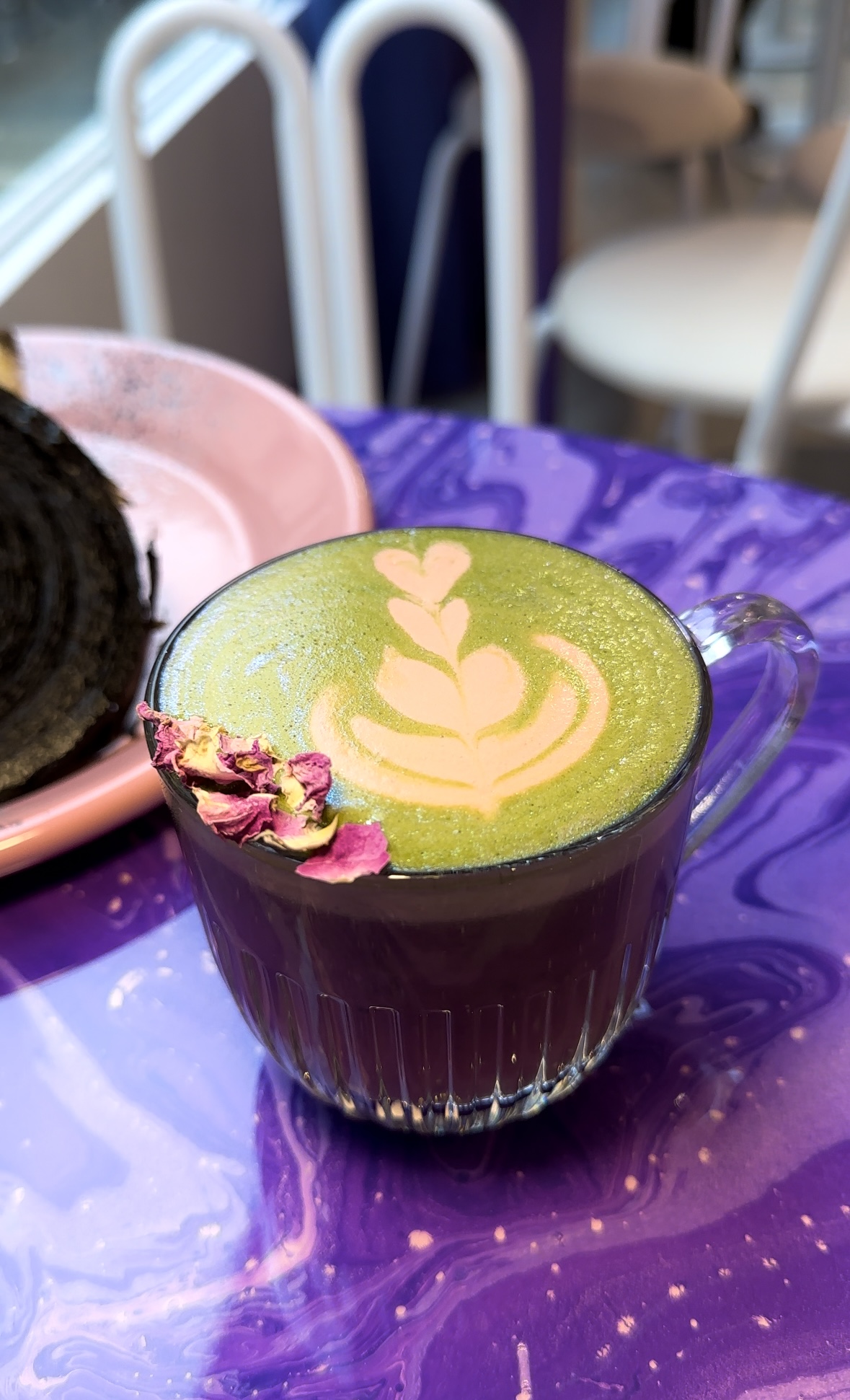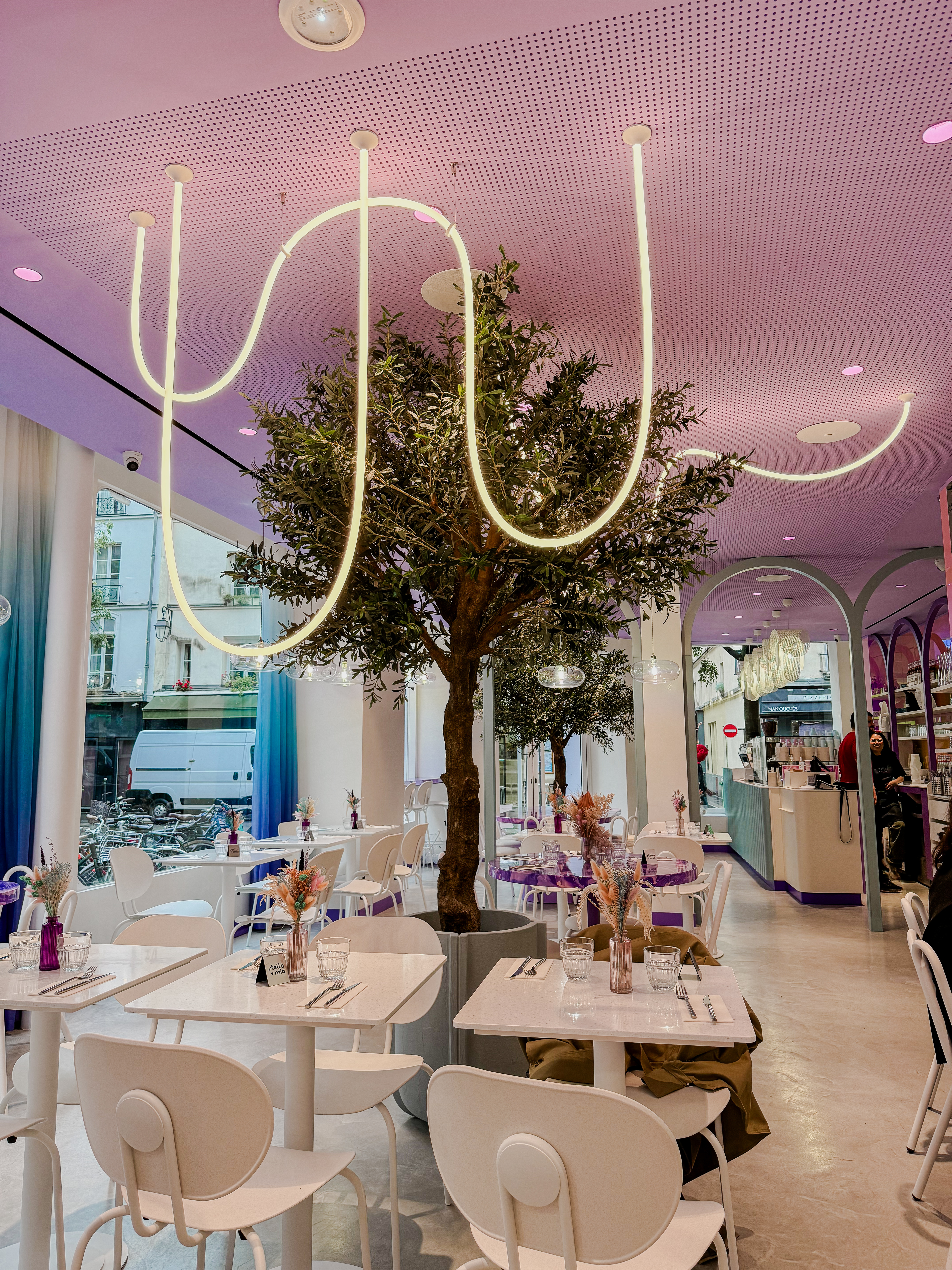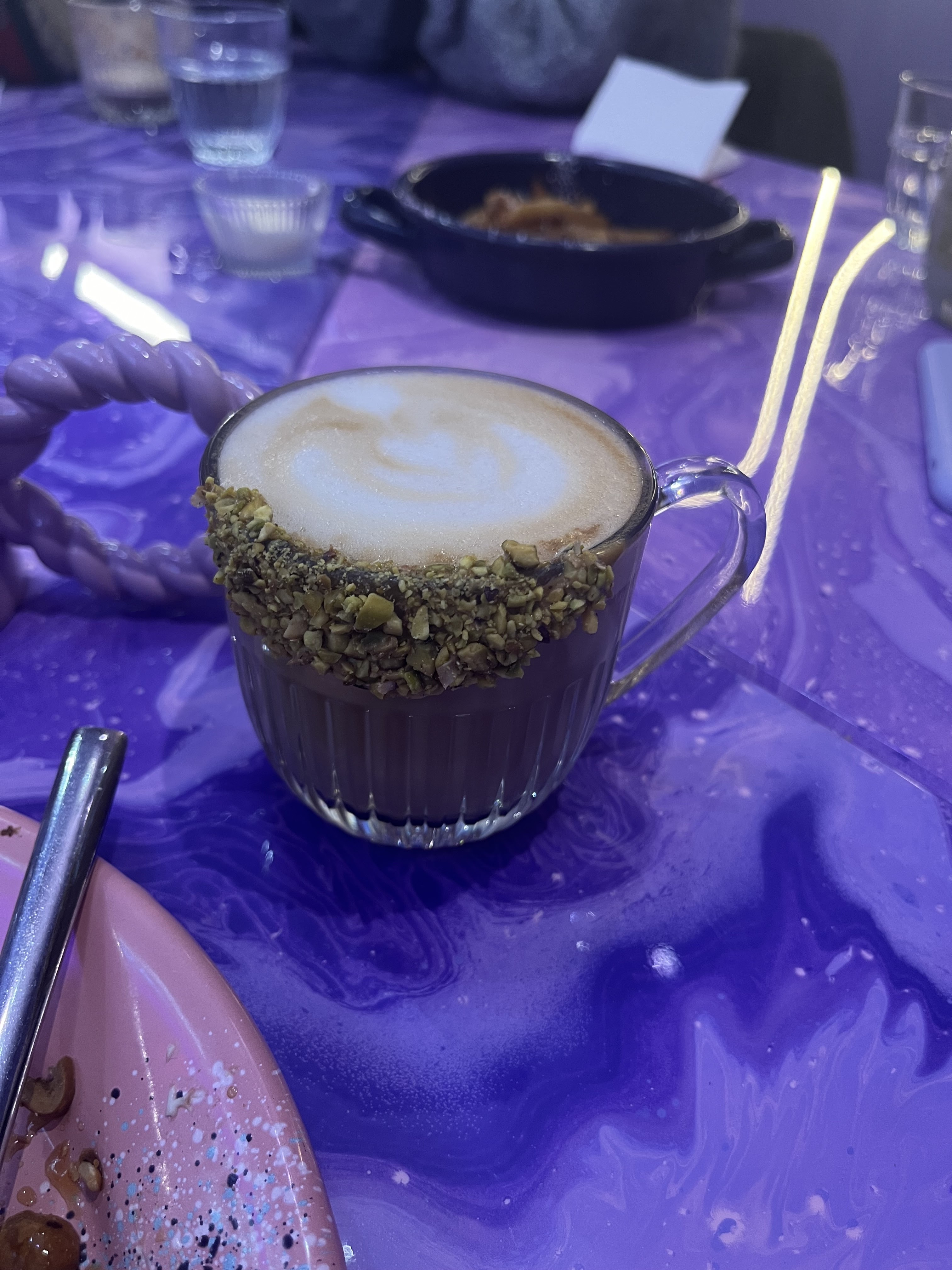 La nourriture était fantastique, nous avons pris un burger italien croustillant et un toast à l'avocat Nous n'avons pas pu finir les assiettes ! Les thés matcha sont délicieux aussi Les serveurs sont vraiment sympas et souriants, le service est globalement très bon Maintenant, si le violet est votre couleur, vous serez très heureux ! Les décorations sont magnifiques C'est digne d'un bon brunch !