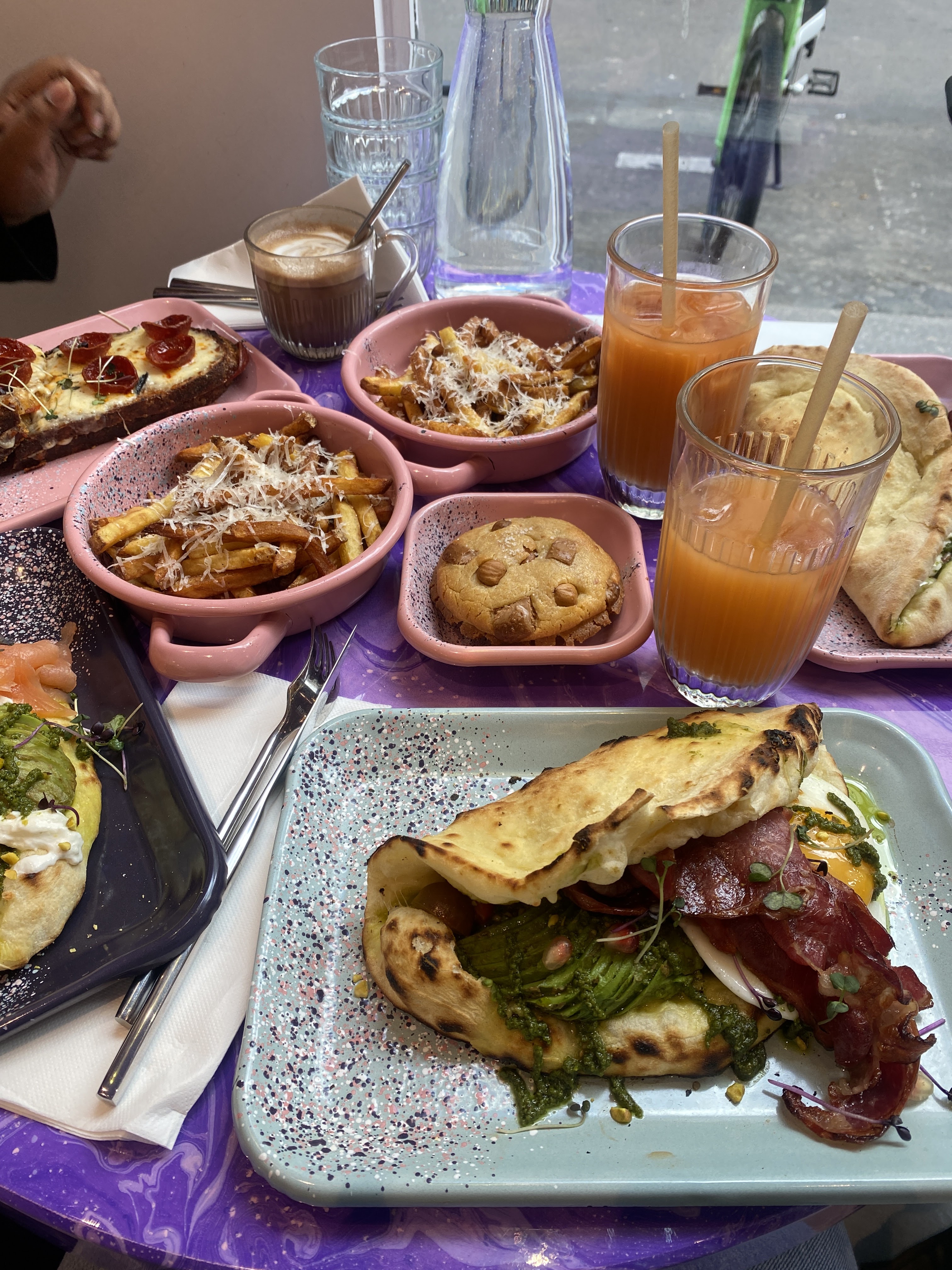 Concept original basé sur des brunchs tous les jours et toute la journée. La décoration violette du restaurant nous donne l'impression d'être dans le repère de barbie. Plats très bien présentés et savoureux. Les boissons sont excellentes. Le service était impeccable également. Une très belle découverte !