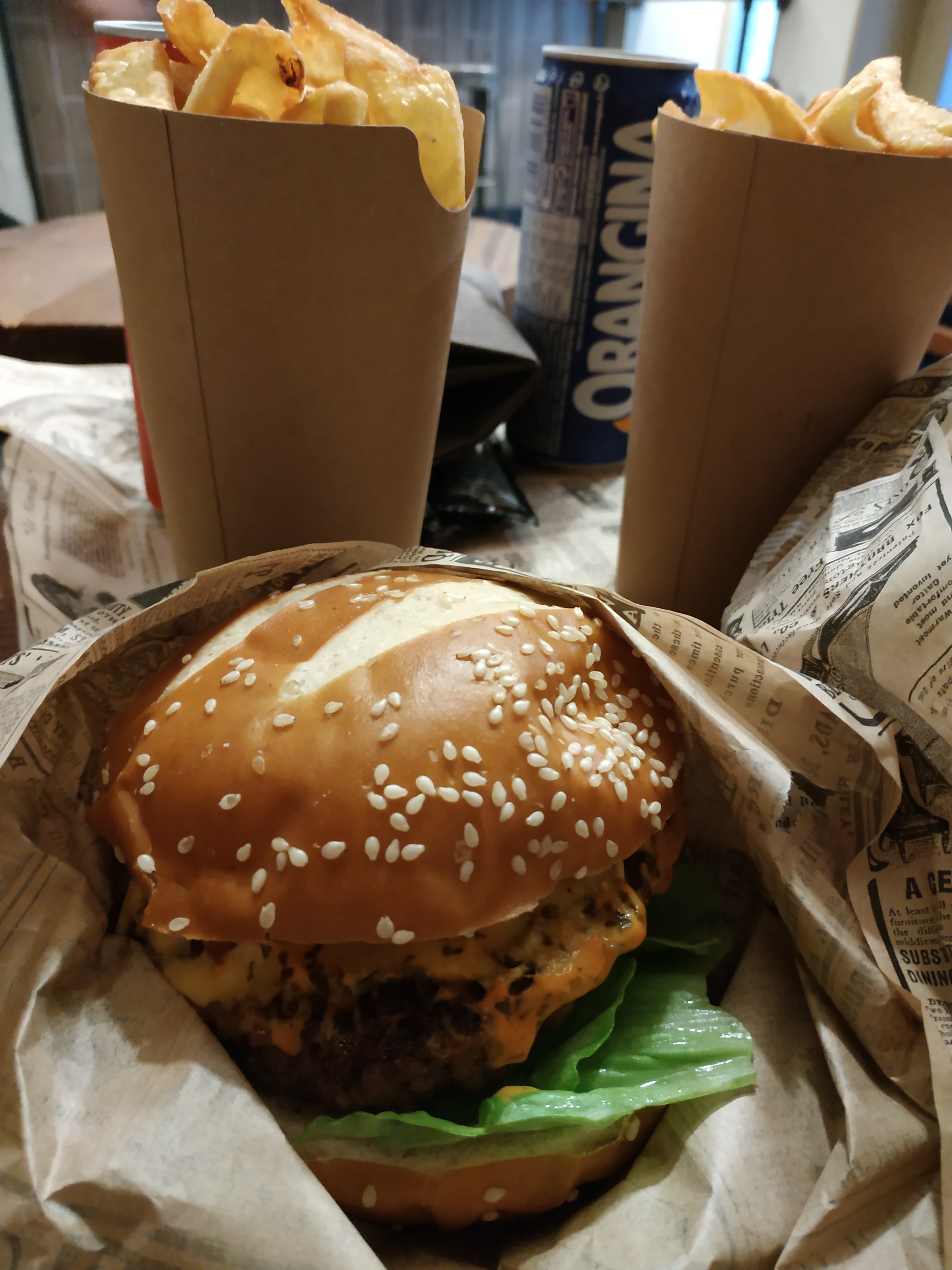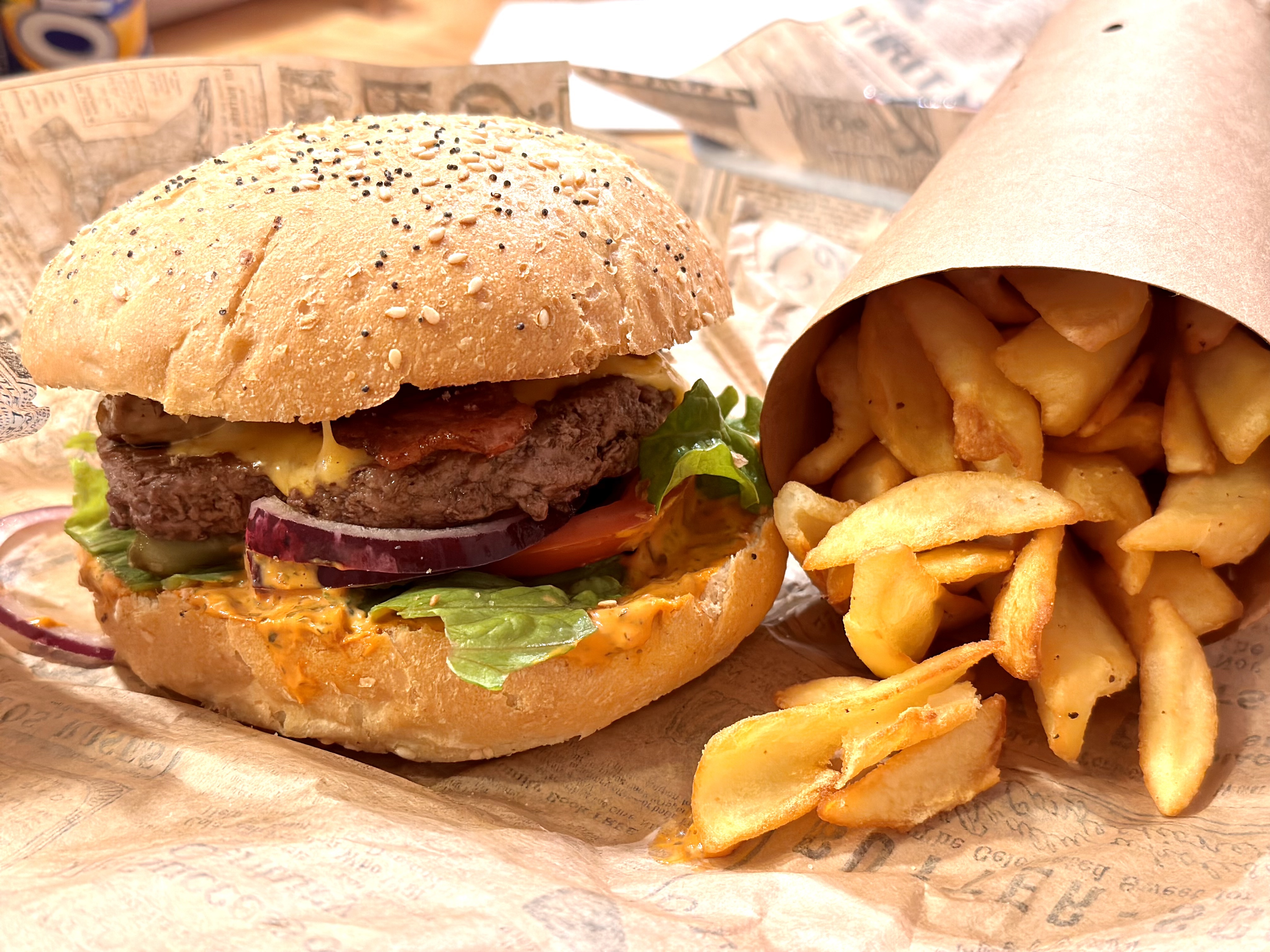 Super beau décor, le pain du burger bien moelleux, la sauce goûteuse et les frites délicieuses👍🏻