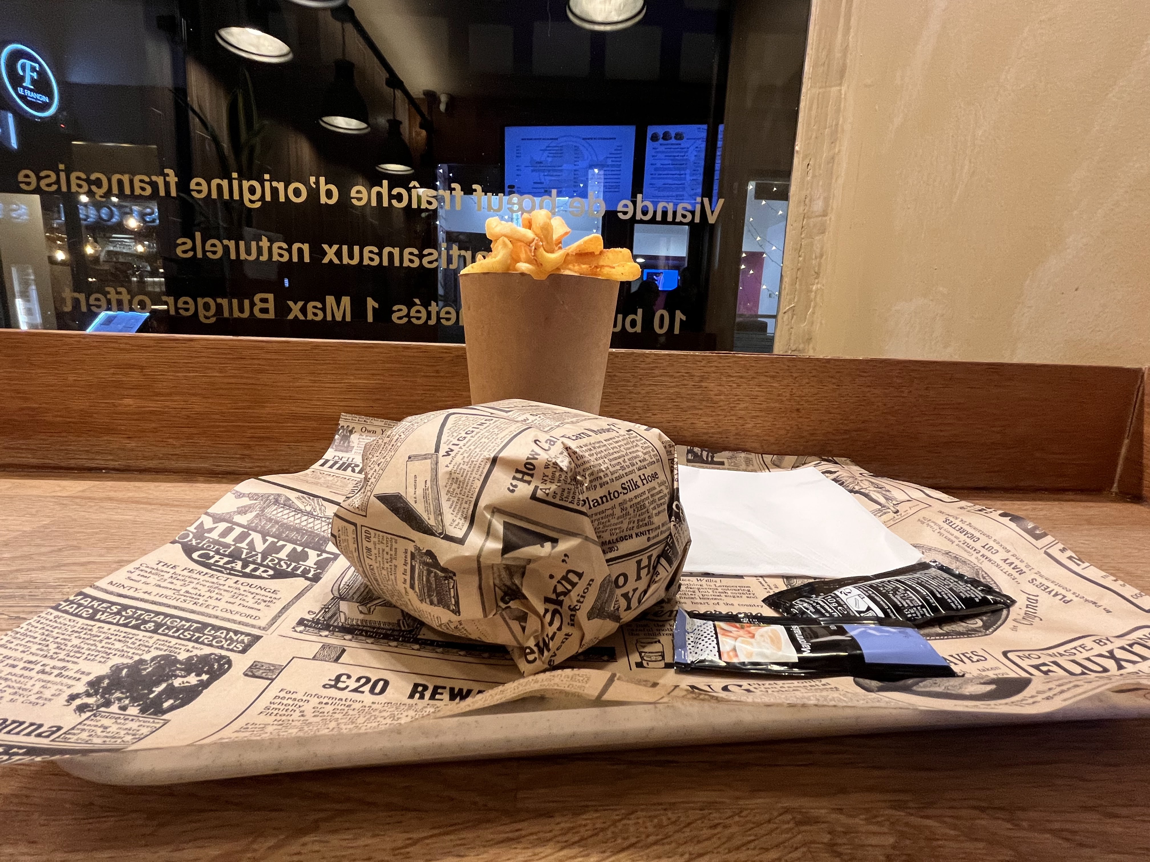 Intérieur boisé très jolie, personnel agréable, ce fut un plaisir d'aller chercher nos burgers en click & collect pendant ce confinement. Burgers excellents, surtout celui au comté ! (Avec un supplément bacon c'était encore meilleur). Je vous conseille réellement de penser à passer commande auprès de restaurants indépendants plutôt qu'au Mcdo ! En plus, pour quelques euros de plus seulement, la différence de qualité se ressent amplement.