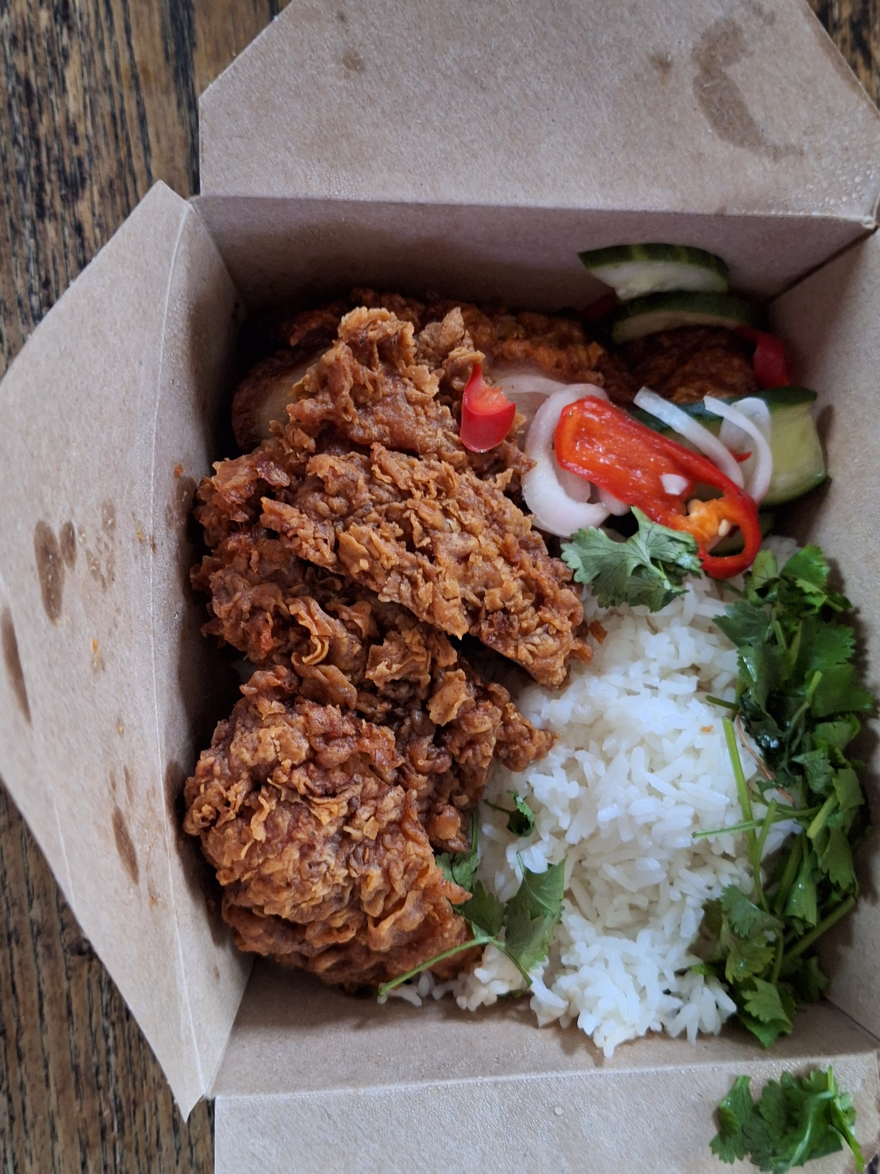 Le riz était trop cuit et collé ensemble. la panure de poulet frit est trop épaisse à notre goût
