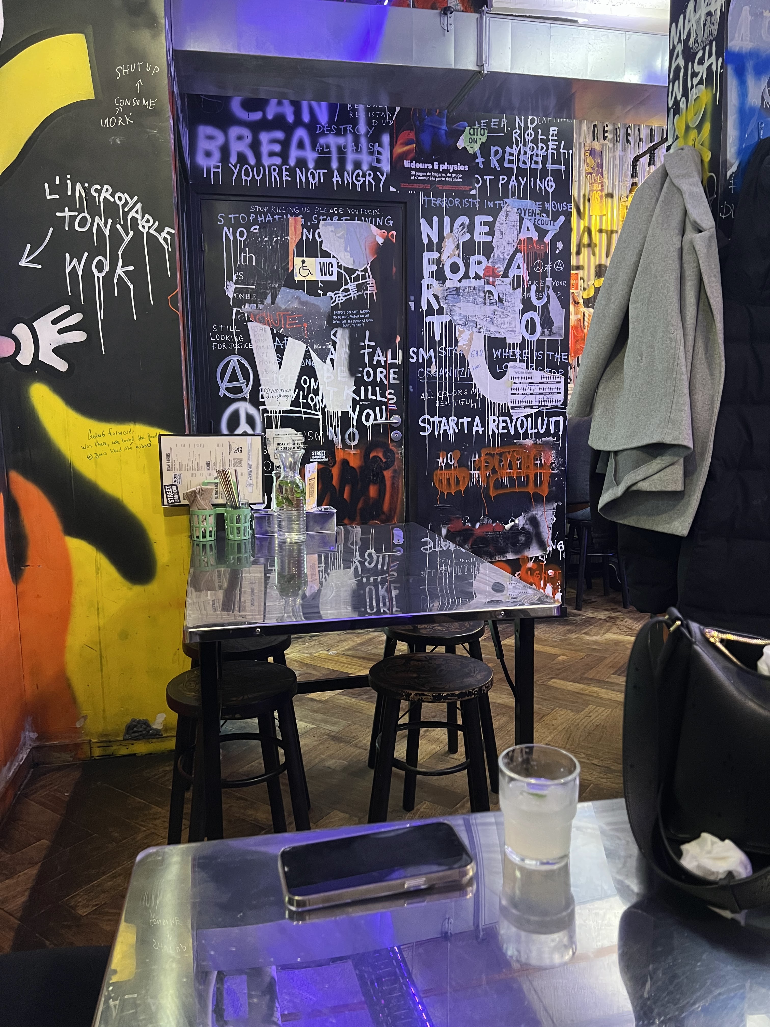Découverte lors de ma venue à Paris. Nous recherchions un endroit oû manger le soir avec mes 2 amies. Accueil très chaleureux, où les serveurs ont pris le temps de nous expliquer le fonctionnement. Un déco très Street, nous étions dans l'ambiance. De la music qui n'empêche pas de se parler. Le repas était délicieux ! Je me suis régalée, cuisine trees épicée pour ceux qui le souhaite. Une découverte culinaire. À améliorer : l'eau menthe ne sent pas assez la menthe et la lumière orange des WC est un peu étrange.