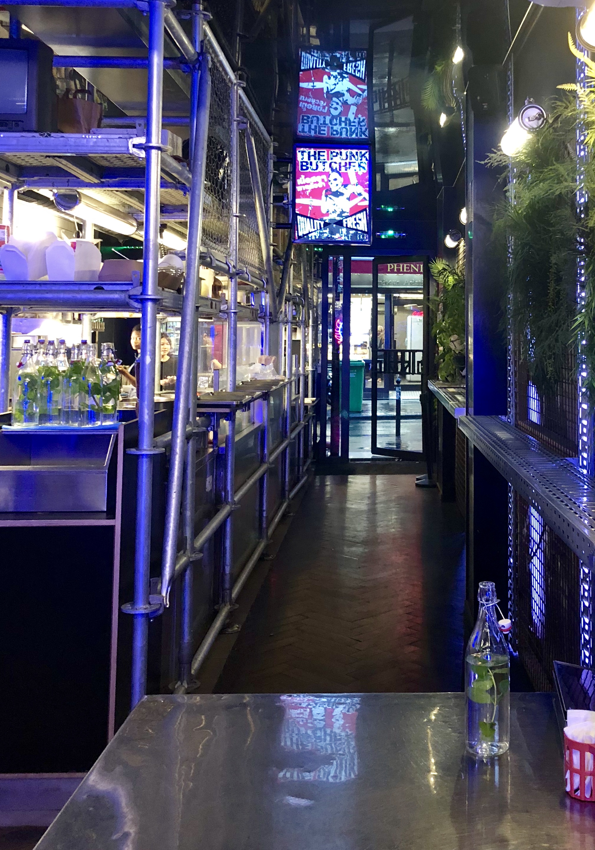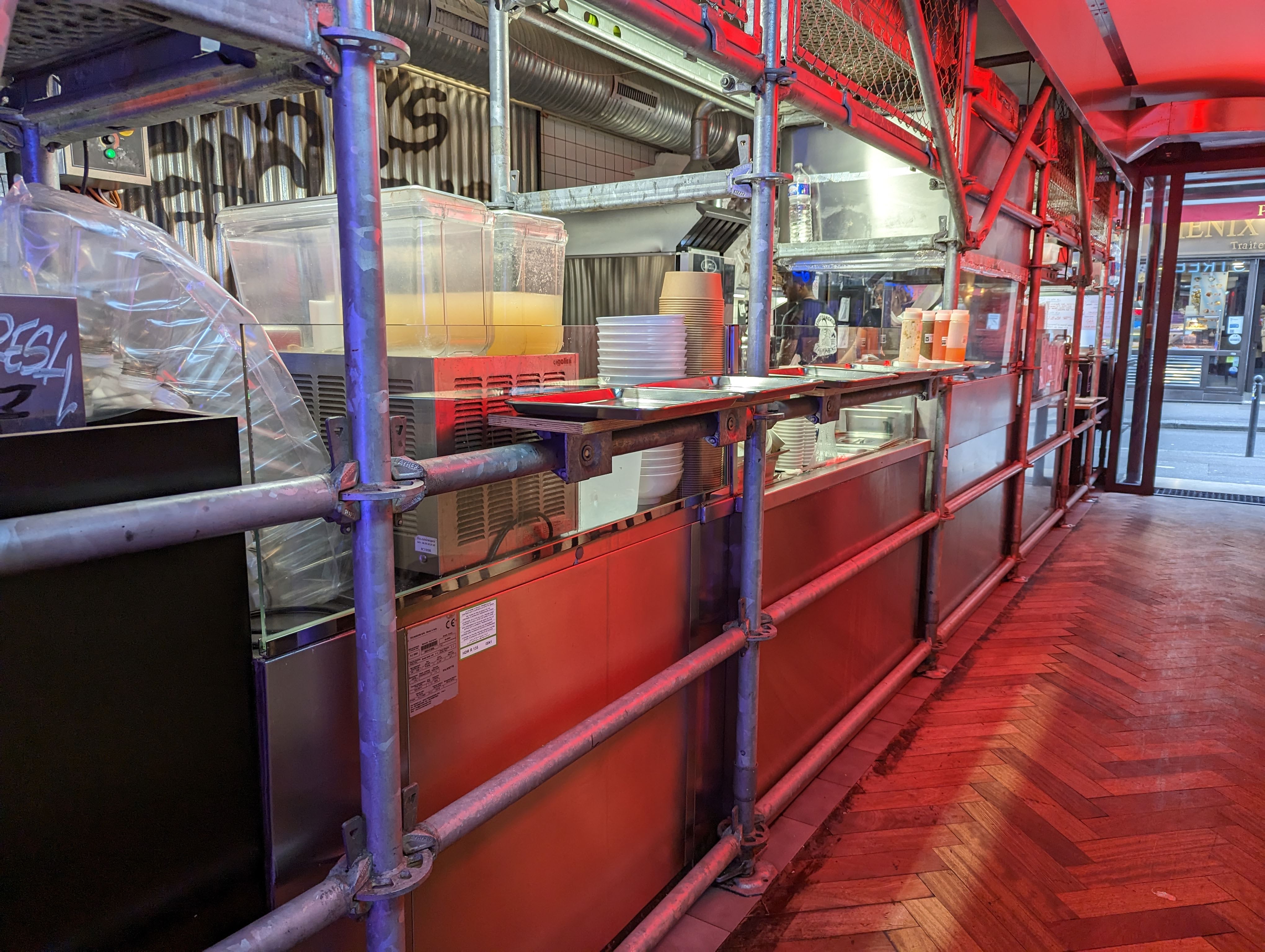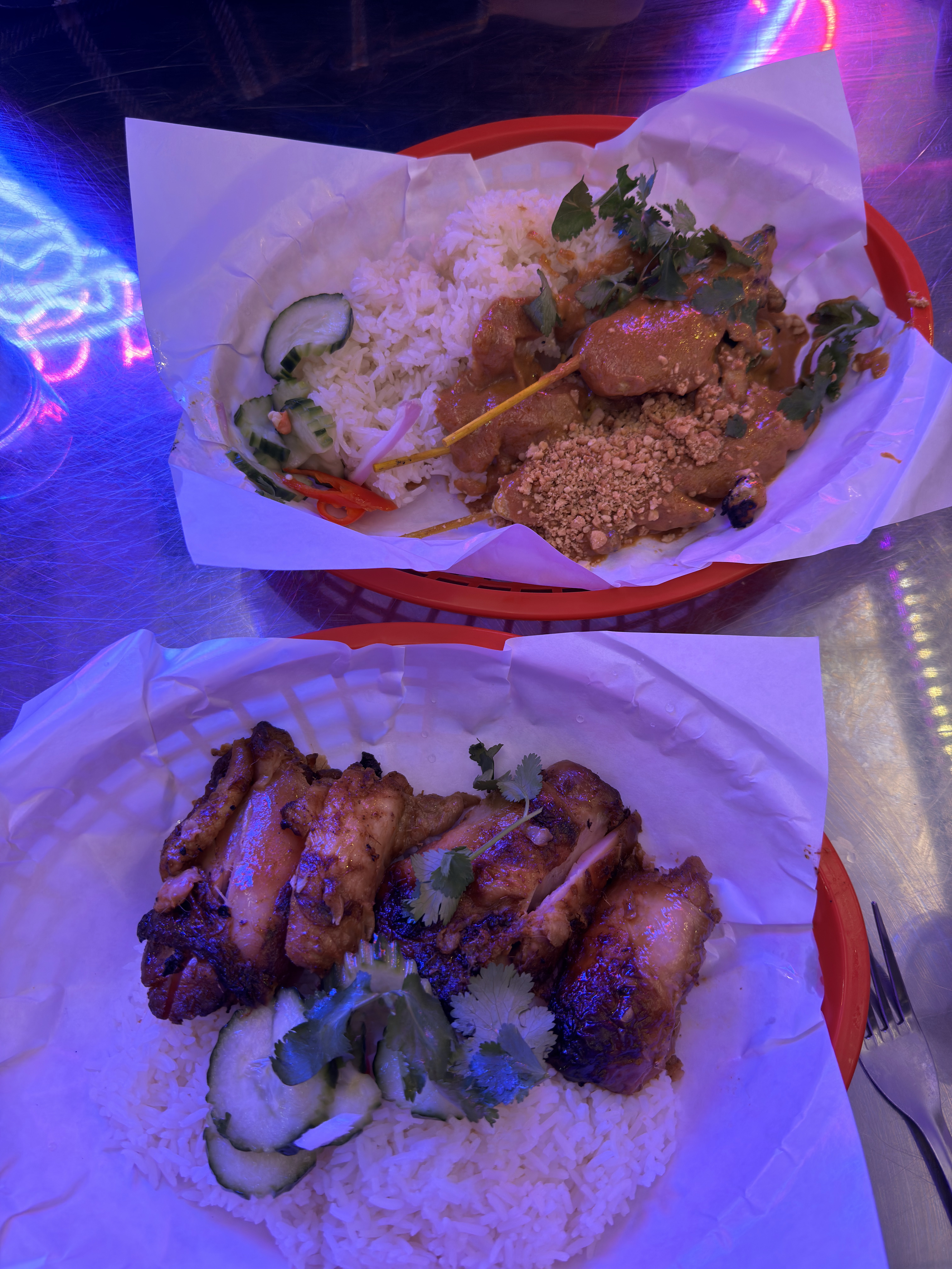 Petit resto thai occidentalisé qui a bien réussi son pari. La déco métallique en structure d'échafaudages, les néons colorés et les titres US qui ambiancent les lieux font plus penser aux boîtes de nuit de Pattaya ou de Patong qu'aux ruelles thaïes mais ça colle bien aux nuits parisiennes. La carte est toute simple et c'est sûrement ce qui fait son succès. Pas une liste d'innombrable menus mais 3 formules à composer parmi 3 plats froids et 6 plats chauds (+ 2 ou 3 compléments). Plutôt astucieux et permet au staff de se spécialiser uniquement dans ces 9 plats. La préparation et le service sont donc plus rapides. Le boeuf (en salade) est top. C'est carrément une salade de boeuf lao mais avec lamelles de boeuf et non boeuf haché. Elle est piquante comme j'aime mais sûrement trop piquante pour un palais non initié au piment. Les saucisses Issan sont très bonnes et juteuses mais elles sont minuscules. On dirait 4 boulettes. Les morceaux de poulets saupoudrés d'ails grillés sont délicieux et le bouillon qui l'accompagne ouvre l'appétit. Les plats n'ont rien à envier à ceux du 13ème. Vraiment un lieu atypique pour manger thai dans une ambiance de boîte de nuit. Même les toilettes uniques (H/F + lavabo + papier essuie-main) sont éclairées au néon rose. Elles semblent assez larges pour y accéder en fauteuil roulant. Toutefois, un peu bruyant et victime de son succès aux heures de rush. Profitez plutôt des heures creuses pour pouvoir y manger et discuter plus tranquillement. Bonne découverte à tous.