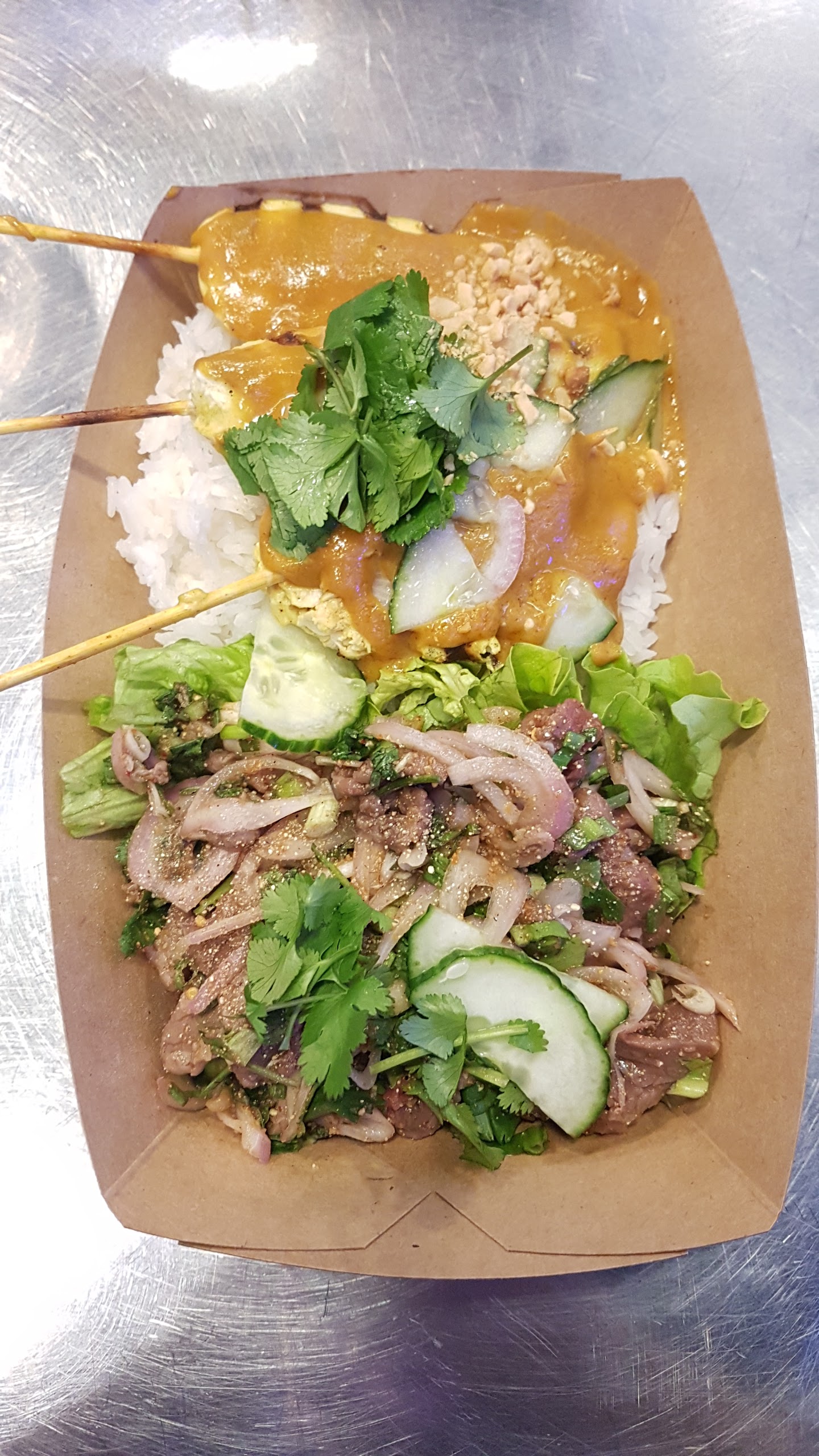 De la street food thaï savoureuse et bien présentée. Les brochettes de poulet sont toujours une tuerie. Un super rapport qualité prix. Reste à améliorer uniquement la propreté du resto et ajouter des options végétariennes.