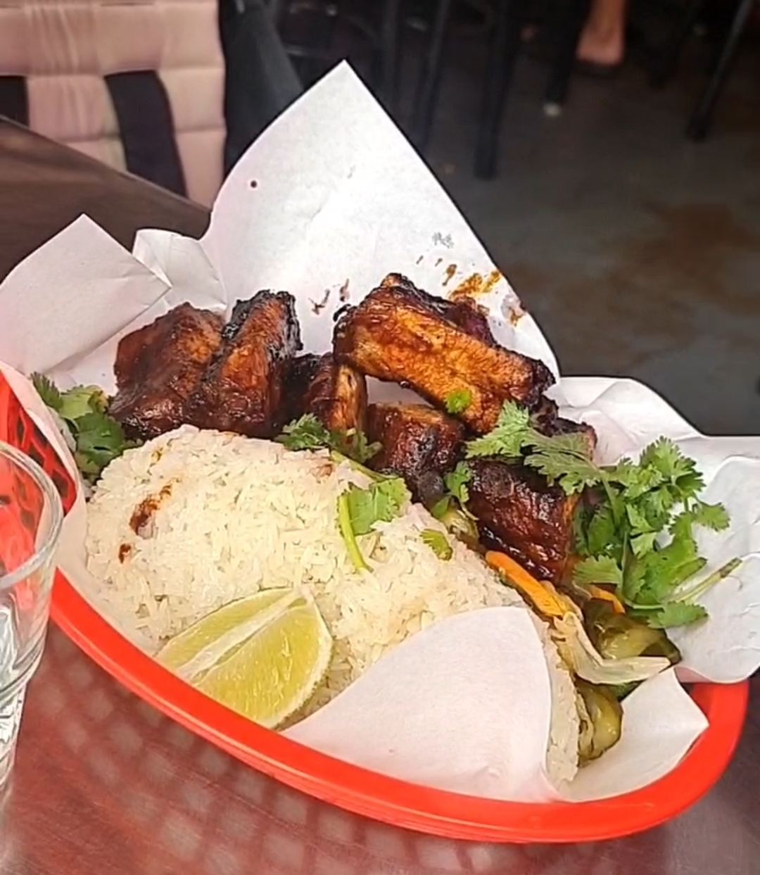 Je suis un peu mitigée sur ce restaurant, le cadre est sympa, mais le fait que ce lieu ressemble à une cantine ou un stand de street food ne justifie pas que les tables ne doivent pas etre nettoyées. Notre table et la carte étaient sales (liquide, résidus alimentaires...). Les prix affichés sont sincèrement élevés pour ce genre de service et pour les portions servies. Nous avions faim en sortant du restaurant. Dans les points positifs, repas avec beaucoup de saveurs, servis très rapidement.