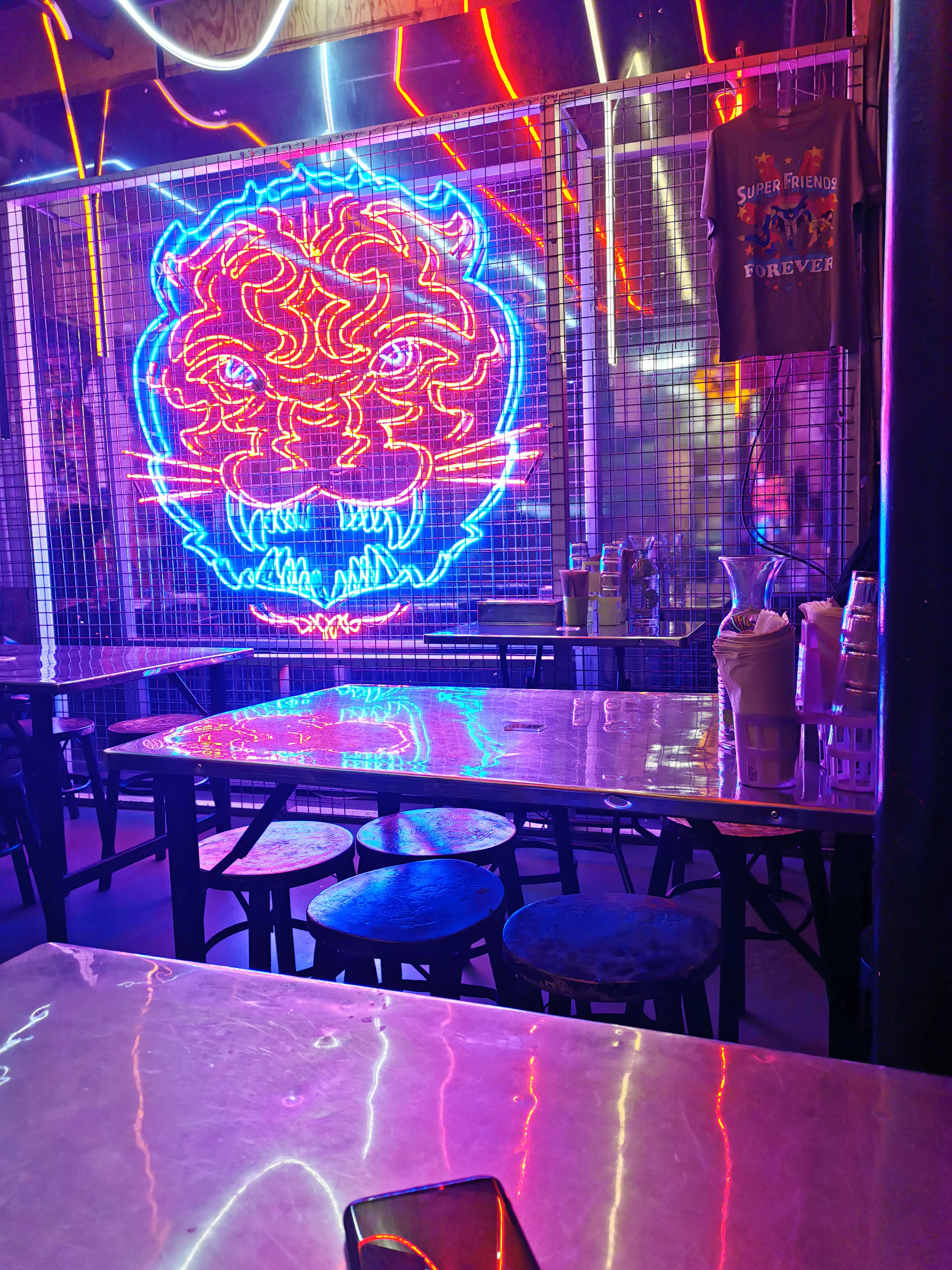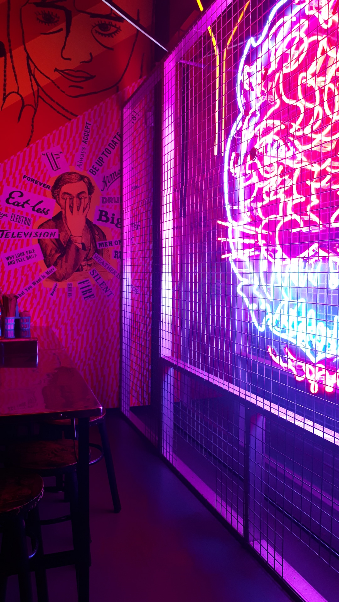 Lieu : Canon, tout est pensé (tuyaux apparent, néons rouge du mur au plafond, graff assez sobre sur les murs, table façon métal, grillage, cuisine apparente, ..) La team : chaleureuse & accueillante La carte : originale, large choix et c'est excellent !! 🔥attention prendre au sérieux les petits 🌶 sur la carte !
