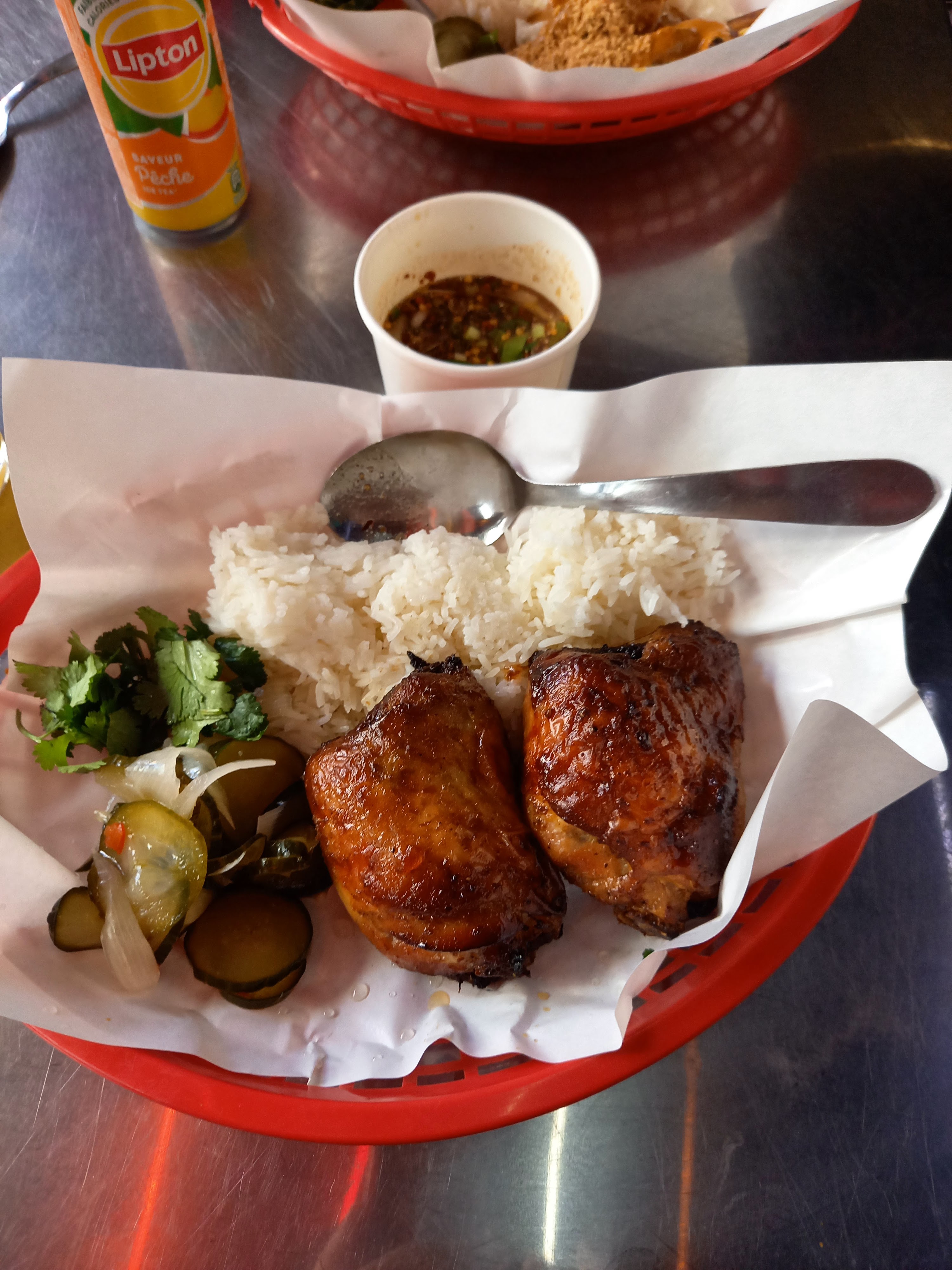 L’odeur en entrant mets déjà en appétit. Le cadre est très cool avec les petits tables en inox comme en Thaïlande. Ne manquez pas la citronnade ! Pour les plats, c’était très bon, plein de goût, et rassasiant. Juste un peu trop de sauce à mon goût pour le poulet.