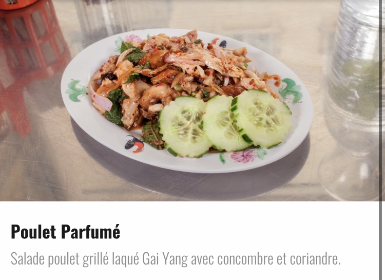J'ai testé le pad Thai au poulet que j'ai beaucoup aimé et qui est très copieux. Poulet tendre et parfumé. J'aurai aimé que cela soit un peu plus épicée mais tout de même très bon ! Le porc croustillant est excellent avec la sauce Satay. J'essaie de trouver cette sauce sur le marché mais pas trouvé... En puis, un avis positif = dessert mango sticky Rice offert :) Dommage je n'avais plus de place. Peut être une prochaine fois !